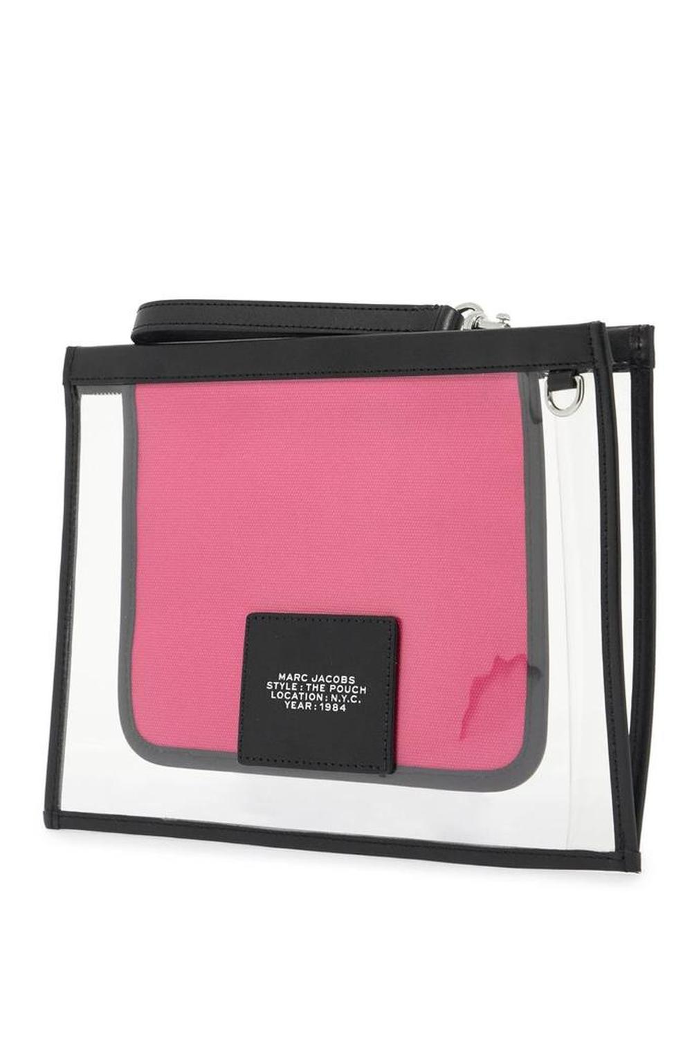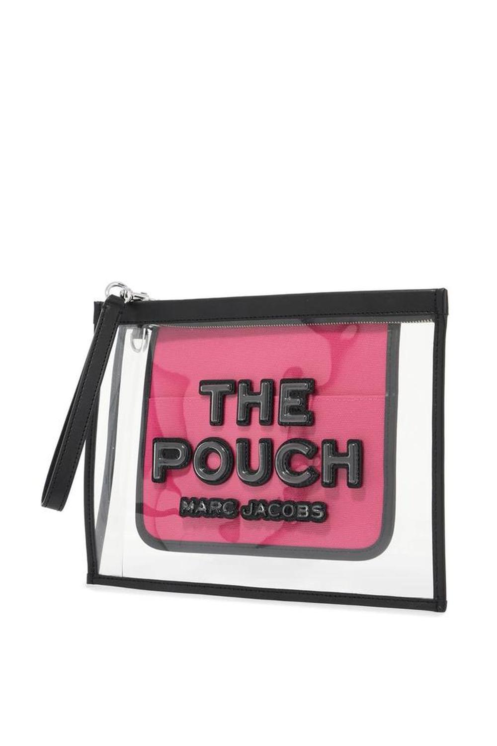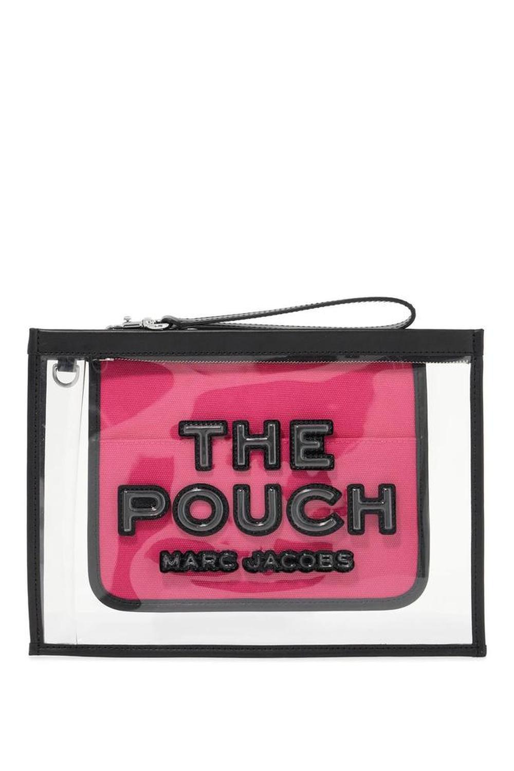 • This Marc Jacobs pouch is made of transparent PVC with three-dimensional logo lettering in contrasting colors. It features a zip closure, an interior open pocket in contrasting fabric, and a removable wrist strap. The metallic accessories have a steel finish.