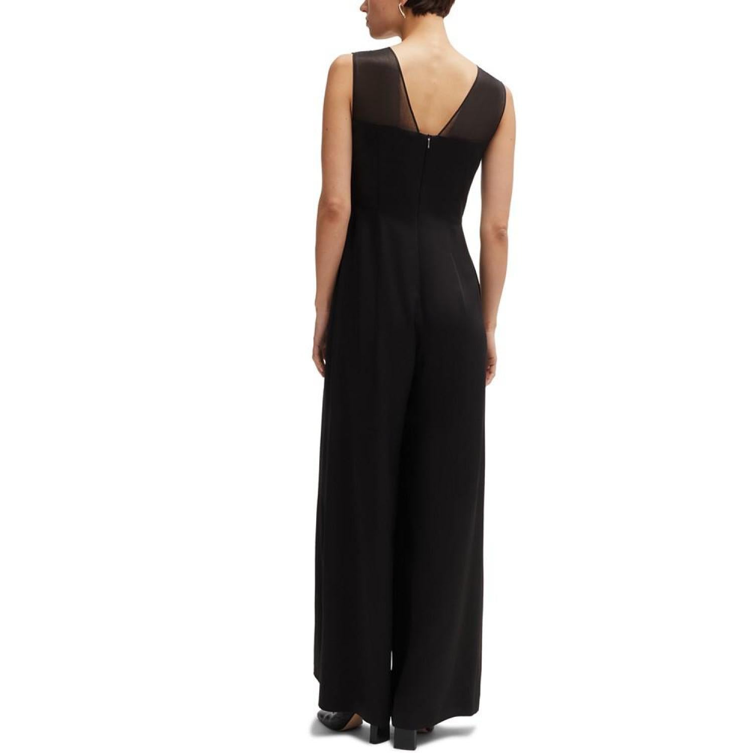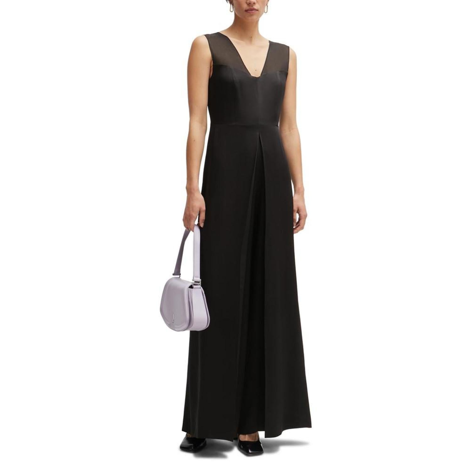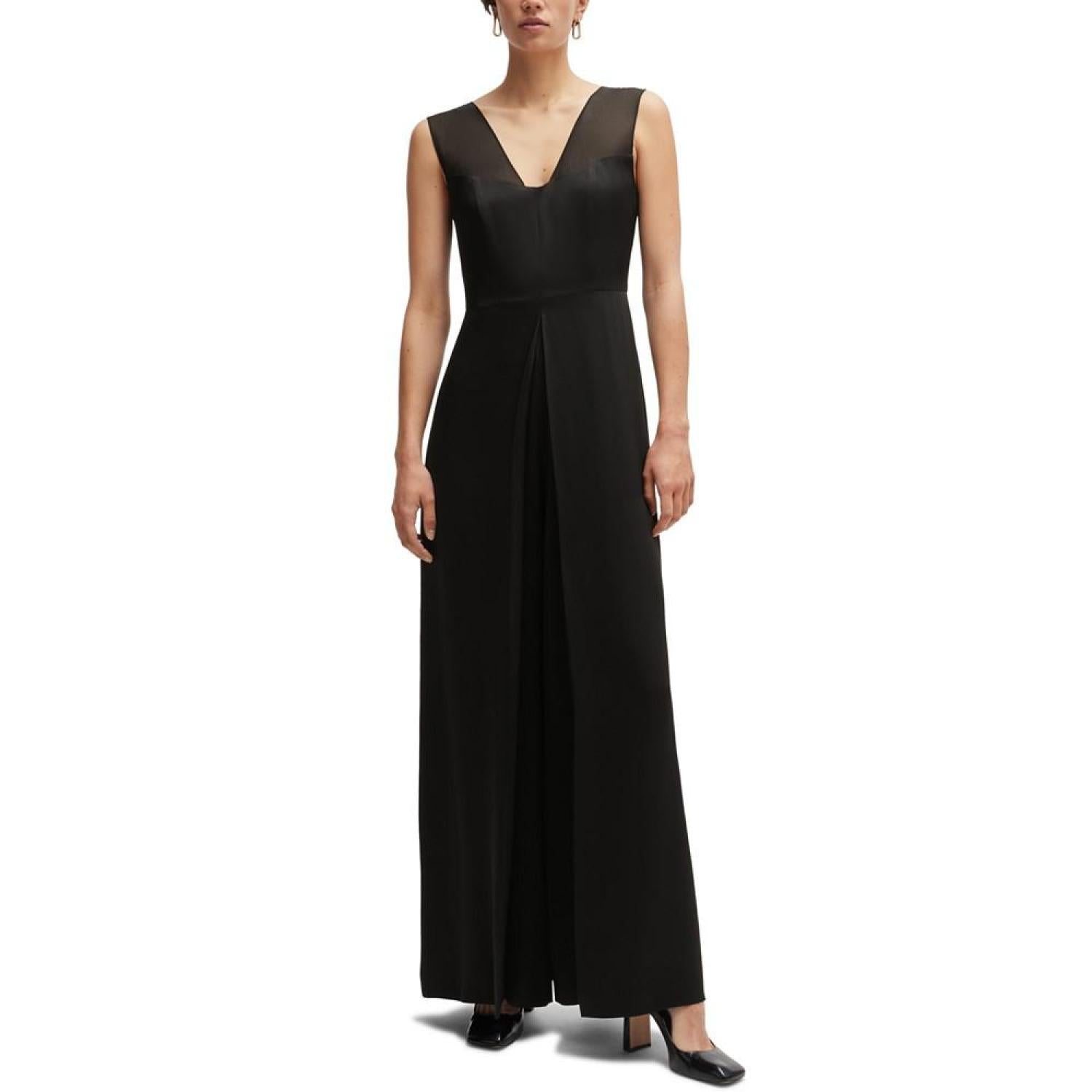 An elegant jumpsuit by BOSS Womenswear. Crafted in a mix of materials with a lustrous finish, this design features a layered effect on the legs. The model is a size 36 and is 5'11" tall, with a 24" waist and 35" hips. Regular fit Neckline: V-Neck Fastening top: Zip closure Sleeveless Partially lined Acetate / Viscose Spot clean Imported