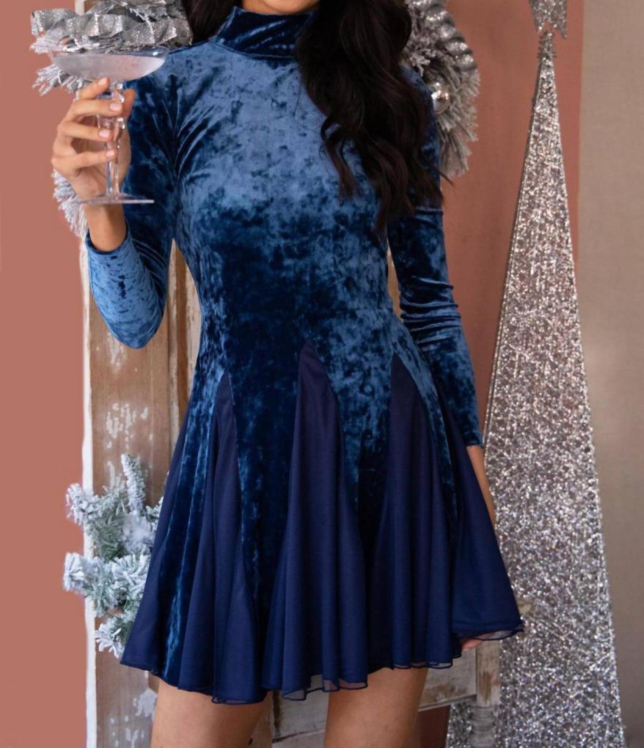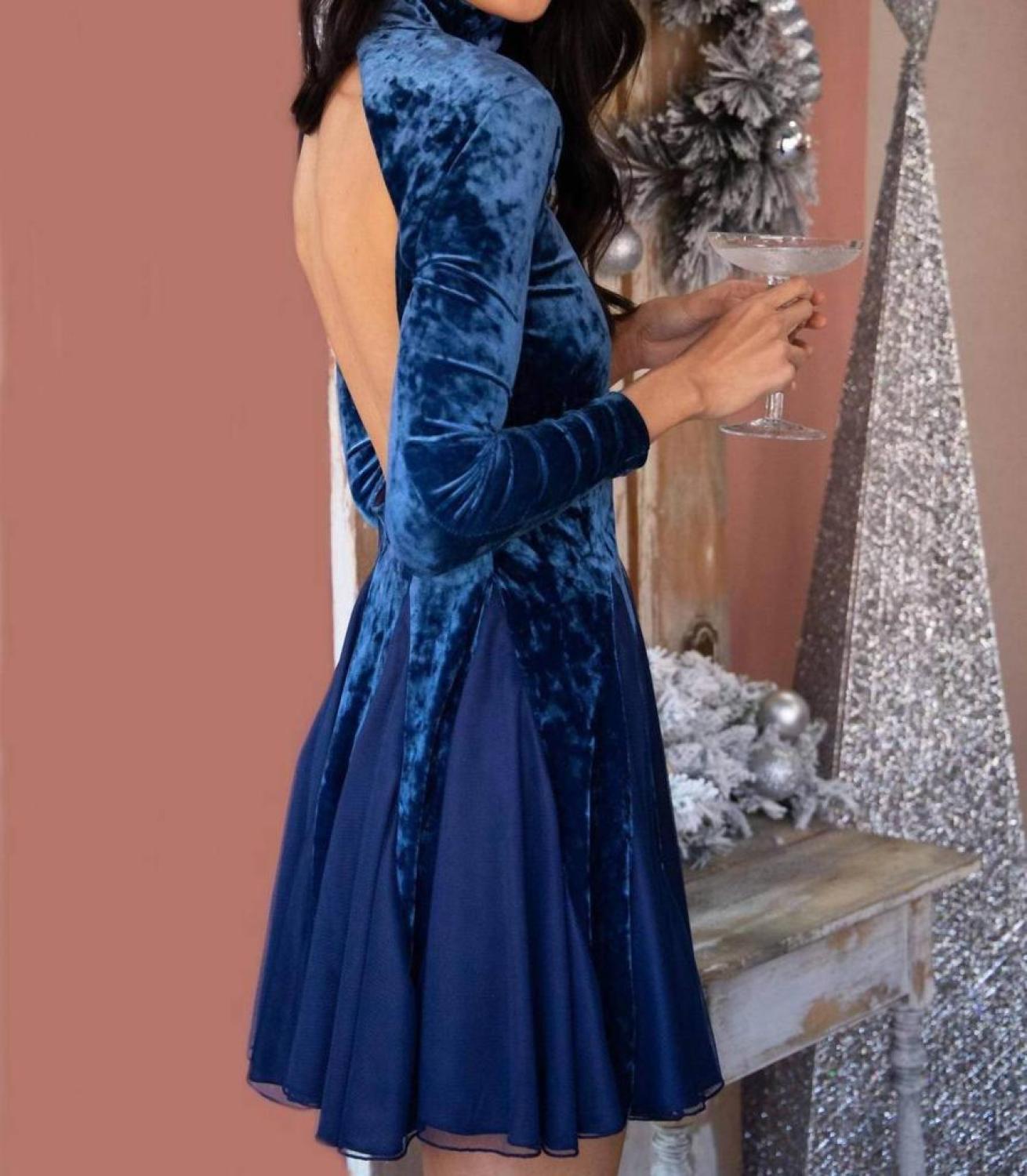 An unexpected twist on a classic style dress. In cooler weather, throw on your favorite blazer for a more sophisticated look.Bring sexy back this season with this mock neck and open-back velvet fit and flare dress with adorable gaudet skirt details. Long sleeves Body-conscious silhouette Mock neck with back pearl button closure Mini length Fully lined 100% Polyester; Lining - 100% Polyester Dry clean only Made in USA