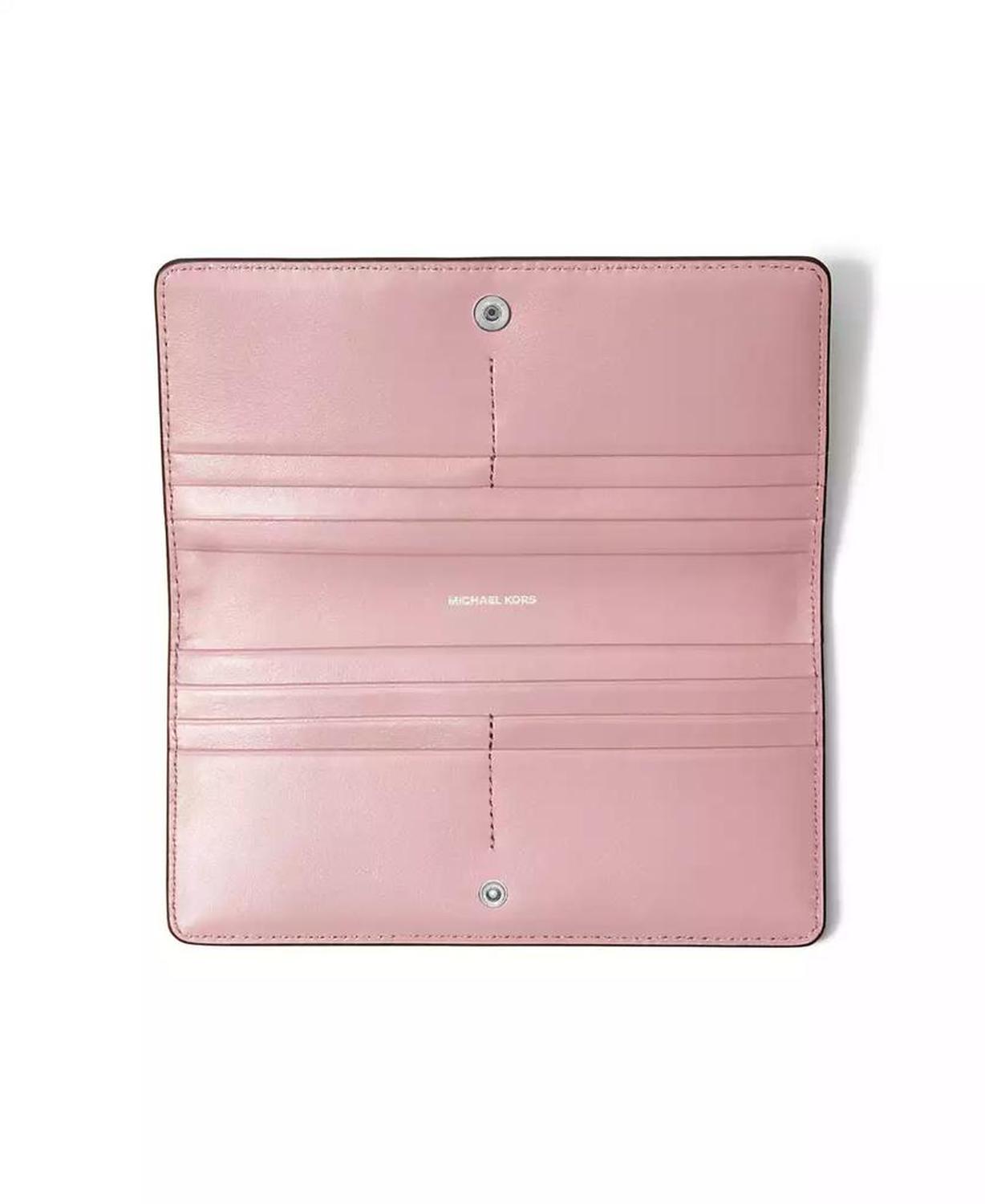 Realized in leather with an array of features, this wallet by MICHAEL Michael Kors makes organization effortless. 7-1/2"W x 4"H; 0.46 lbs. approx. weight Snap closure Gold-tone hardware & logo plaque, exterior back zip pocket, interior bill compartments & 12 card slots, Leather; lining: polyester Spot clean Imported