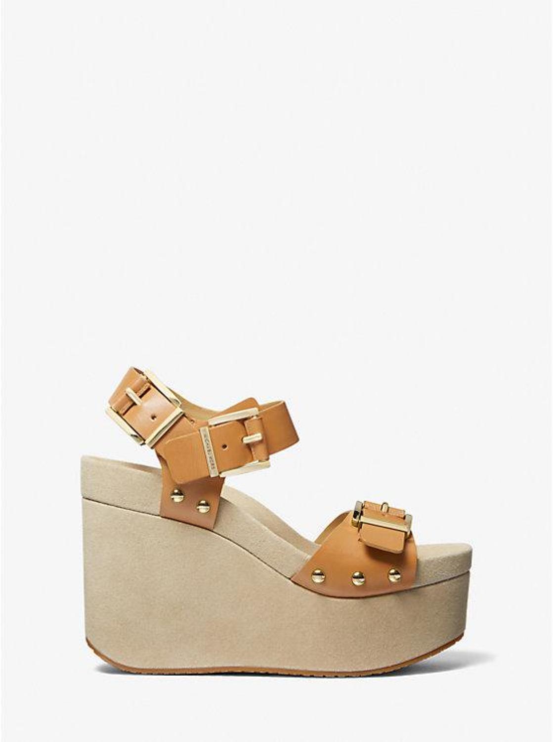 • The Colby wedge sandal is detailed with gold-tone buckles and matching studs that provide a bohemian chic sensibility. It’s designed with smooth, thick straps and features a suede-wrapped wedge heel that accentuates the leg. Wear them with the coordinating shoulder bag for a dramatic pairing.