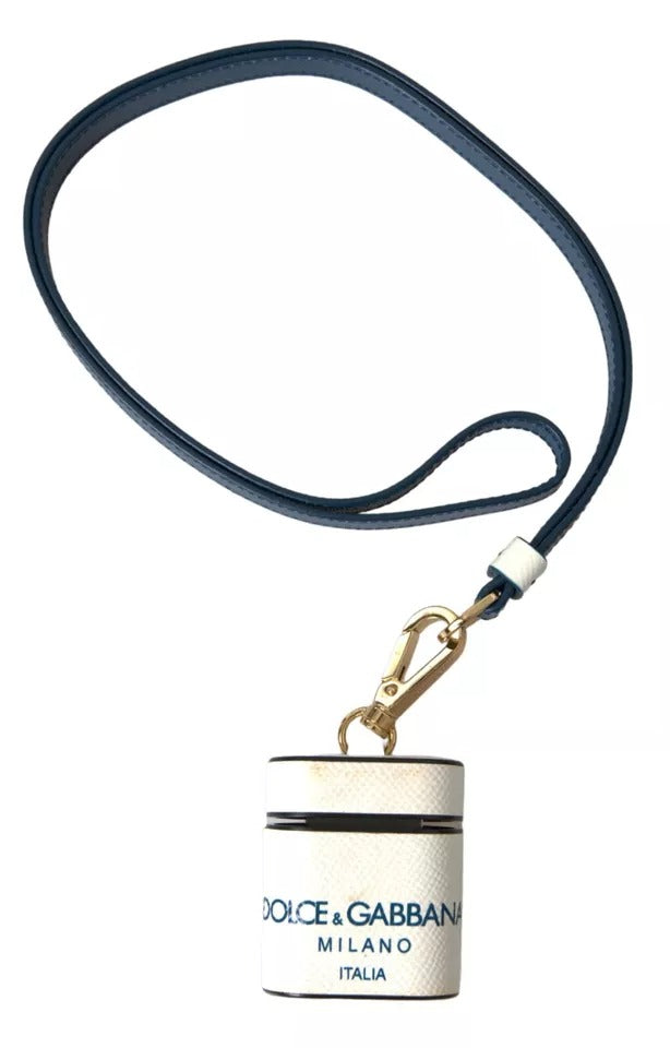 Dolce & Gabbana White Blue Calf Leather Logo Print Strap Airpods Case