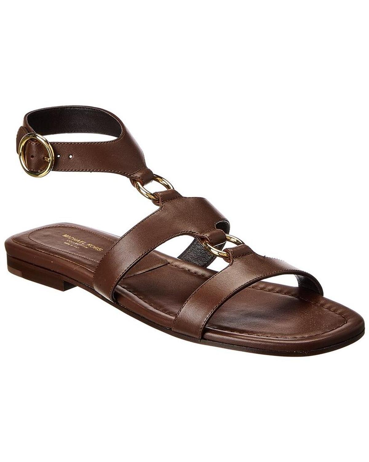 Introducing the Michael Kors Collection Dusty Leather Sandal, a luxurious and glamorous addition to your wardrobe. Crafted in nutmeg leather with gold-tone hardware and ring accents, these sandals exude sophistication and style. The adjustable ankle strap with buckle closure ensures a secure and comfortable fit, while the lightly padded leather insole provides all-day comfort. Made in Italy with exquisite craftsmanship, these sandals are perfect for adding a touch of All-American elegance to any outfit. Please note that size selections are European, for US conversions please refer to the size chart. Elevate your look with the Michael Kors Collection Dusty Leather Sandal today.