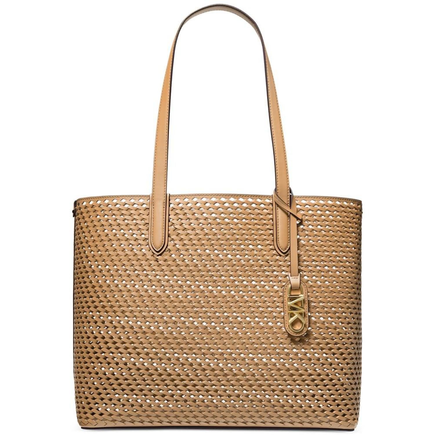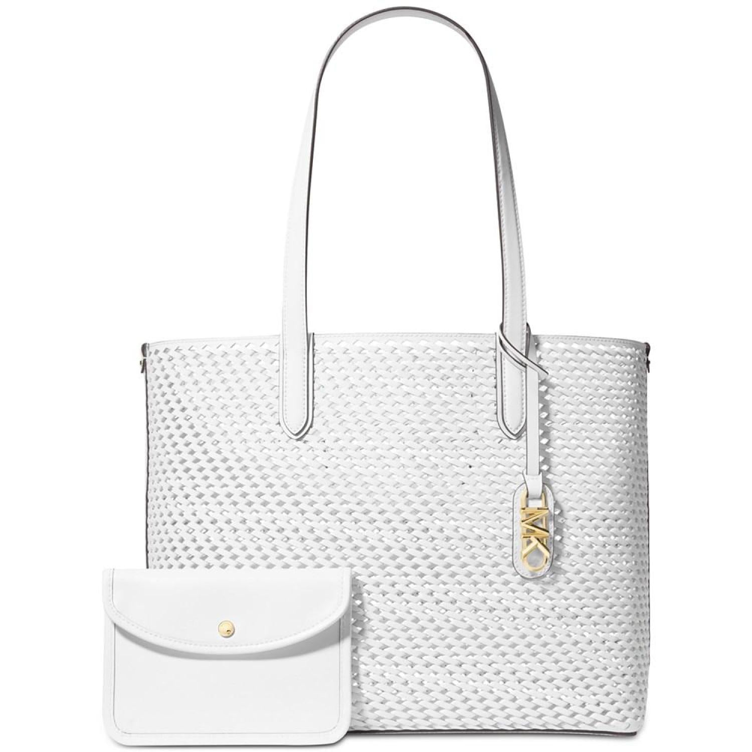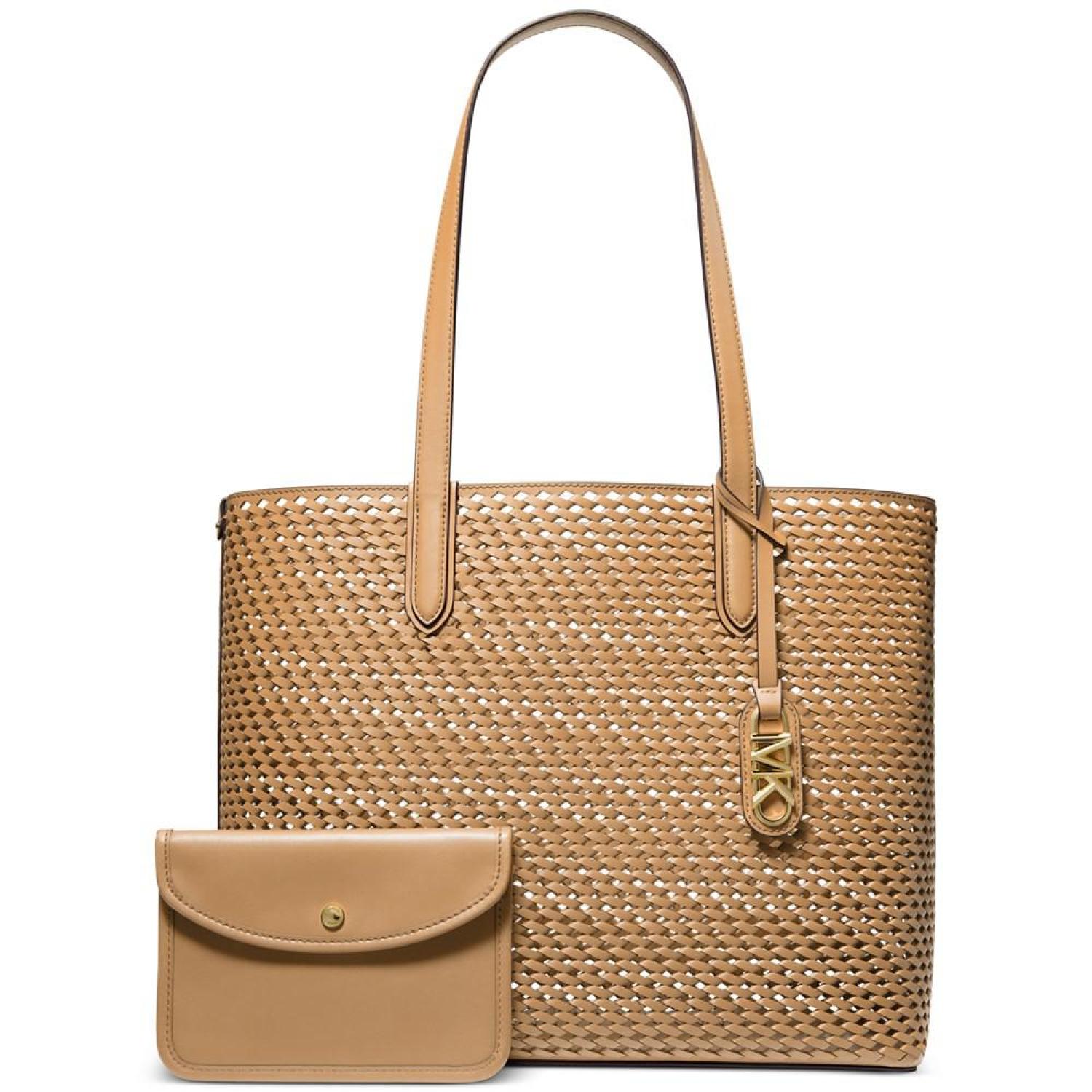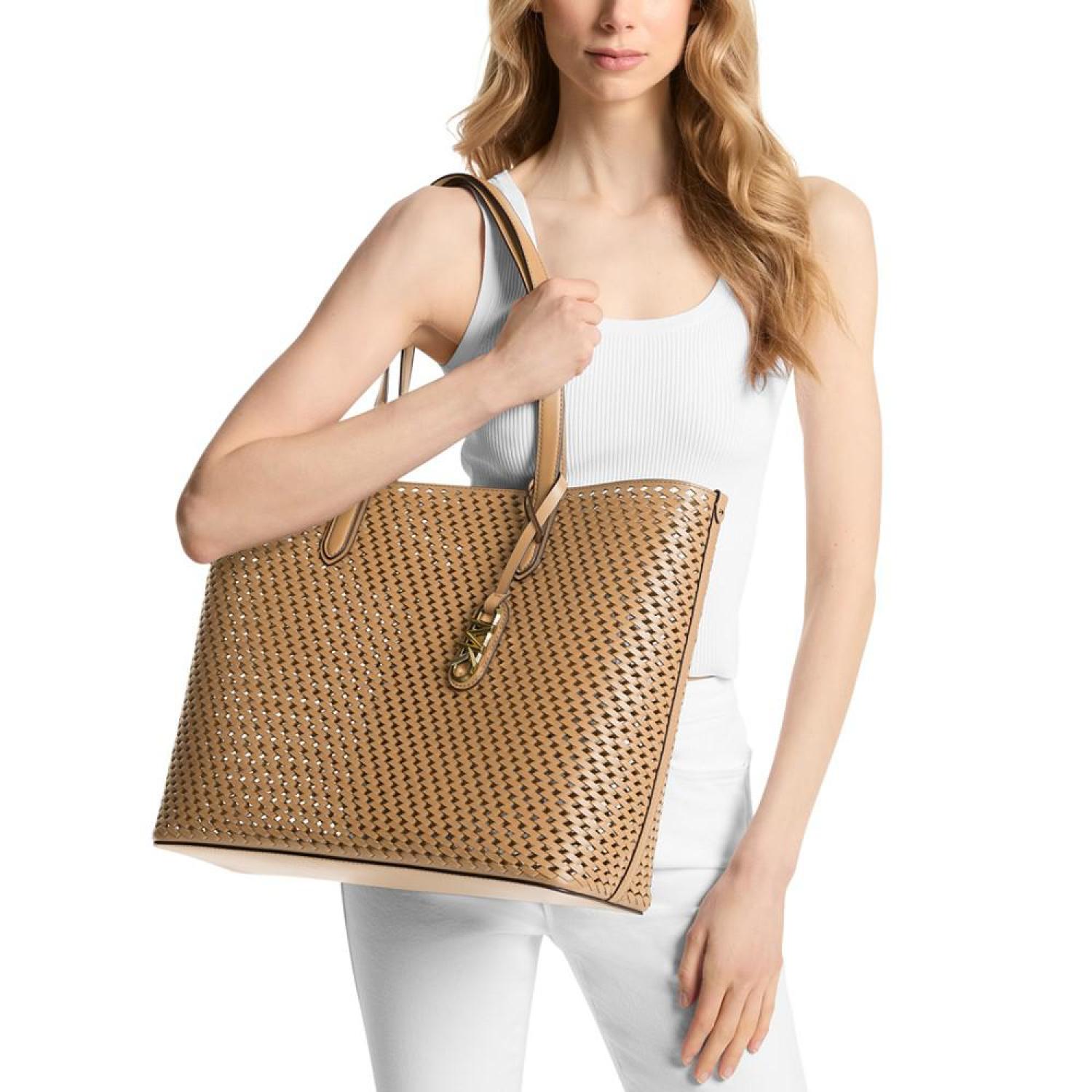 A chic summer accessory, this tote by MICHAEL Michael Kors is crafted in woven leather for an easy, breezy vibe, perfect for beach days and outdoor gatherings. Extra-large sized bag; 19"W x 13-1/4"H x 5-1/2"D (width is measured across the bottom of handbag); 1.34 lbs. approx. weight Silhouette is based off 5'9" model 11-1/4"L handles Open top Gold-tone hardware & logo tag, removable interior pouch Leather; trim: leather; trim 2: polyurethane, cotton, polyester Spot clean Imported