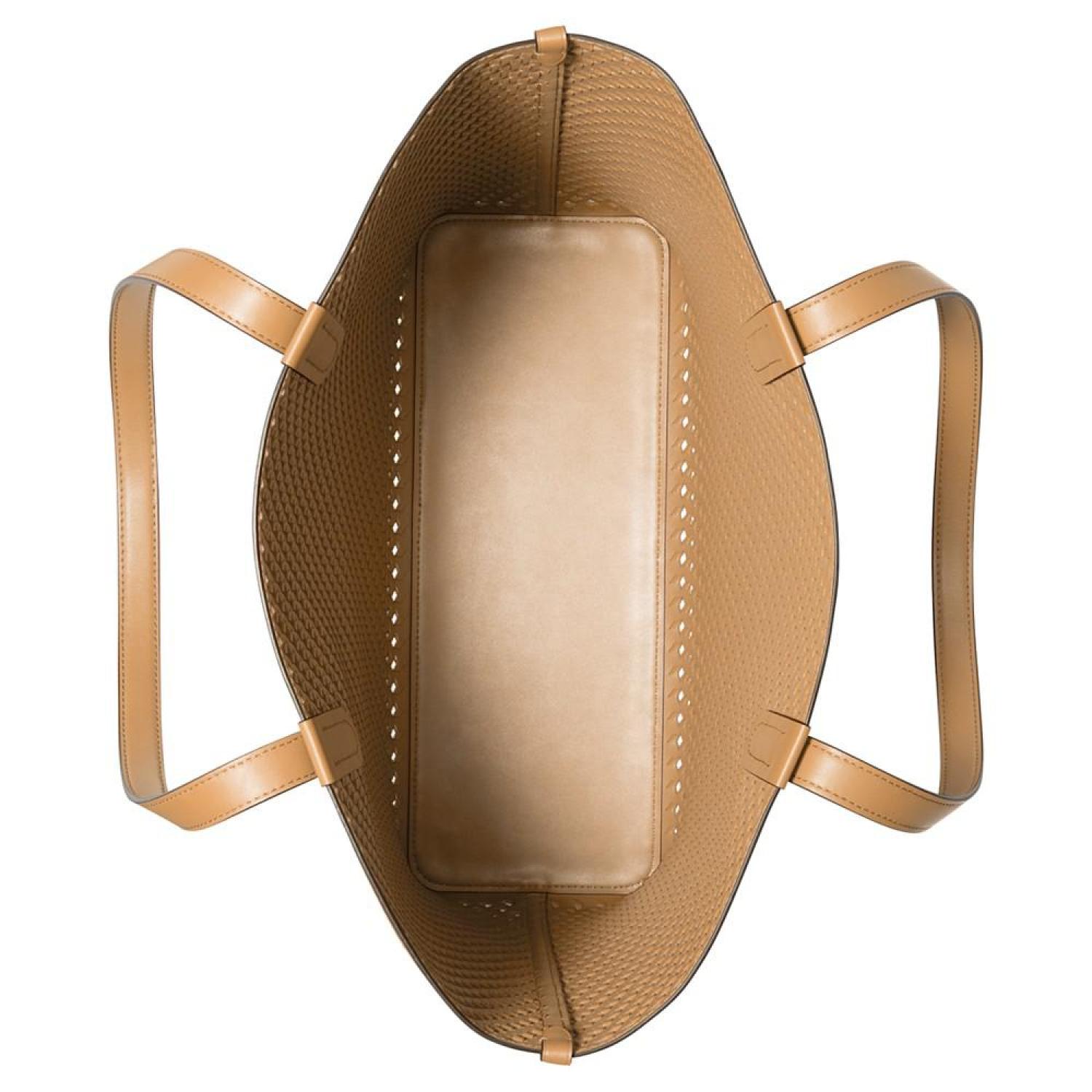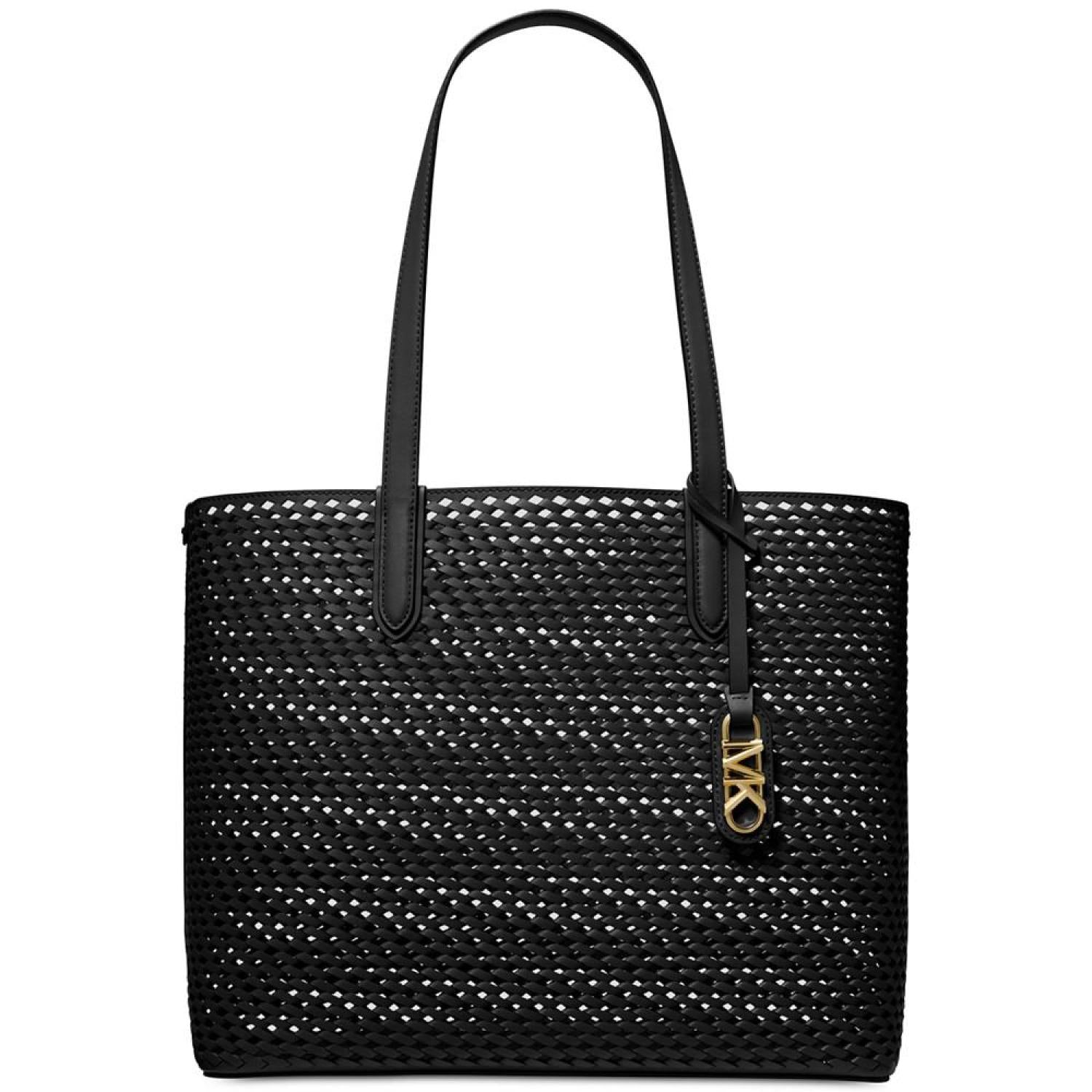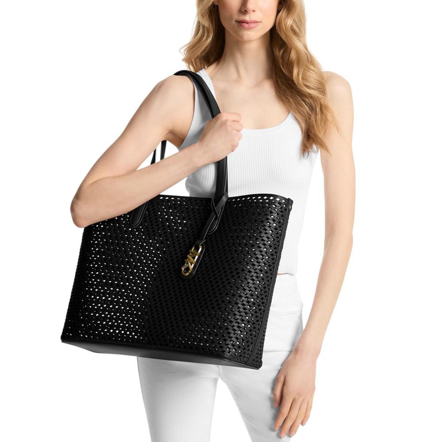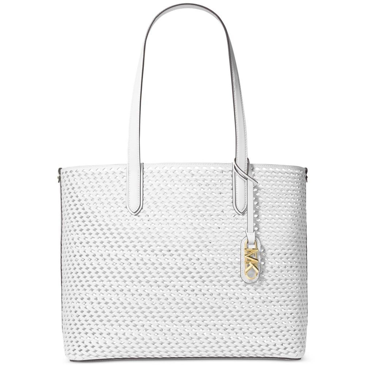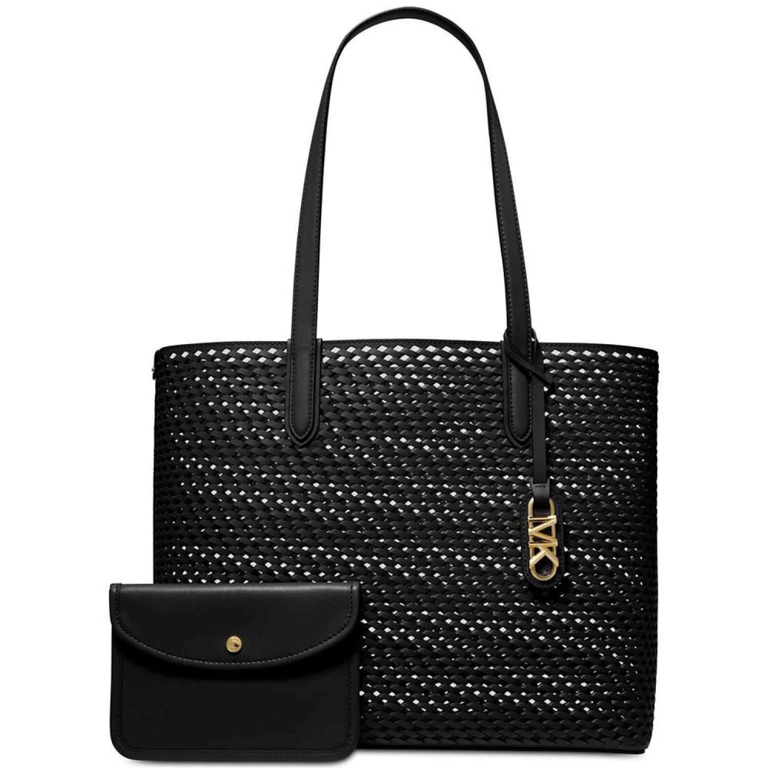 A chic summer accessory, this tote by MICHAEL Michael Kors is crafted in woven leather for an easy, breezy vibe, perfect for beach days and outdoor gatherings. Extra-large sized bag; 19"W x 13-1/4"H x 5-1/2"D (width is measured across the bottom of handbag); 1.34 lbs. approx. weight Silhouette is based off 5'9" model 11-1/4"L handles Open top Gold-tone hardware & logo tag, removable interior pouch Leather; trim: leather; trim 2: polyurethane, cotton, polyester Spot clean Imported