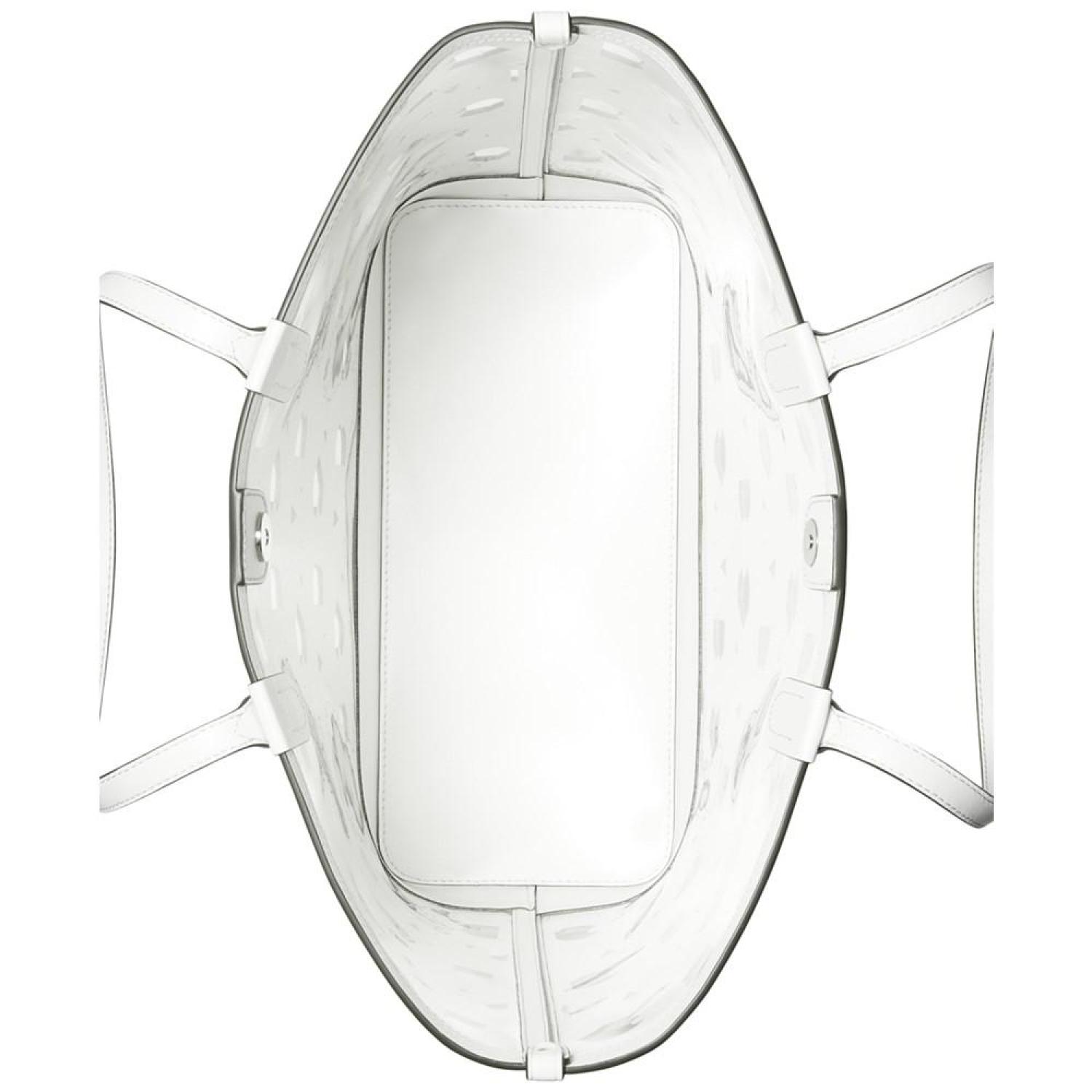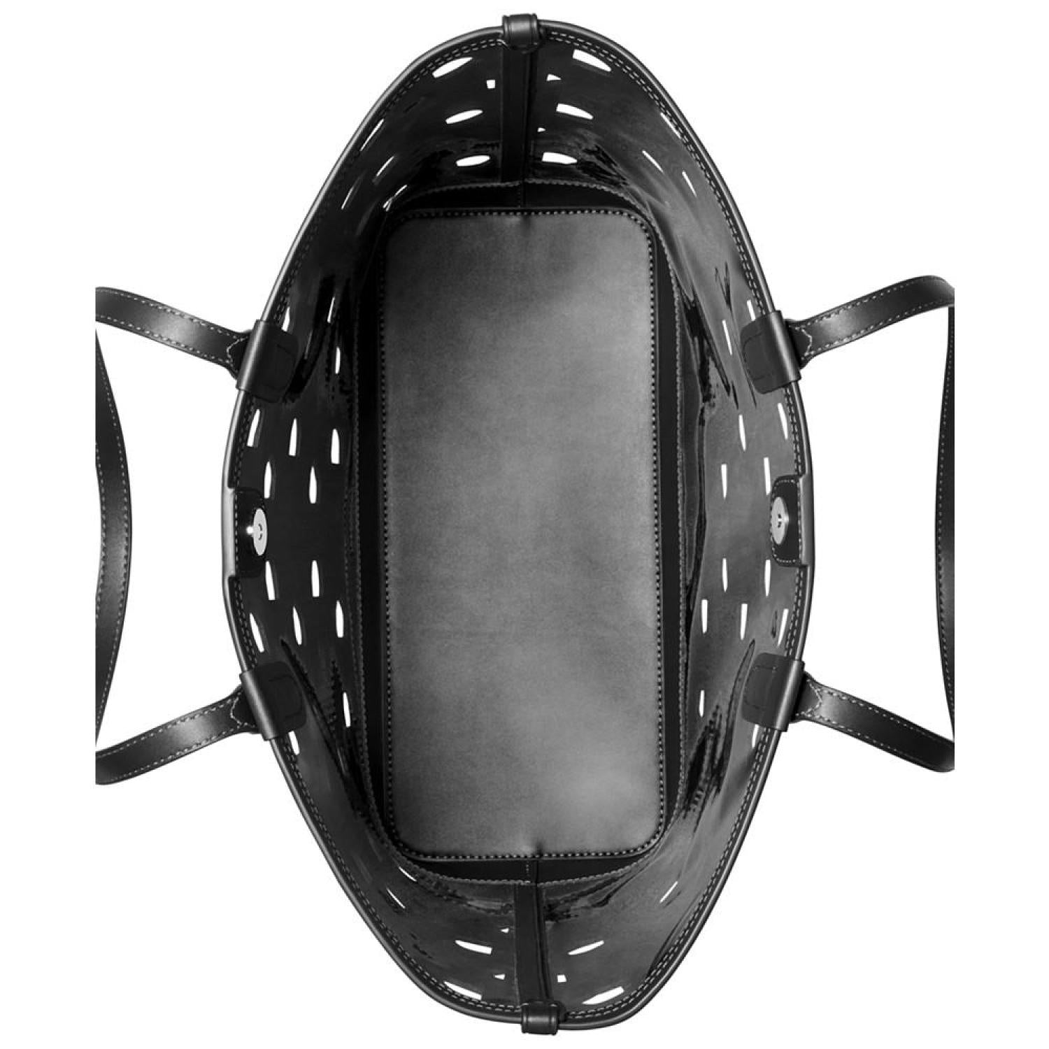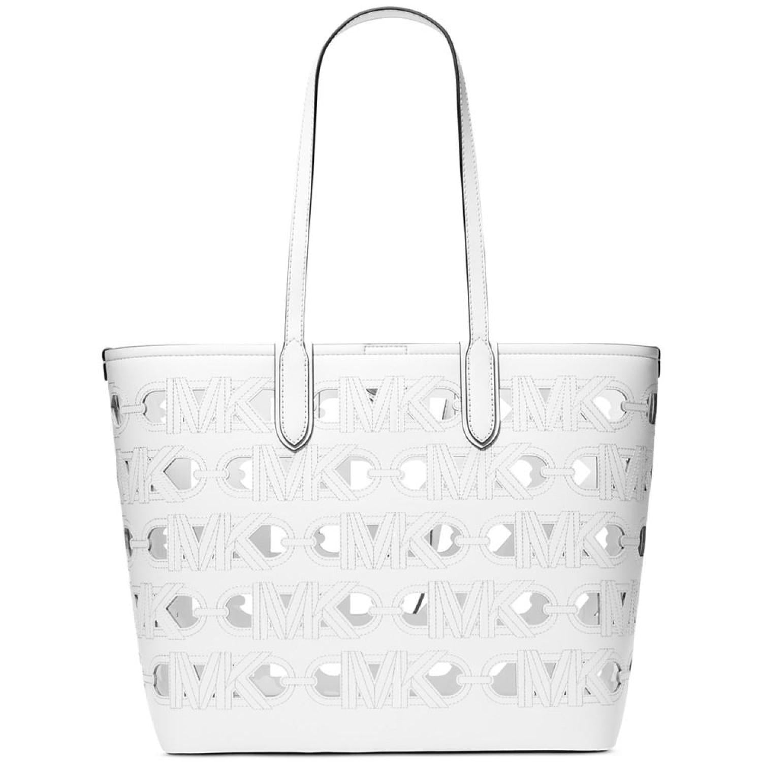Crafted with chic logo eyelets, this tote by MICHAEL Michael Kors is a refined summer accessory that easily carries over to other seasons. Large sized bag; 16-1/2"W x 11-3/4"H x 6"D (width is measured across the bottom of handbag) Silhouette is based off 5'9" model 9"L handles Snap closure Open interior Polyurethane; trim: polyurethane, cotton, polyester Spot clean Imported