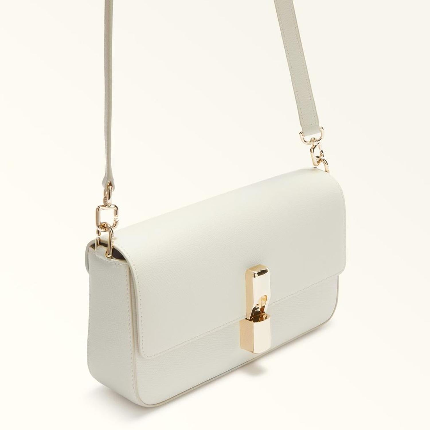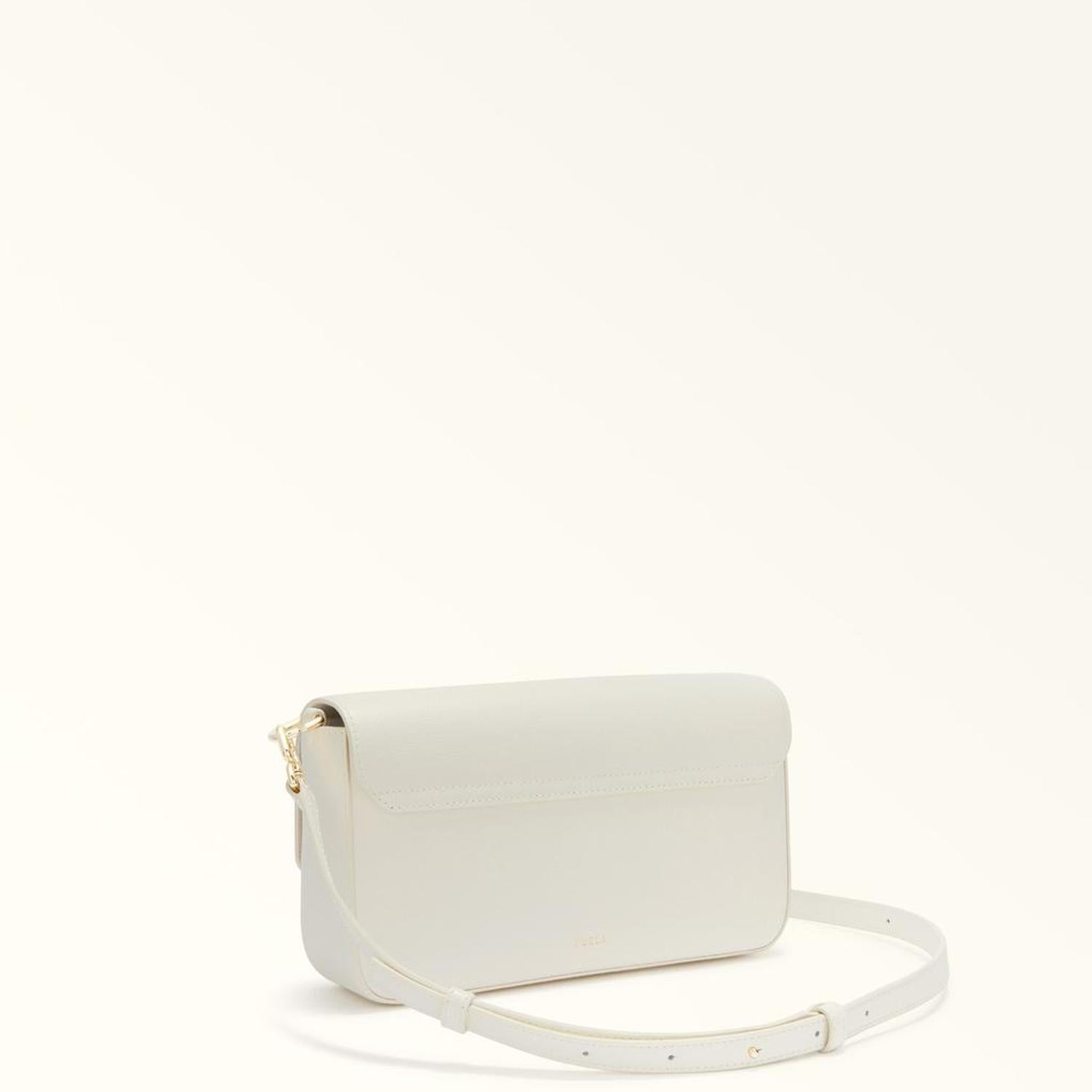 • The shape of the Furla Iride crossbody is defined by its versatile, contemporary design. Its compact silhouette, in exquisite textured leather, features an adjustable and detachable shoulder strap for multiple styling options. Its magnetic closure is embellished with cylindrical metal hardware, finished with the iconic Furla Arch logo.