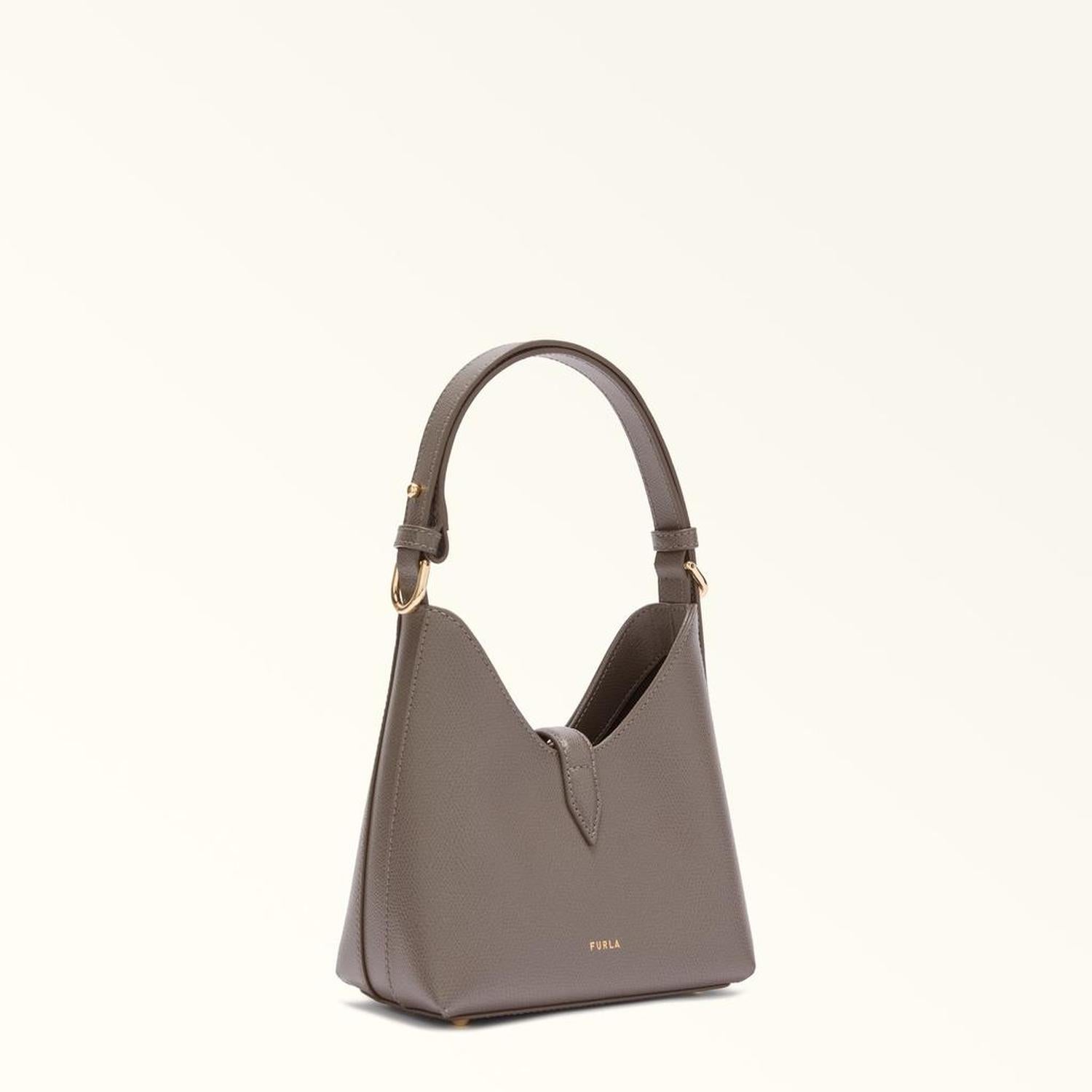 • Made from printed leather, the Furla Iride mini hobo bag stands out for its soft trapezoidal shape. The accessory's matching tab is embellished with the brand's weighted cylindrical hardware and the iconic Furla Arch logo, keeping it safely fastened. Its compact open interior holds all your essentials.