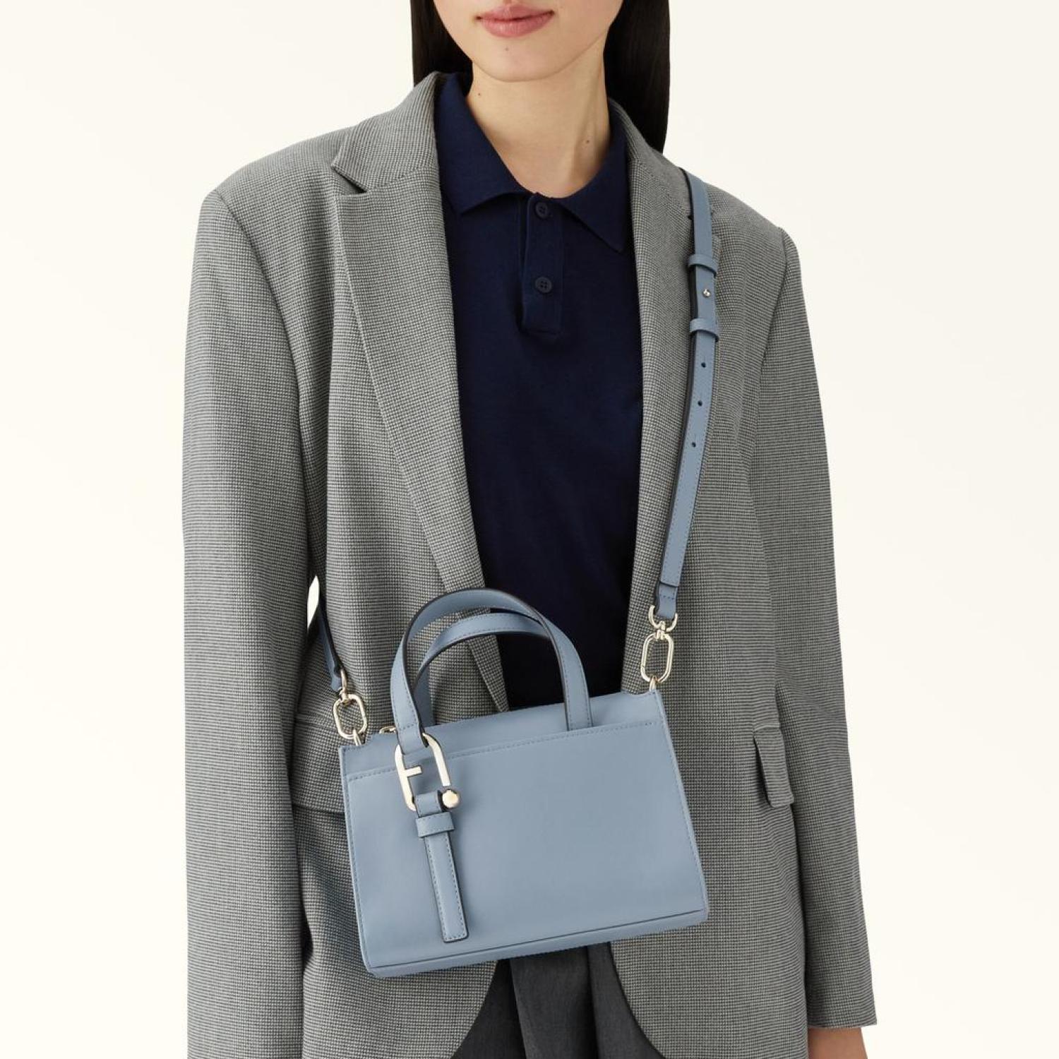 With square lines and a contemporary design, the Furla Nuvola mini Boston bag comes in an exquisite natural-feel leather. Thoughtfully constructed for optimum storage, it features small inside pockets and an open outer compartment for easy and immediate access. Its adjustable matching shoulder strap can be detached from the bag using the stud buttons on the side, allowing for multiple styling options. The Arcosfera hardware adds a unique flourish to the front handle, combining the iconic Furla Arch logo with the brand's original spherical hallmark.