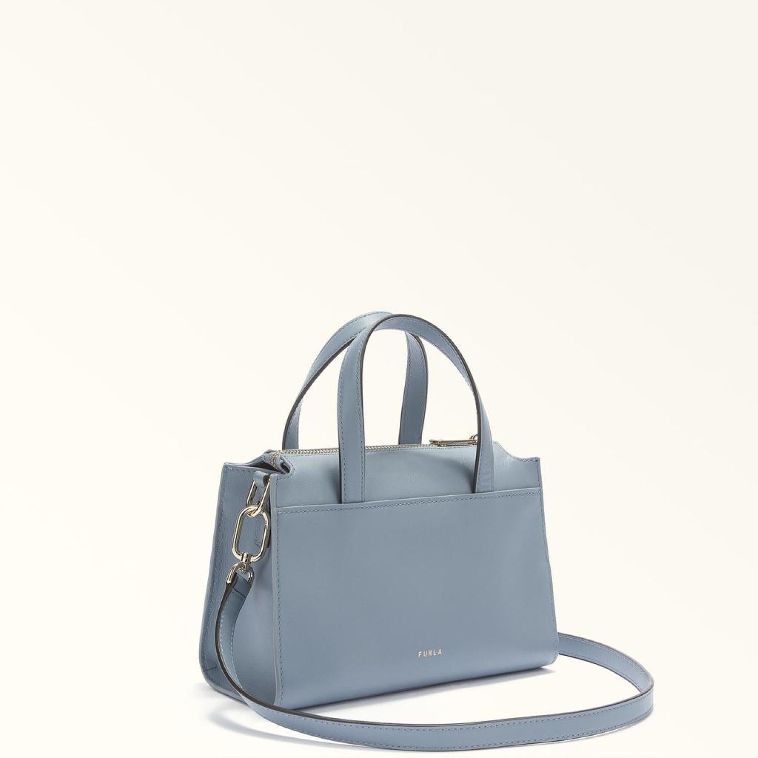 • With square lines and a contemporary design, the Furla Nuvola mini Boston bag comes in an exquisite natural-feel leather. Thoughtfully constructed for optimum storage, it features small inside pockets and an open outer compartment for easy and immediate access. Its adjustable matching shoulder strap can be detached from the bag using the stud buttons on the side, allowing for multiple styling options. The Arcosfera hardware adds a unique flourish to the front handle, combining the iconic Furla Arch logo with the brand's original spherical hallmark.