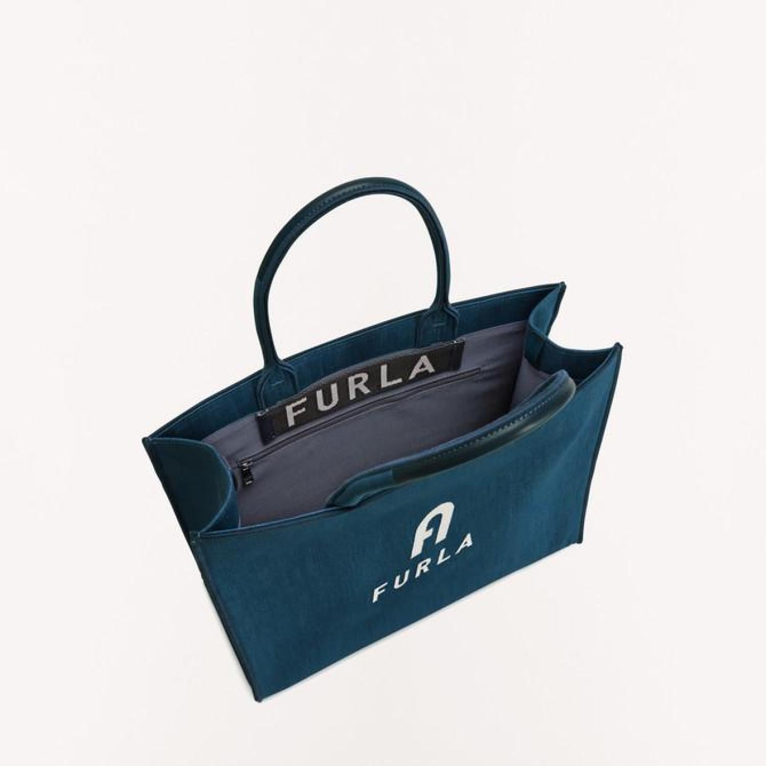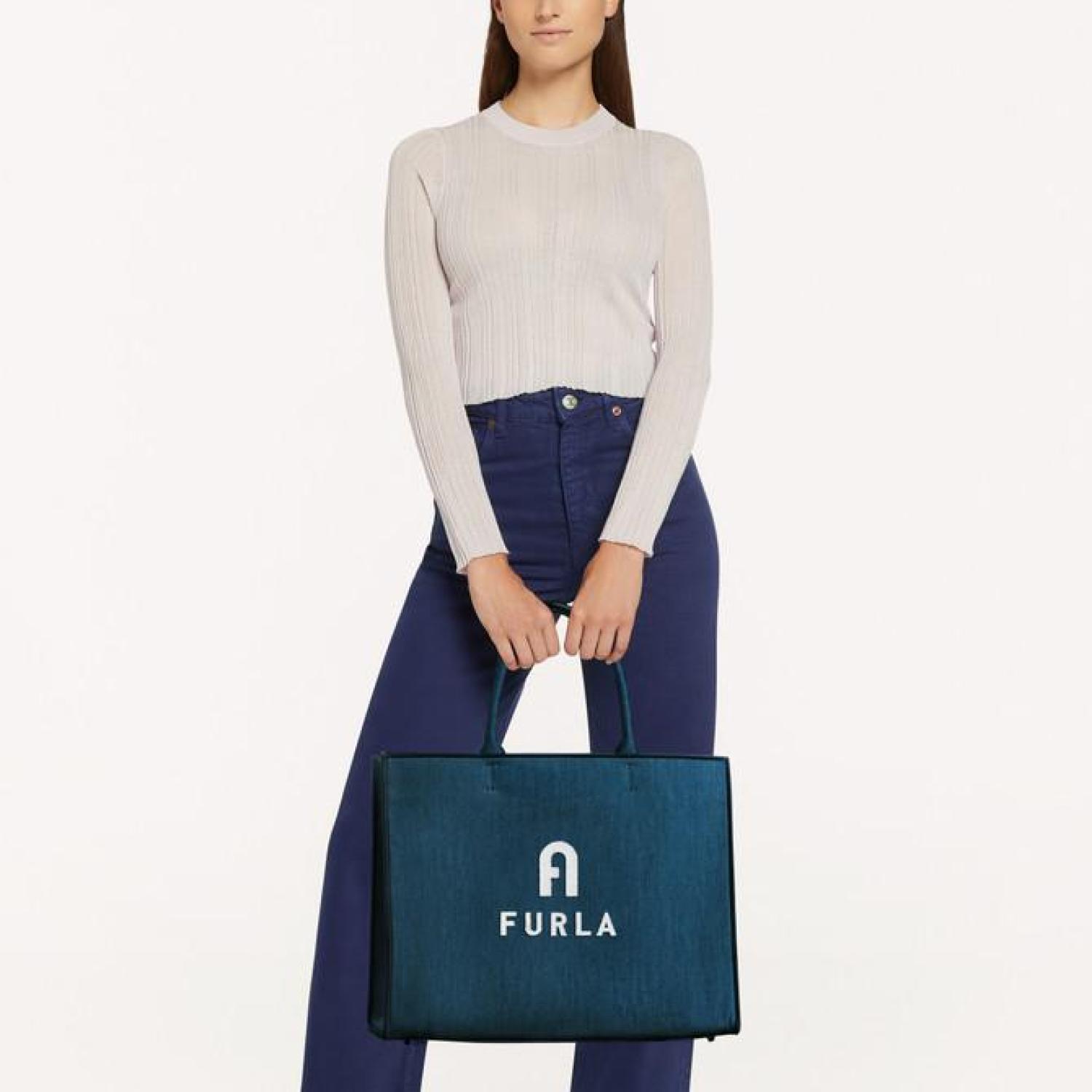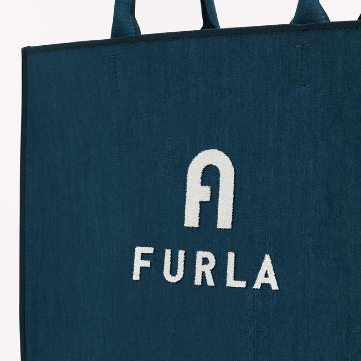 • Furla Opportunity is a large tote bag perfect for leisure and travel. Made from a denim folk fabric, it features a double handle trimmed with leather for carrying the piece in your hand. Its spacious interior can hold all your personal belongings.