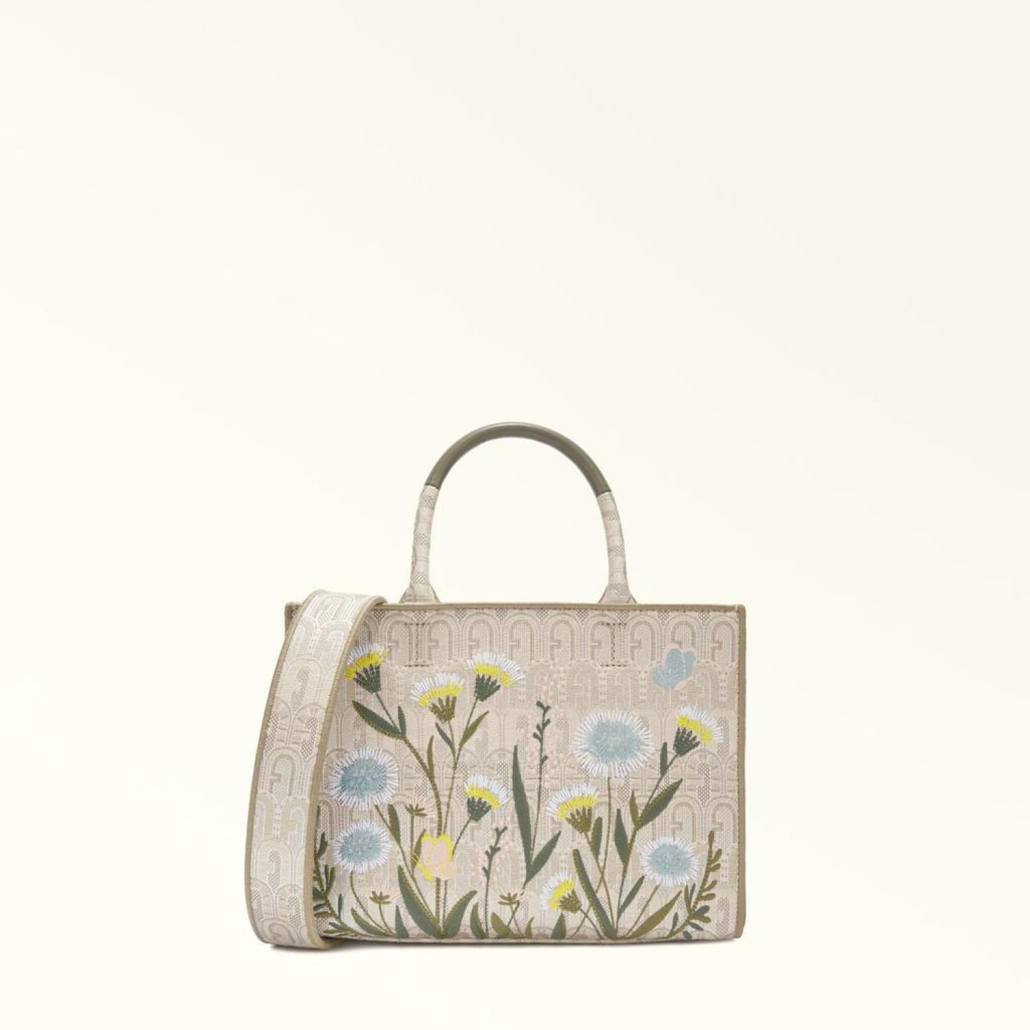 • Furla Opportunity is a small tote bag designed with special occasions in mind. Inspired by the local flora of the Venetian Lagoon, its square silhouette blooms with an embossed jacquard fabric – embellished with a geometric Arch motif and decorative floral details.