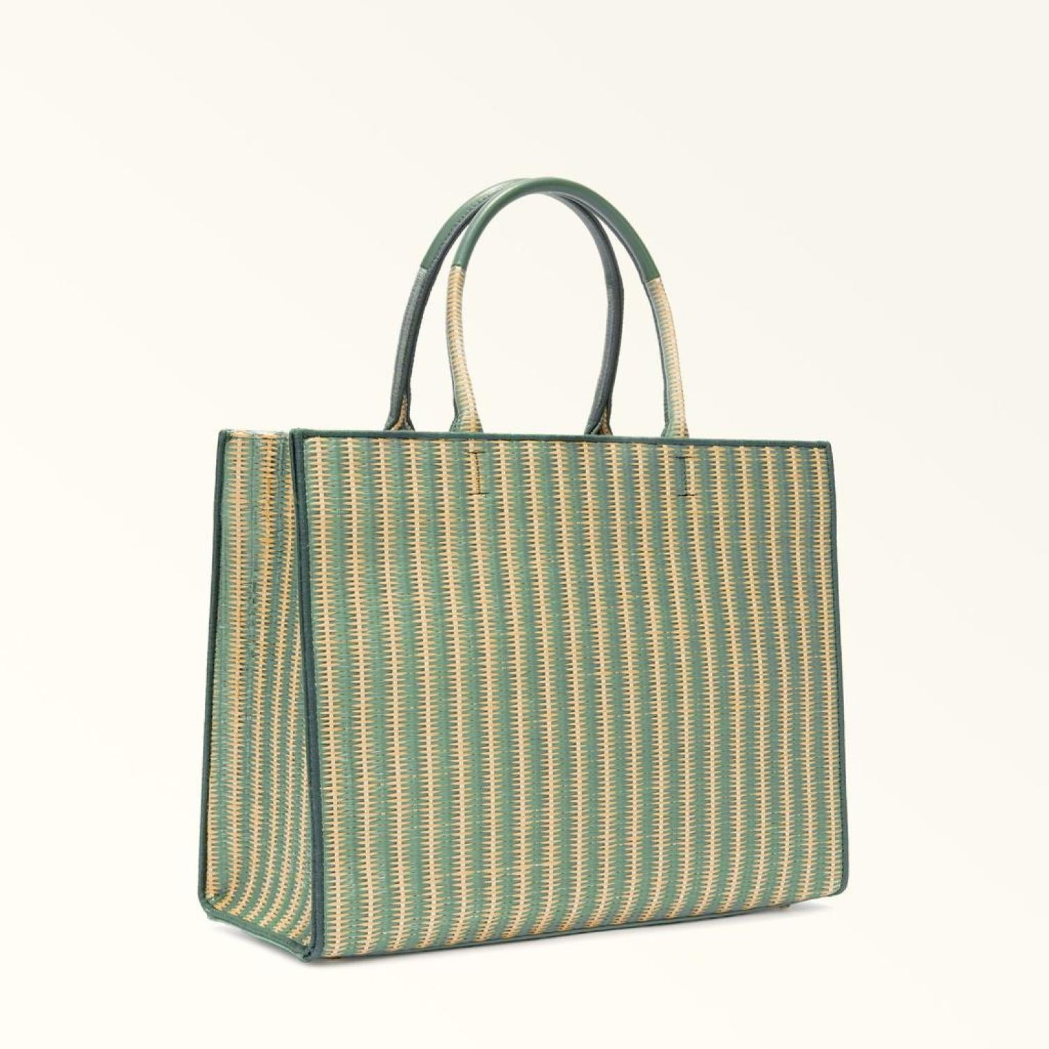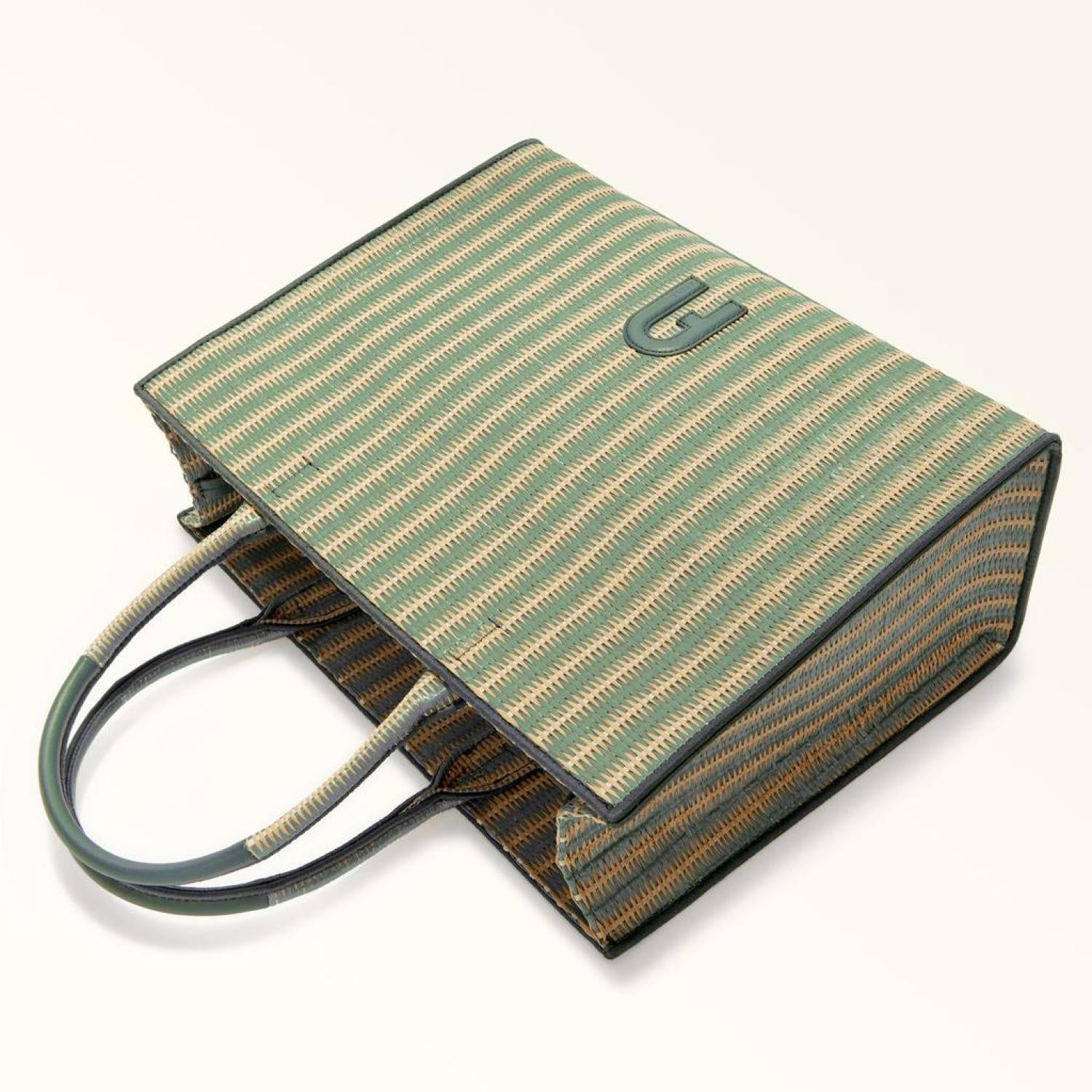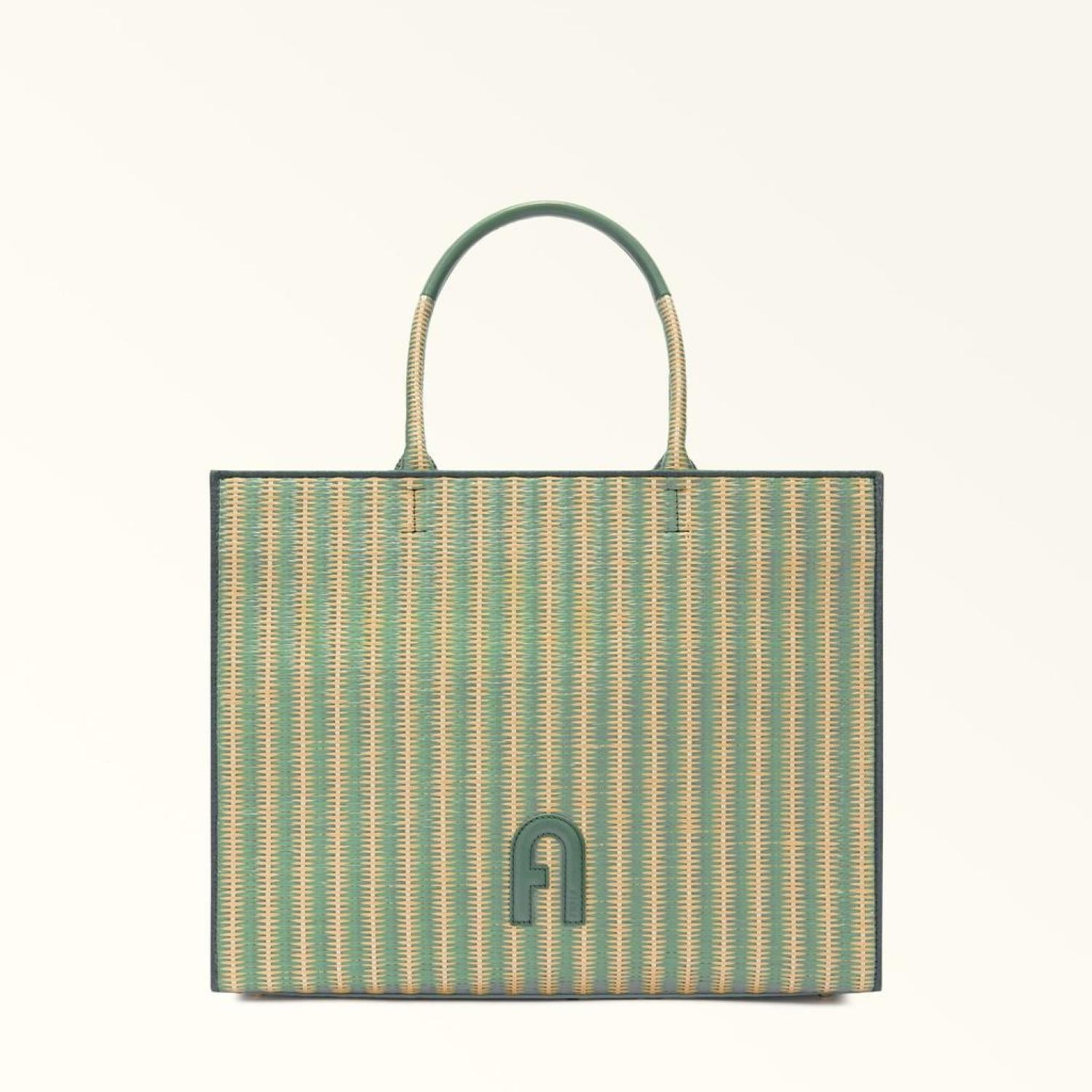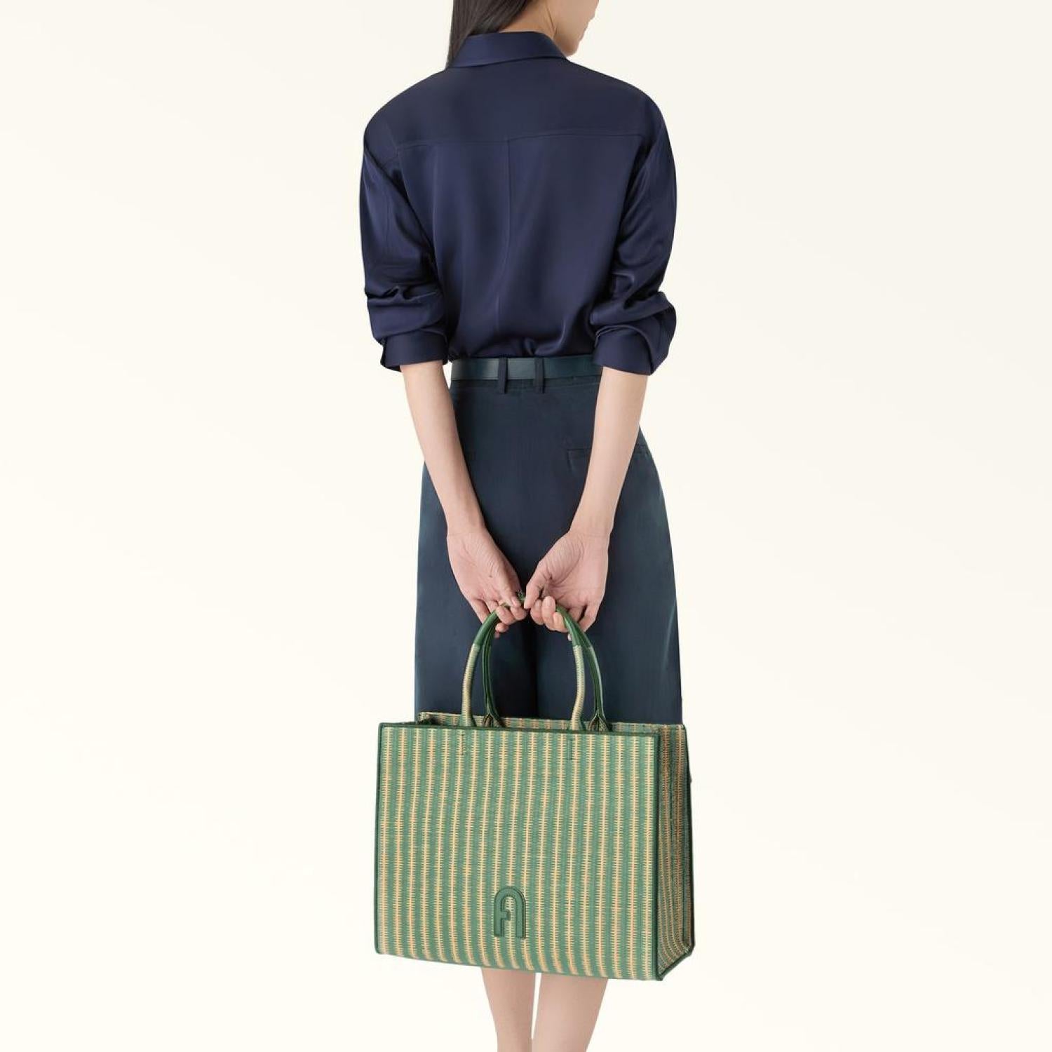 This contemporary large Furla Opportunity tote is crafted in raffia with an all-over striped pattern, with matching handles in luxurious smooth leather, so it can be carried by hand. With its sizeable dimensions and spacious interior, it is designed to carry everything you may need, for any summer occasion, leisure or travel.