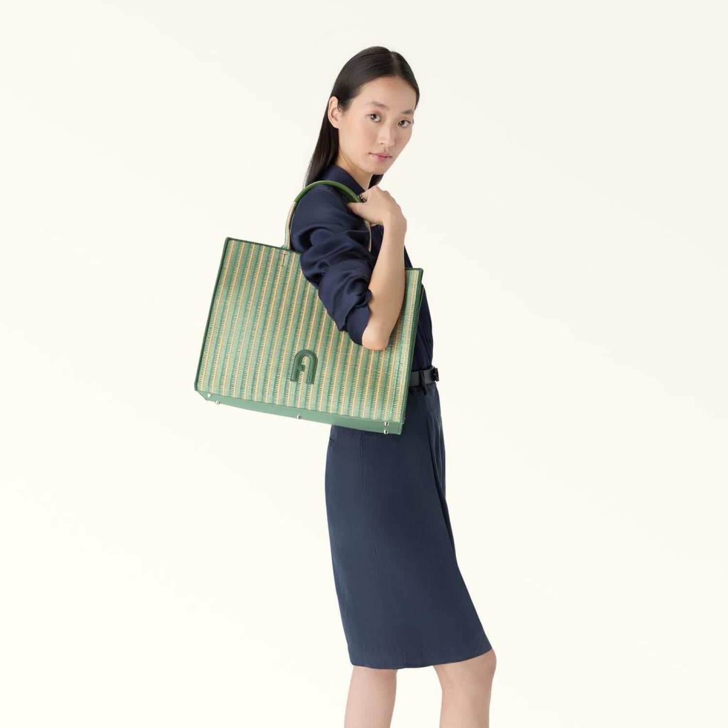 • This contemporary large Furla Opportunity tote is crafted in raffia with an all-over striped pattern, with matching handles in luxurious smooth leather, so it can be carried by hand. With its sizeable dimensions and spacious interior, it is designed to carry everything you may need, for any summer occasion, leisure or travel.