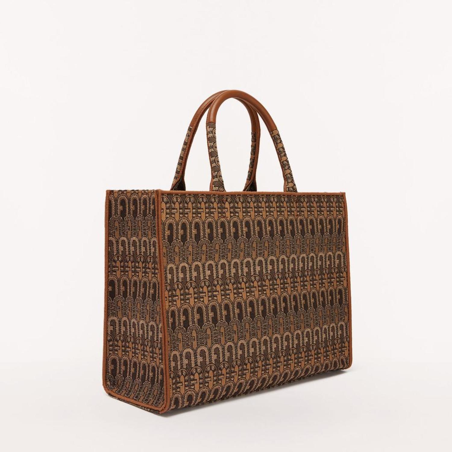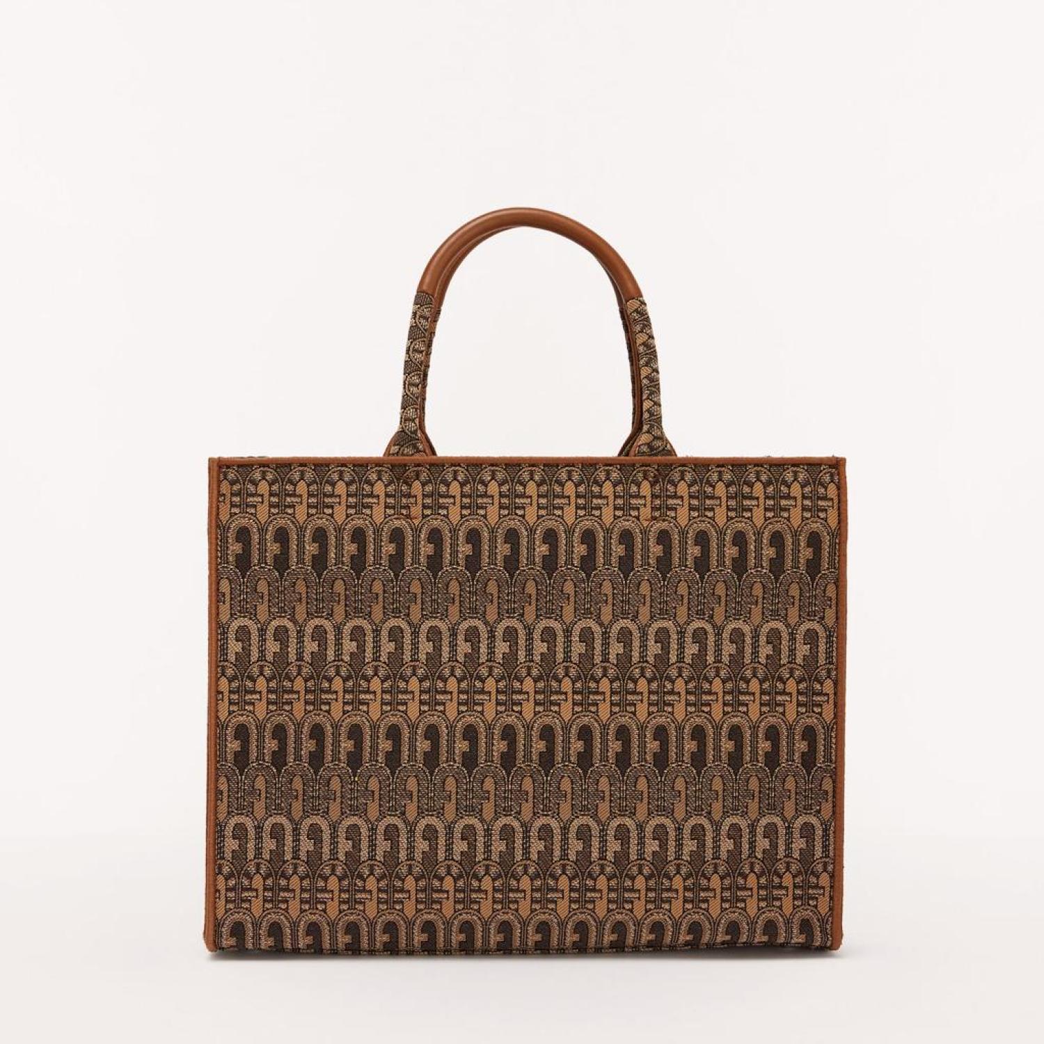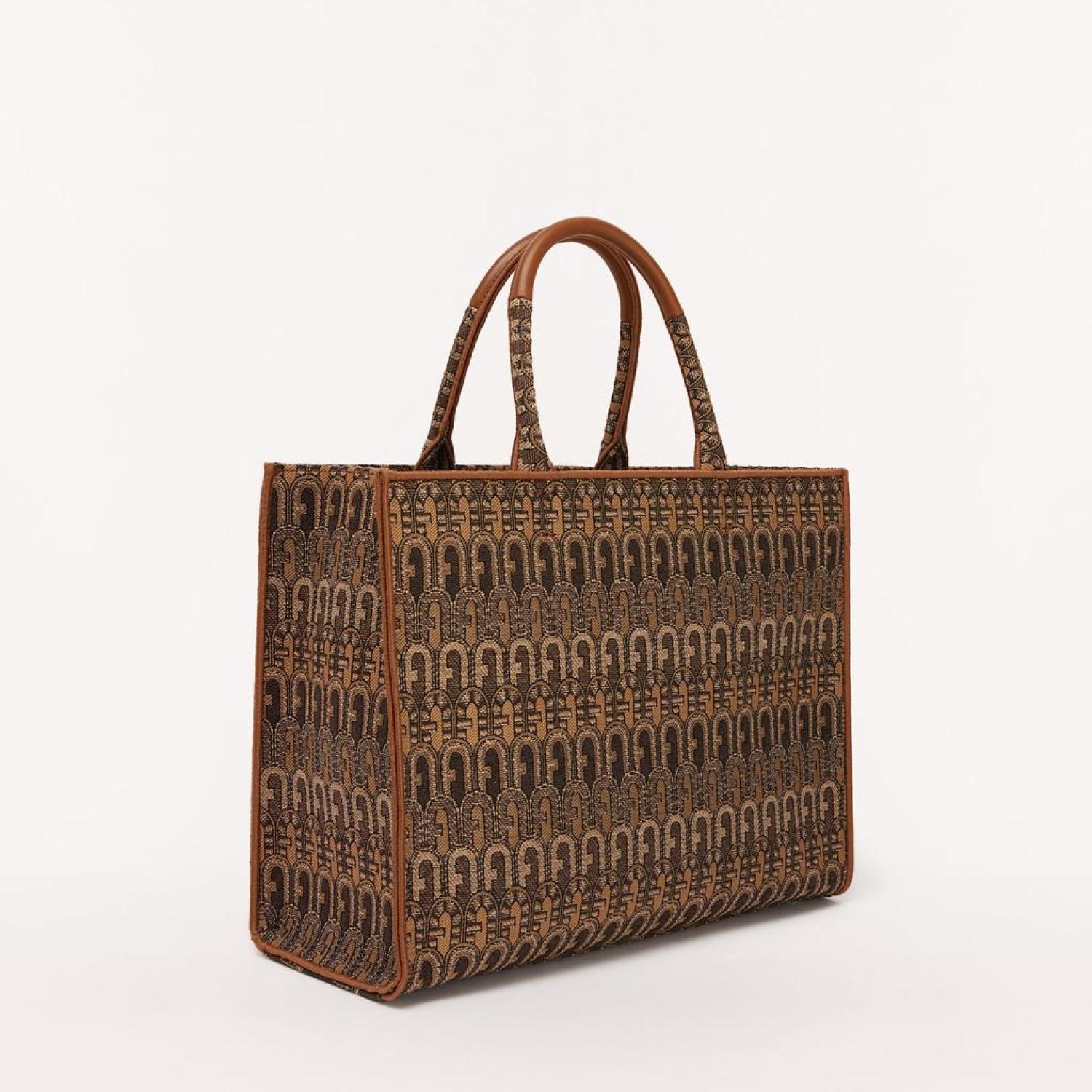 Furla Opportunity is a large shopping bag featuring a double handle. The bag is made in fabric with a jacquard-embossed ethnic motif Arch logo. Perfect for your free time and travelling, this accessory allows you to keep your personal items with you at all times. - Inner zipped pocket- Jacquard-embossed Furla logo on the inside- Metal feet studs- Palladium finishes Dimensions 14.57 x 11.42 x 5.91 (w x h x d)