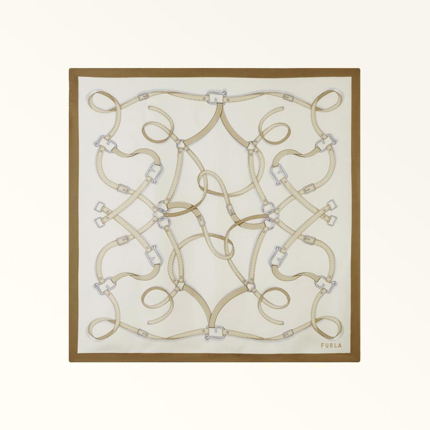 • The square Furla Tortona scarf in light silk twill features a print decorated with ribbons of colour and the brand's new Arcosfera hardware. Styled on your wrist, head or favourite bag, it lends a special touch to any look.