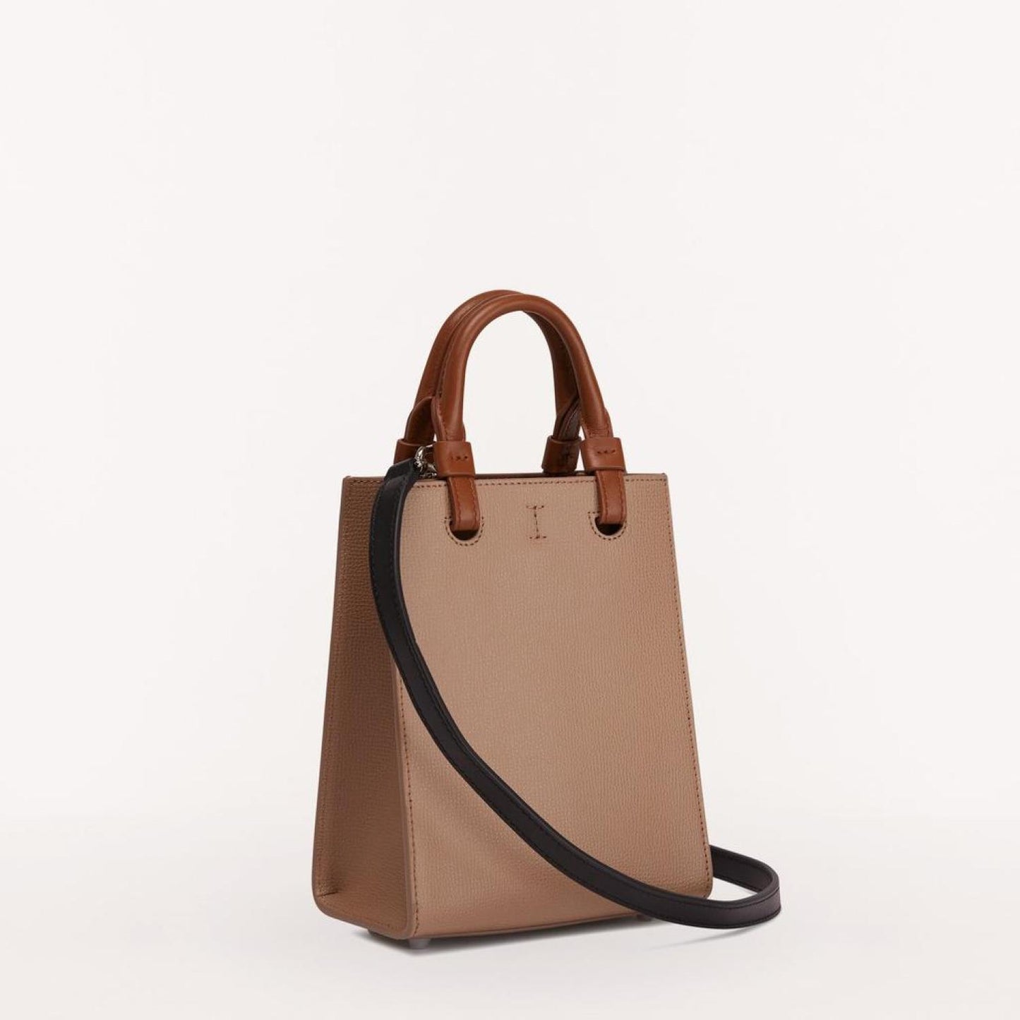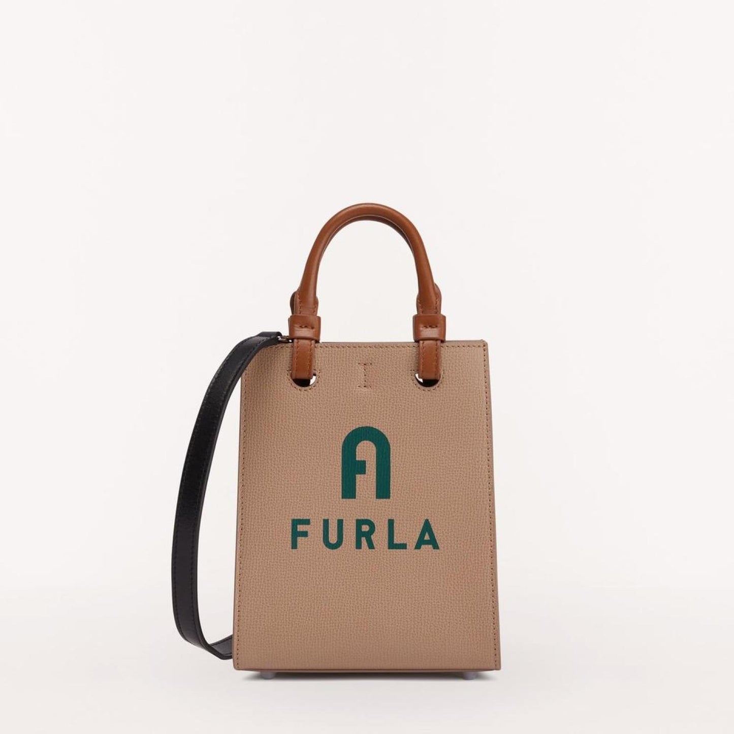 Furla Varsity Style is a mini shopping bag made from grosgrain leather with a logo pattern. The vertical design is perfect for holding your smartphone and other small personal belongings such as your wallet or lipstick. The double-handle accessory also features an adjustable and removable strap with a leather section, which allows it to be comfortably worn as a shoulder bag or as a crossbody bag. - Open inside pocket- Furla lettering and Arch logo pattern on the front- Galvanised silver-grey finishes Dimensions 6.3 x 7.87 x 3.54 (w x h x d)