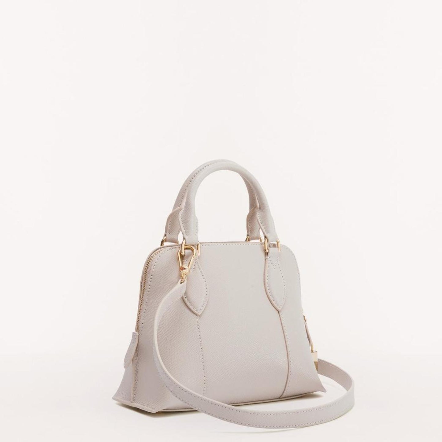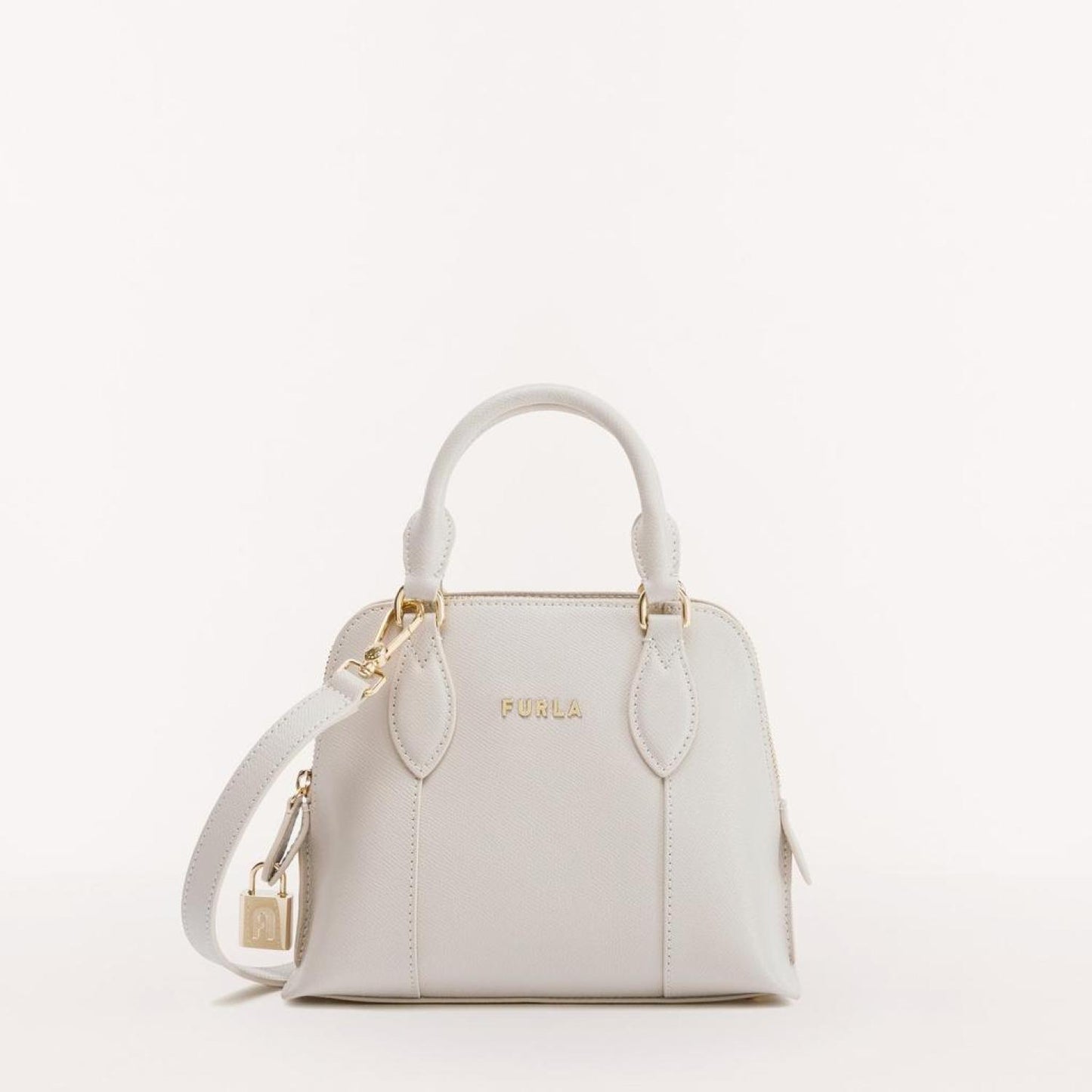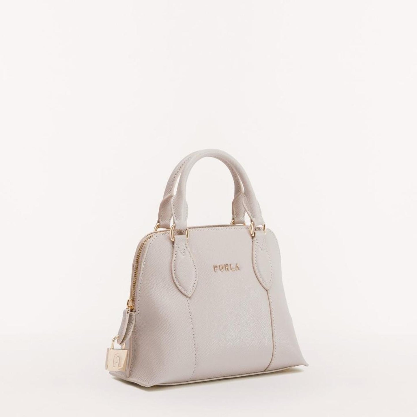 • Furla Vittoria is a handbag made of Andromeda calfskin. The small model is also designed to be worn on the shoulder or as a crossbody thanks to its adjustable and removable leather shoulder strap. A mini Arch logo padlock on the side and a galvanised Furla logo punched on the front completes this chic and elegant accessory. - Double top handle made of leather - Two inner side compartments with magnetic closure - One large central inner compartment with zip - One inside zip pocket - Zipped top closure - Galvanised light gold finishes