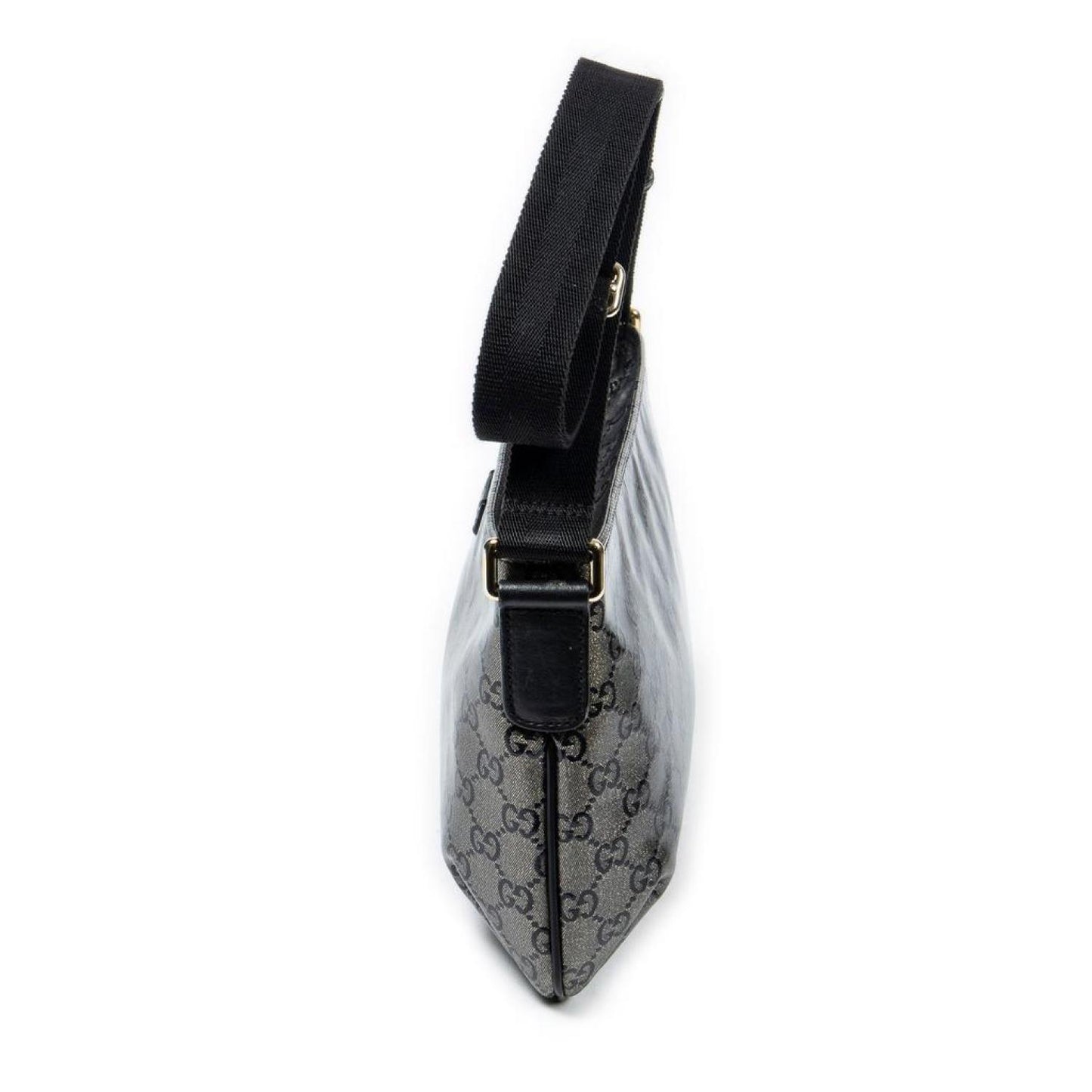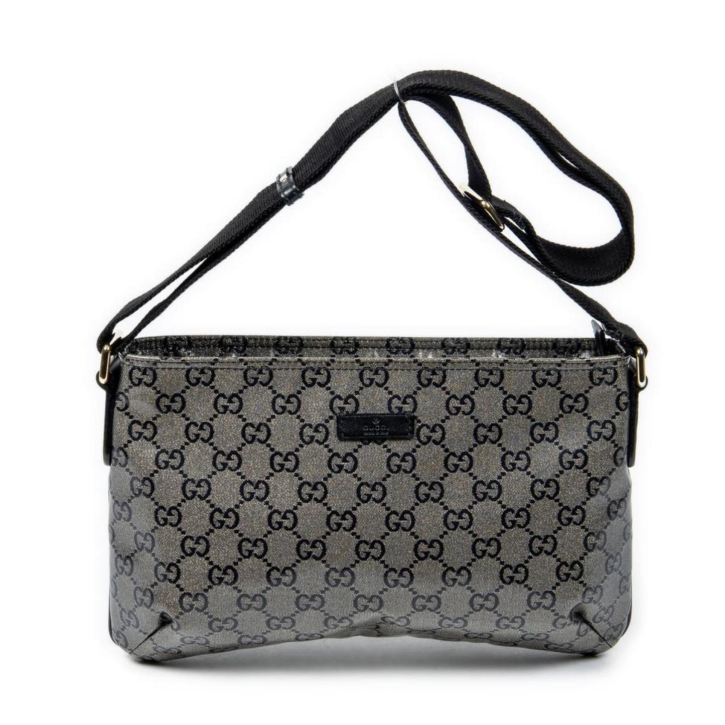 • Gucci Shoulder Bag in Gray/Black Crystal Coated Canvas and Gold hardware. Dimensions - 27*18*3cm. Serial number - 189749 001998. Inclusions - None.