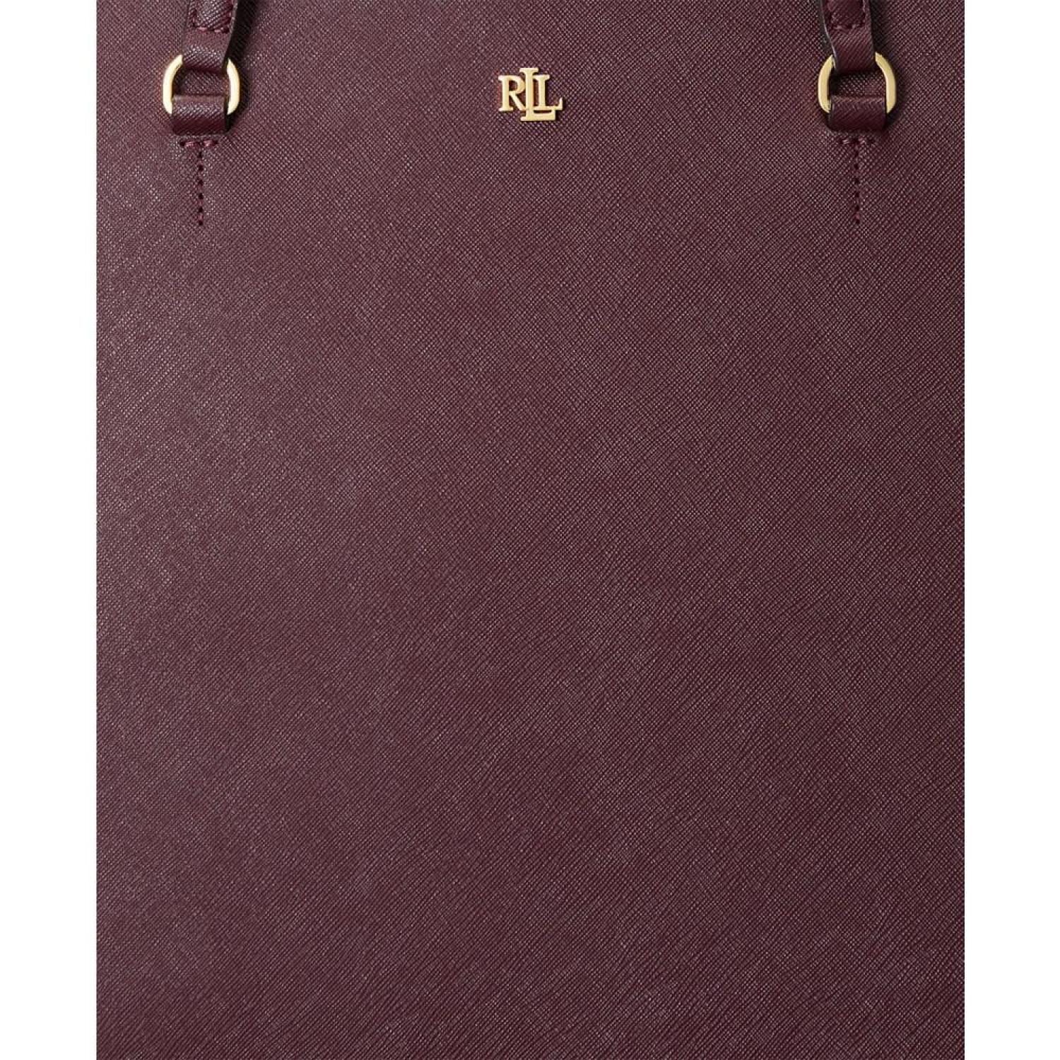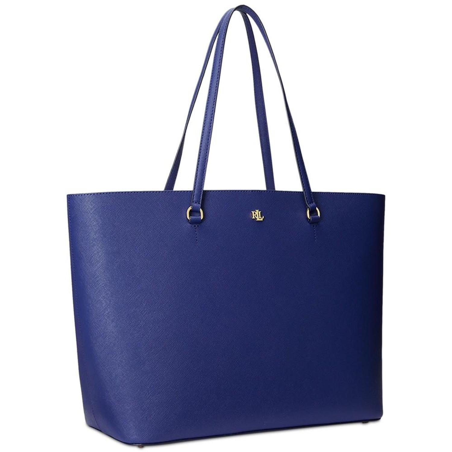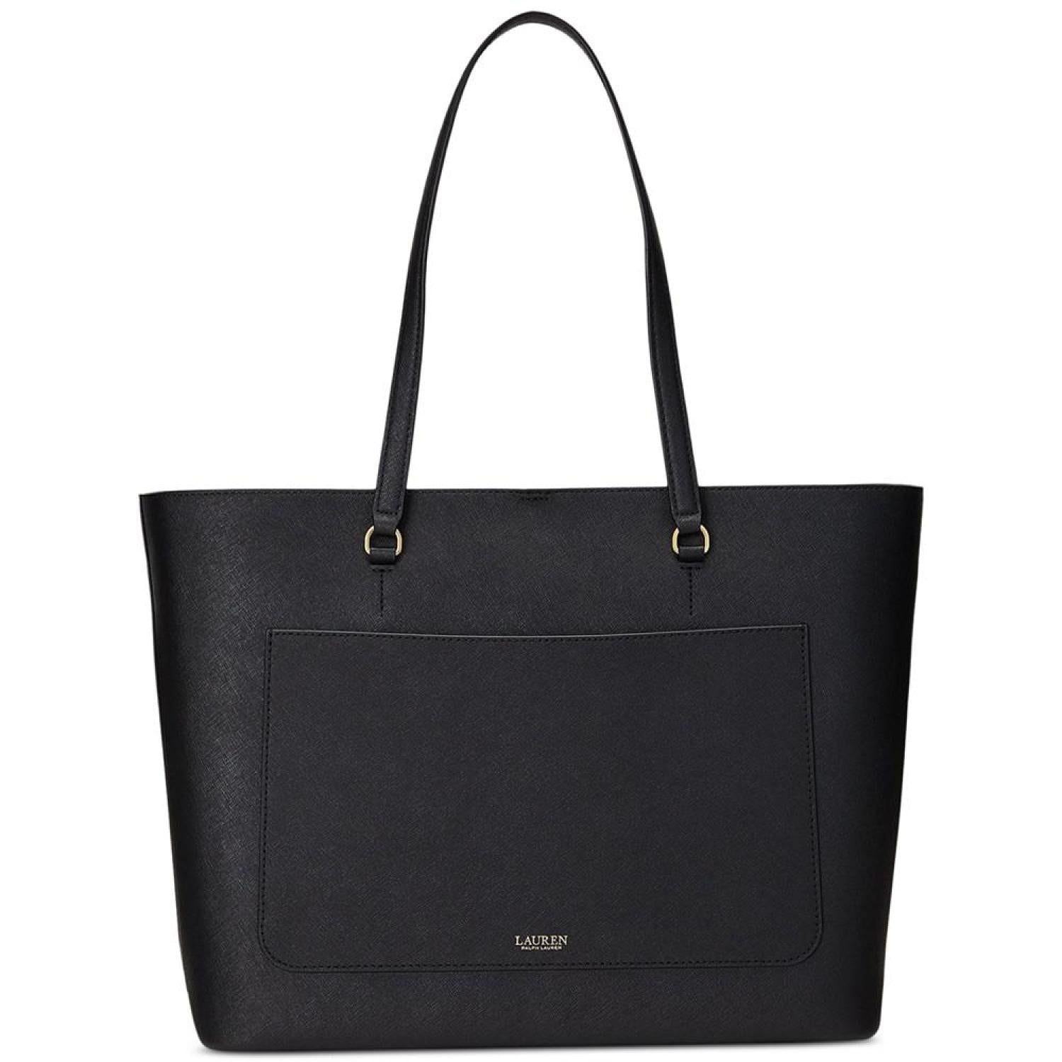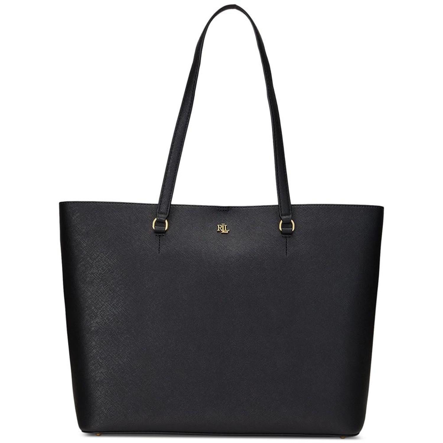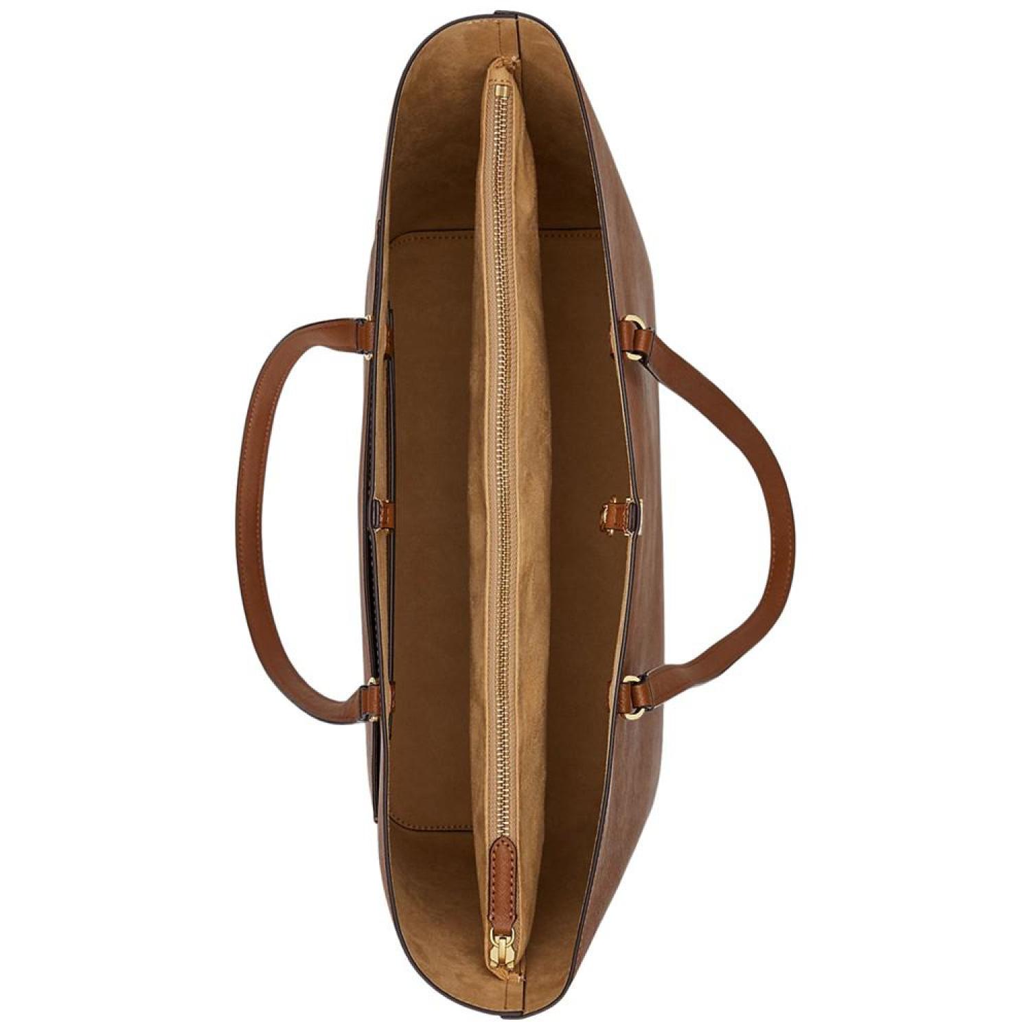 Sumptuous crosshatch leather brings subtle texture and sophisticated style to Lauren Ralph Lauren's large Karly Tote, which features a spacious silhouette and a convenient center zip compartment, perfect for storing your essentials. Large sized bag; 17-1/4"W x 11-1/2"H x 6-1/2"D (width is measured across the bottom of handbag); 2.8 lbs. approx. weight Silhouette is based off 5'9" model 8-3/4"L top handles Dog-clip closure Gold-tone hardware & exterior back slip pocket Interior center zip compartment & slip pocket Dust bag included Leather; lining: polyester Professional leather clean Imported