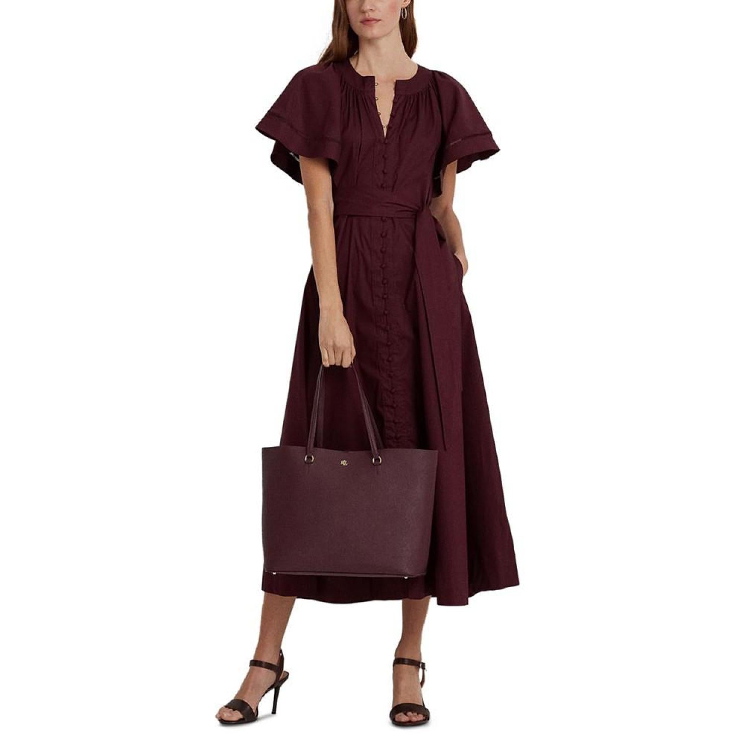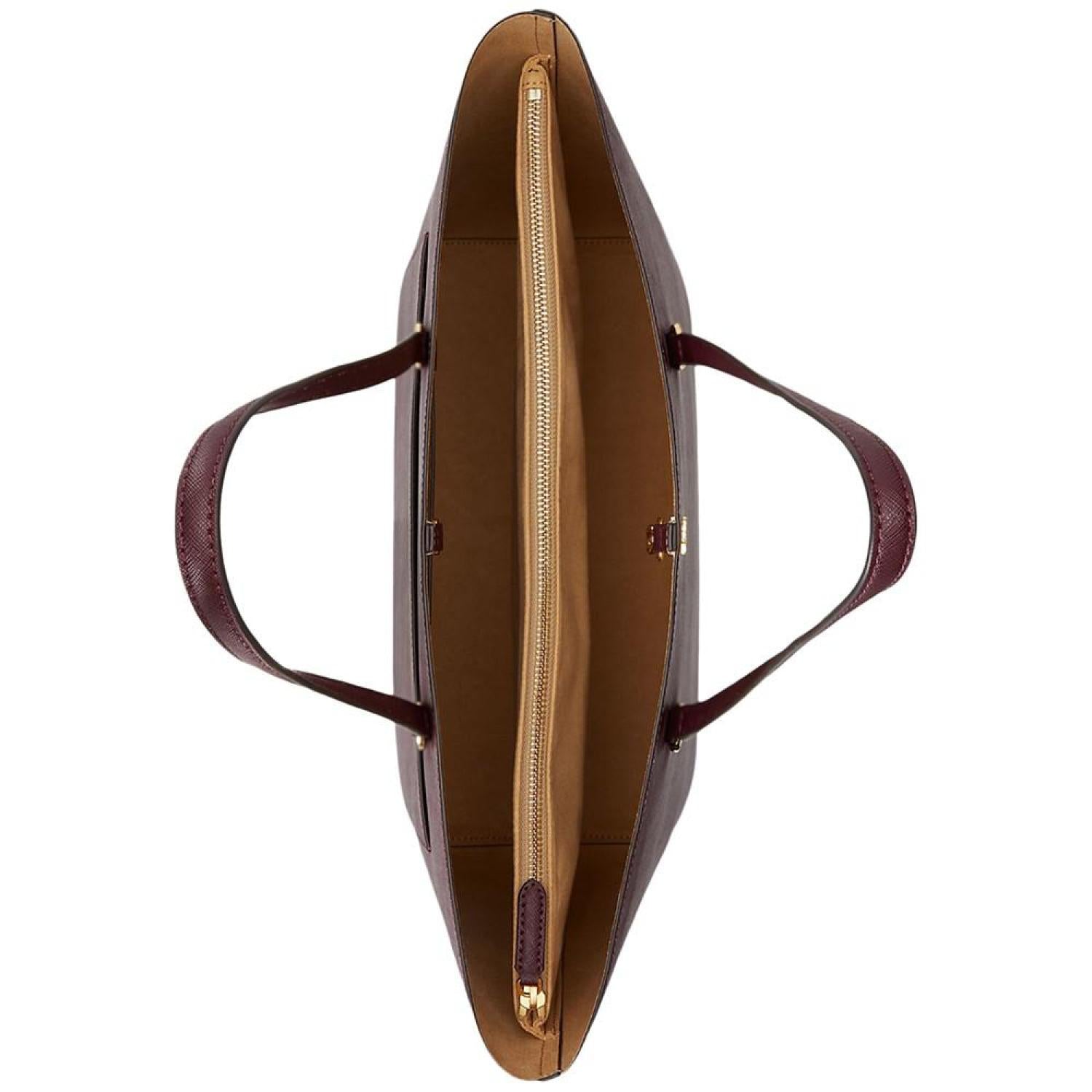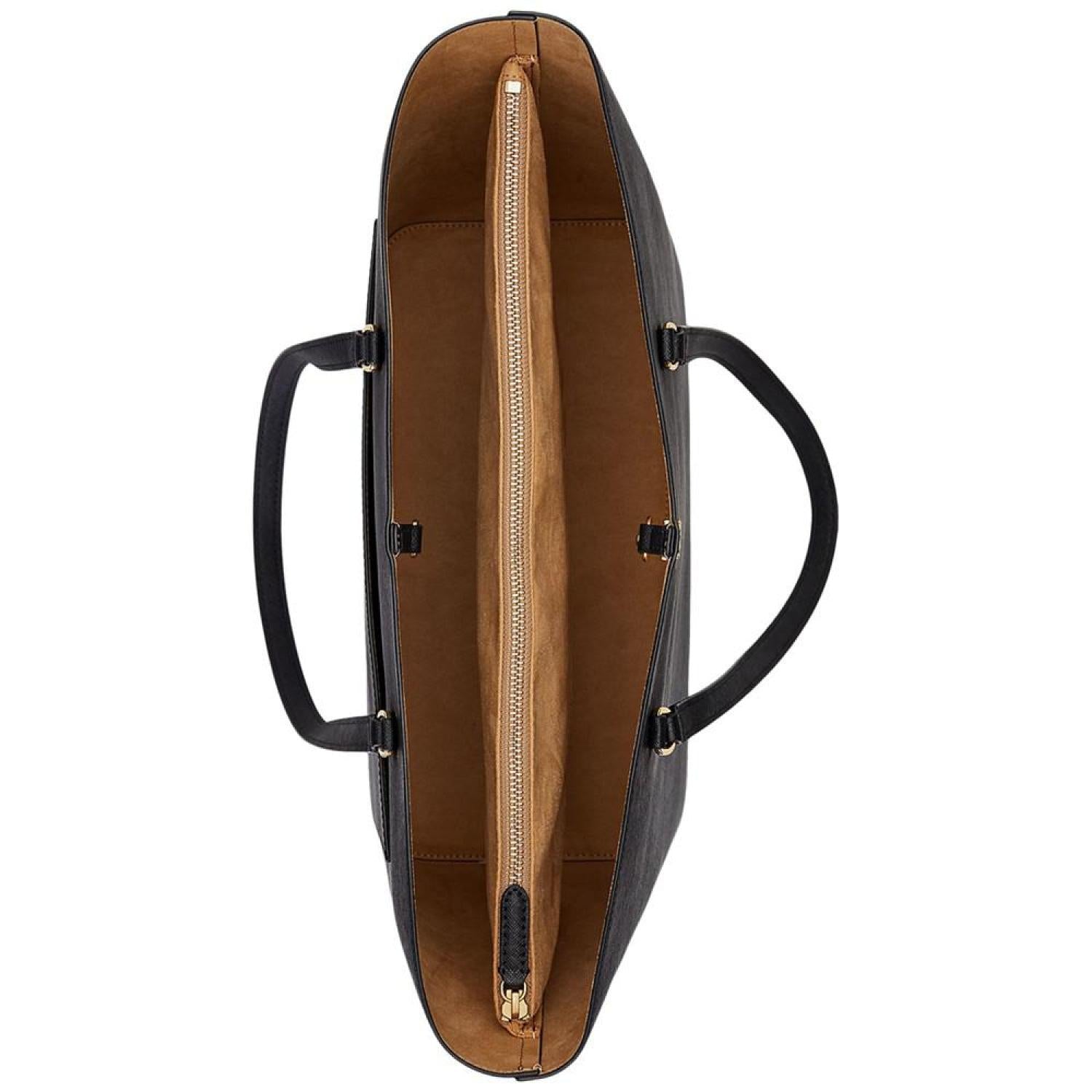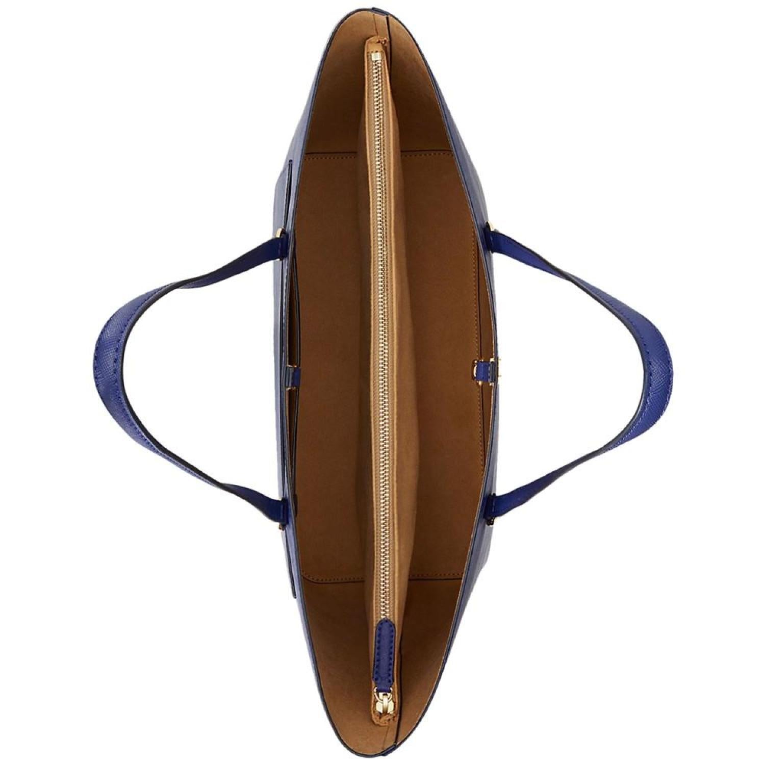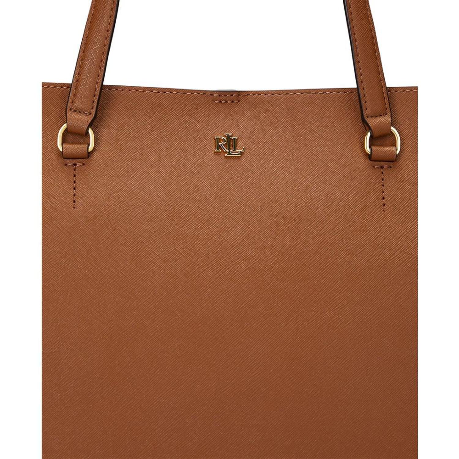 Sumptuous crosshatch leather brings subtle texture and sophisticated style to Lauren Ralph Lauren's large Karly Tote, which features a spacious silhouette and a convenient center zip compartment, perfect for storing your essentials. Large sized bag; 17-1/4"W x 11-1/2"H x 6-1/2"D (width is measured across the bottom of handbag); 2.8 lbs. approx. weight Silhouette is based off 5'9" model 8-3/4"L top handles Dog-clip closure Gold-tone hardware & exterior back slip pocket Interior center zip compartment & slip pocket Dust bag included Leather; lining: polyester Professional leather clean Imported