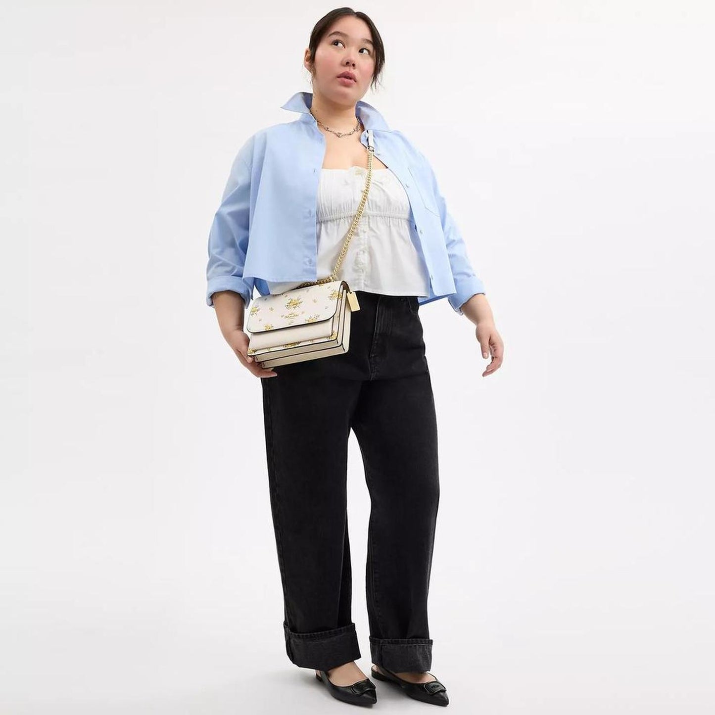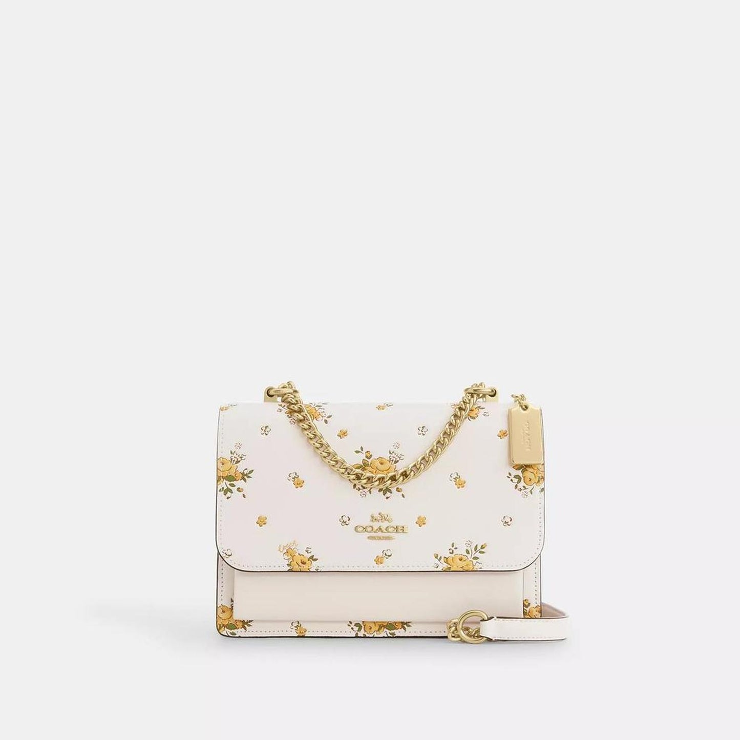 • Smooth leather Inside zip and multifunction pockets Snap closure fabric lining Outside slip pocket Strap with 22 drop doubles up for three ways to wear - short or long on the shoulder or crossbody style 8 1/2 (L) x 6 1/4 (H) x 2 3/4 (W) Style No. CAL39 | Coach Outlet Klare Crossbody Bag With Spring Blossom Print - White