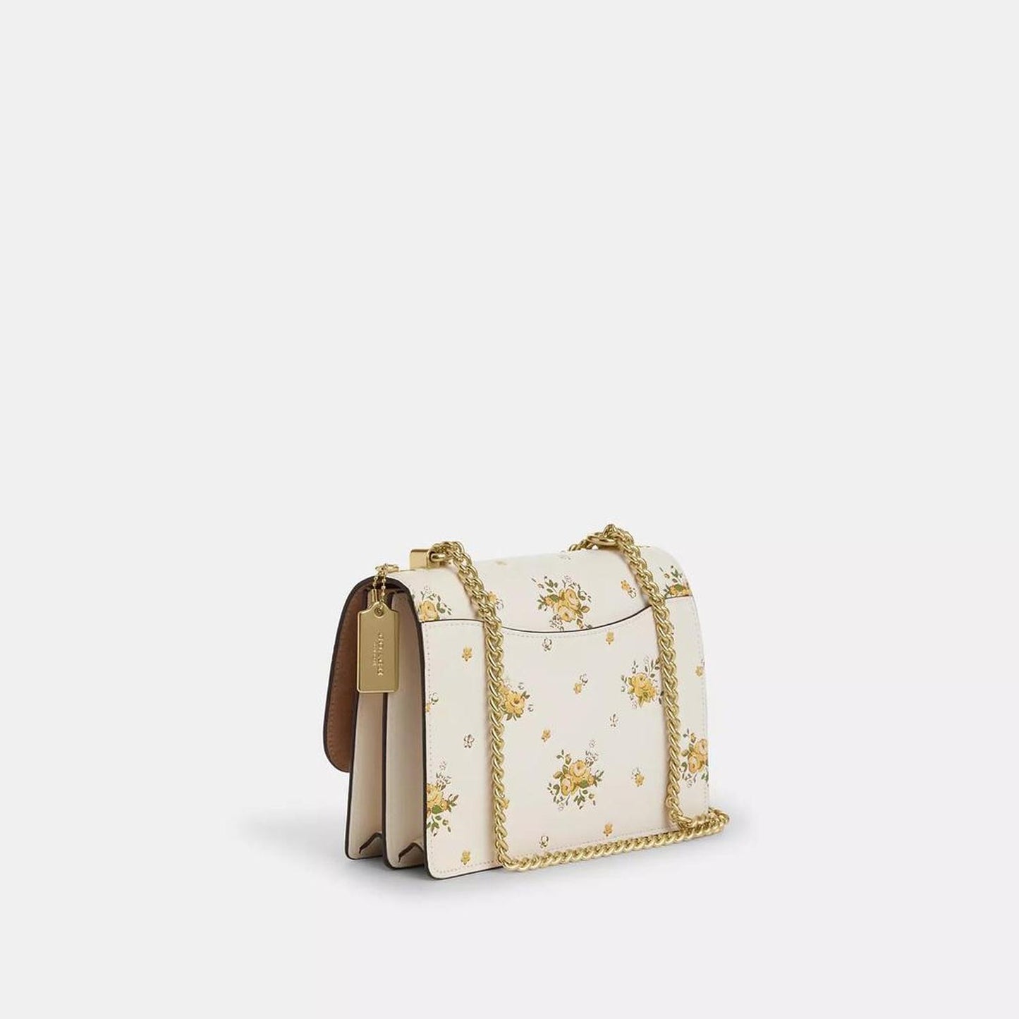 Smooth leather Inside zip and multifunction pockets Snap closure fabric lining Outside slip pocket Strap with 22 drop doubles up for three ways to wear - short or long on the shoulder or crossbody style 8 1/2 (L) x 6 1/4 (H) x 2 3/4 (W) Style No. CAL39 | Coach Outlet Klare Crossbody Bag With Spring Blossom Print - White
