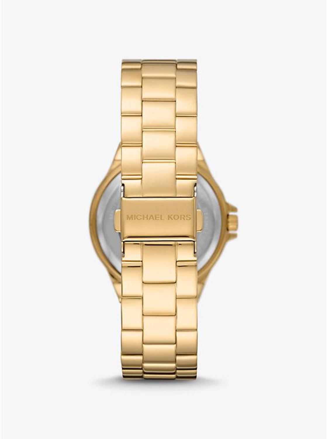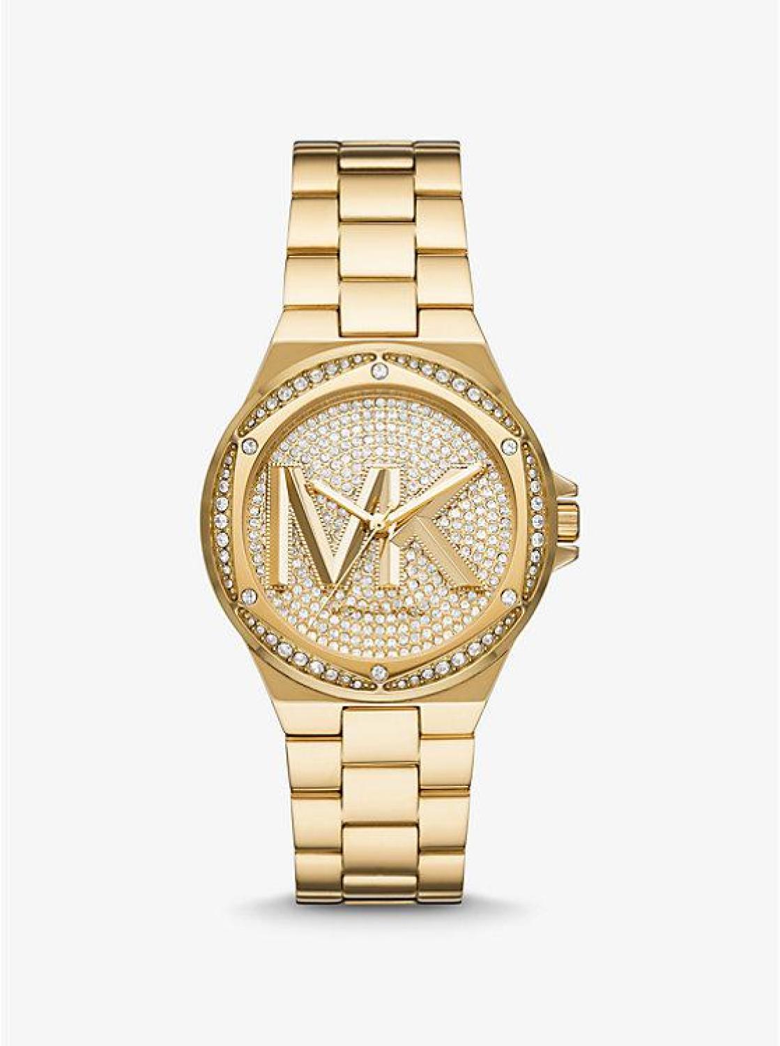 Your favorite Lennox watch gets updated with our “MK” initials for a novelty statement. It’s beautifully crafted from gold-tone stainless steel and encrusted with shimmering pavé accents for maximum impact. Consider it the perfect finishing touch to evening outfits. • Watch • Stainless steel • Gold-tone hardware • Logo and pavé topring • Mid-sized • 37mm case • Quartz/3-hand movement • Clasp fastening • Water resistant up to 5 ATM • 2-year warranty • Imported • Watch • Stainless steel • Gold-tone hardware • Logo and pavé topring • Mid-sized • 37mm case • Quartz/3-hand movement • Clasp fastening • Water resistant up to 5 ATM • 2-year warranty • Imported