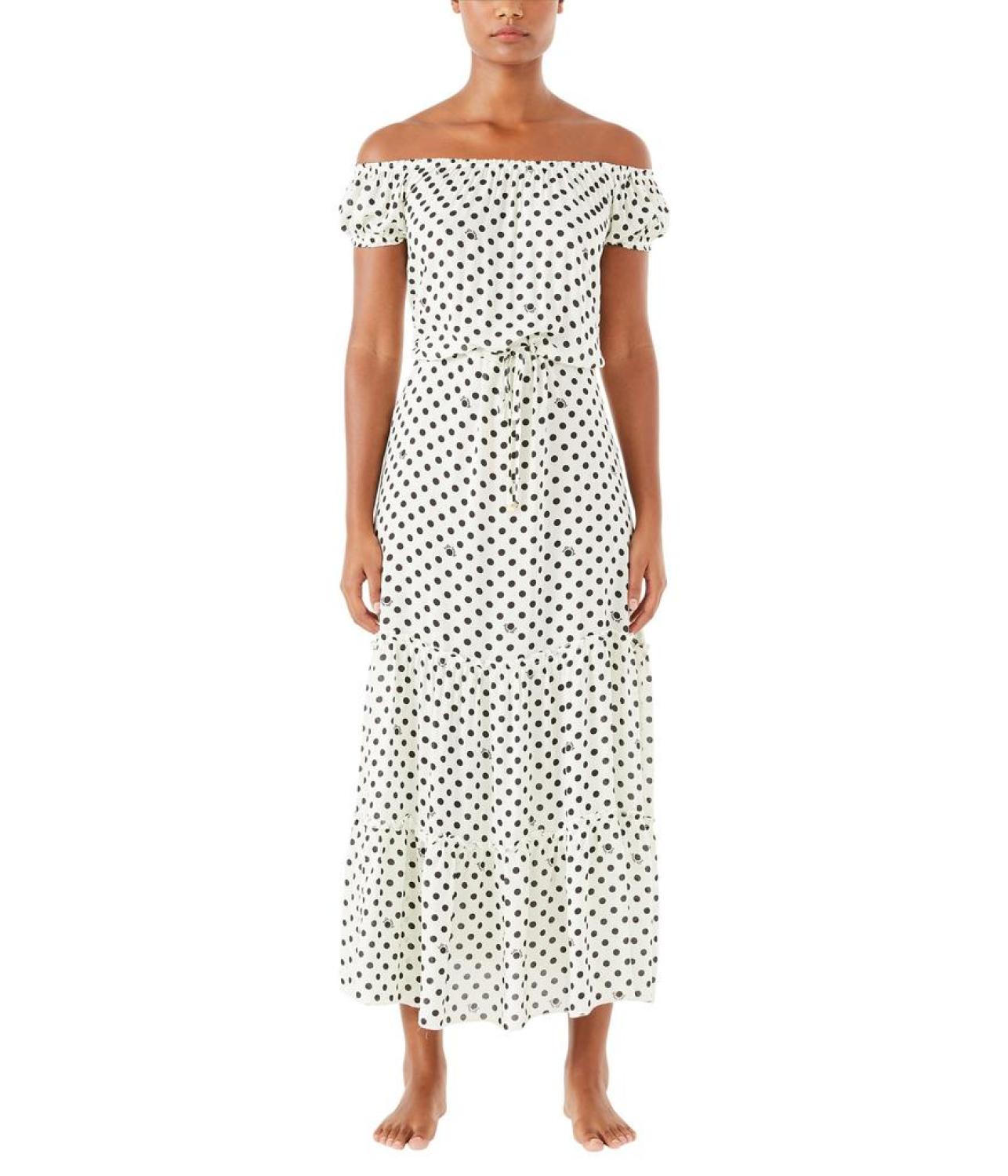 Crafted for an all day style and comfort, the Kate Spade New York ® Lia Logo Dot Off-the-Shoulder Maxi Dress features an straight neckline with off the shoulder puffed short sleeves, logo trim, tie-belt at waist, all over polka dot design, and a ruffled hemline. 100% rayon. Hand wash cold, hang dry. Imported.