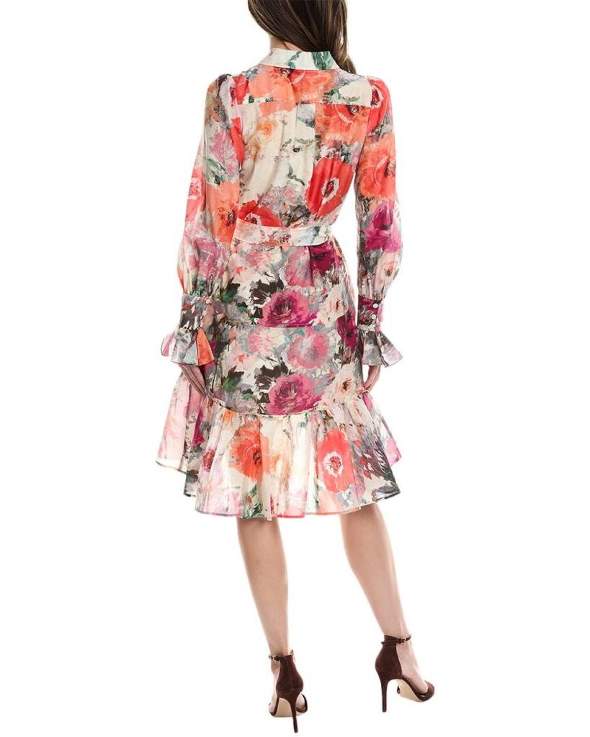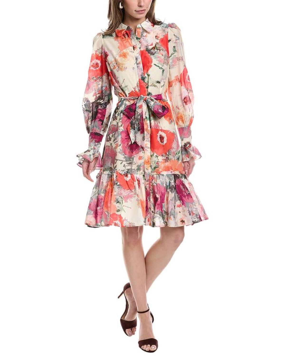 • Elevate your wardrobe with the Marchesa Notte Altheda Silk-Blend Shirtdress in ivory and multicolor. This stunning piece features puff sleeves, flounce cuffs, a tie sash at the waist, and a ruffle hem for a touch of femininity. The button front adds a sophisticated touch to this statement dress. Made from a luxurious blend of 70% cotton and 30% silk, this dress is perfect for any special occasion. Pair it with your favorite heels and accessories for a show-stopping look. Make a stylish statement with Marchesa Notte.