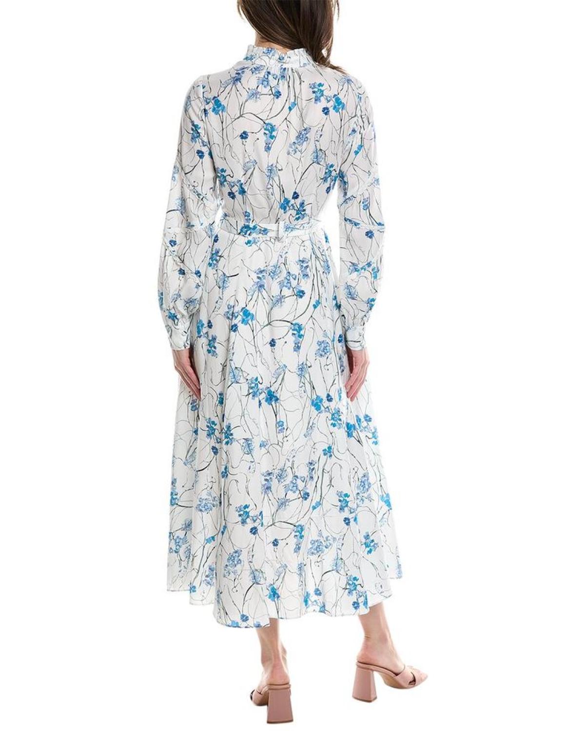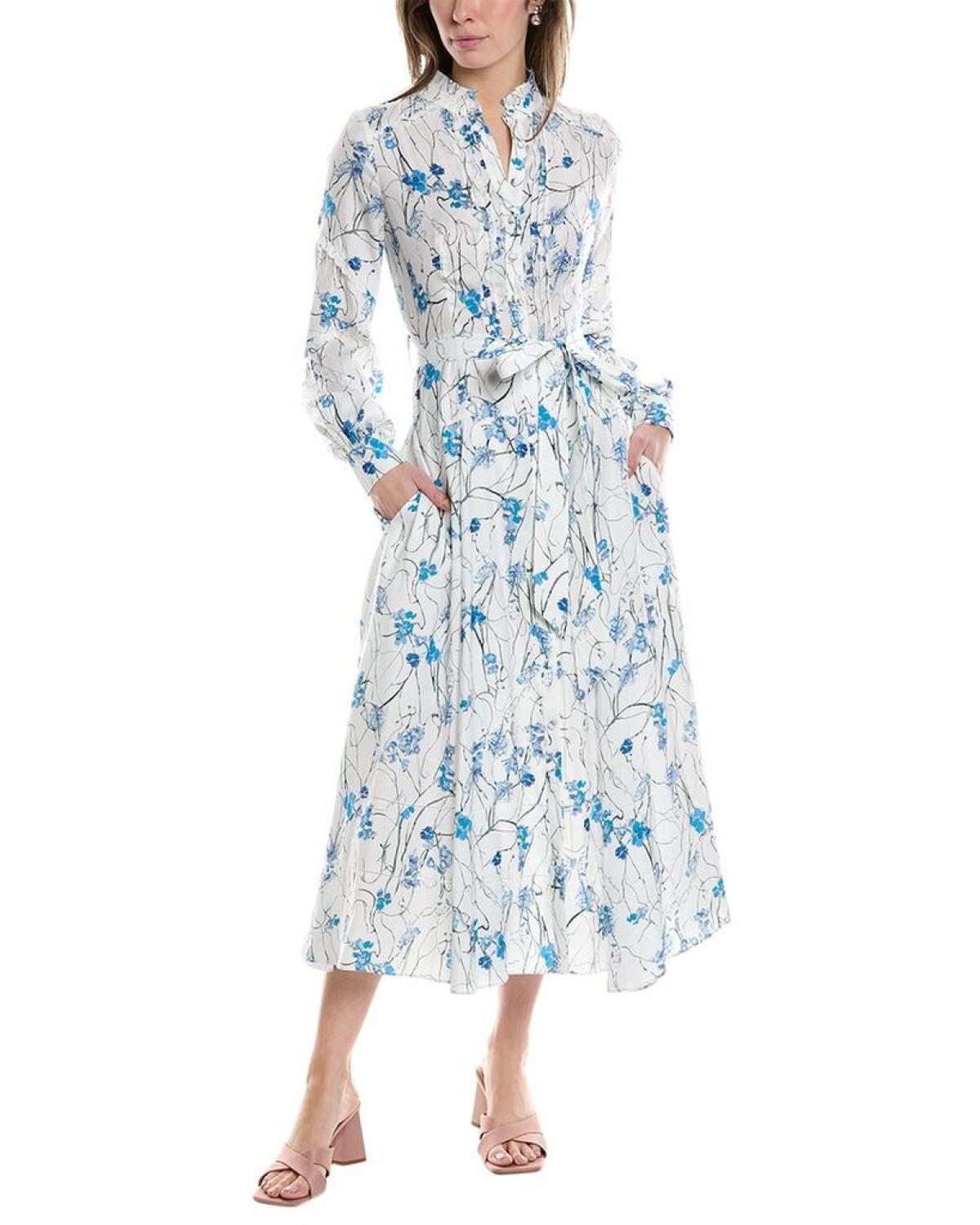 Elevate your evening look with the stunning 'Marchesa Notte Fiorella Maxi Dress'. This elegant gown features a beautiful ivory and blue sateen design with intricate embroidered scalloped edging along the mandarin collar. The bishop sleeves and side seam pockets add a touch of sophistication to this timeless piece. Perfect for your next special occasion, whether it be a formal event or a classy cocktail party. Made from 100% polyester, this dress is sure to make a statement. Dry clean only. Imported. Model is 5'9 and is wearing a size 4. Measurements may vary slightly by size. Elevate your wardrobe with Marchesa Notte.