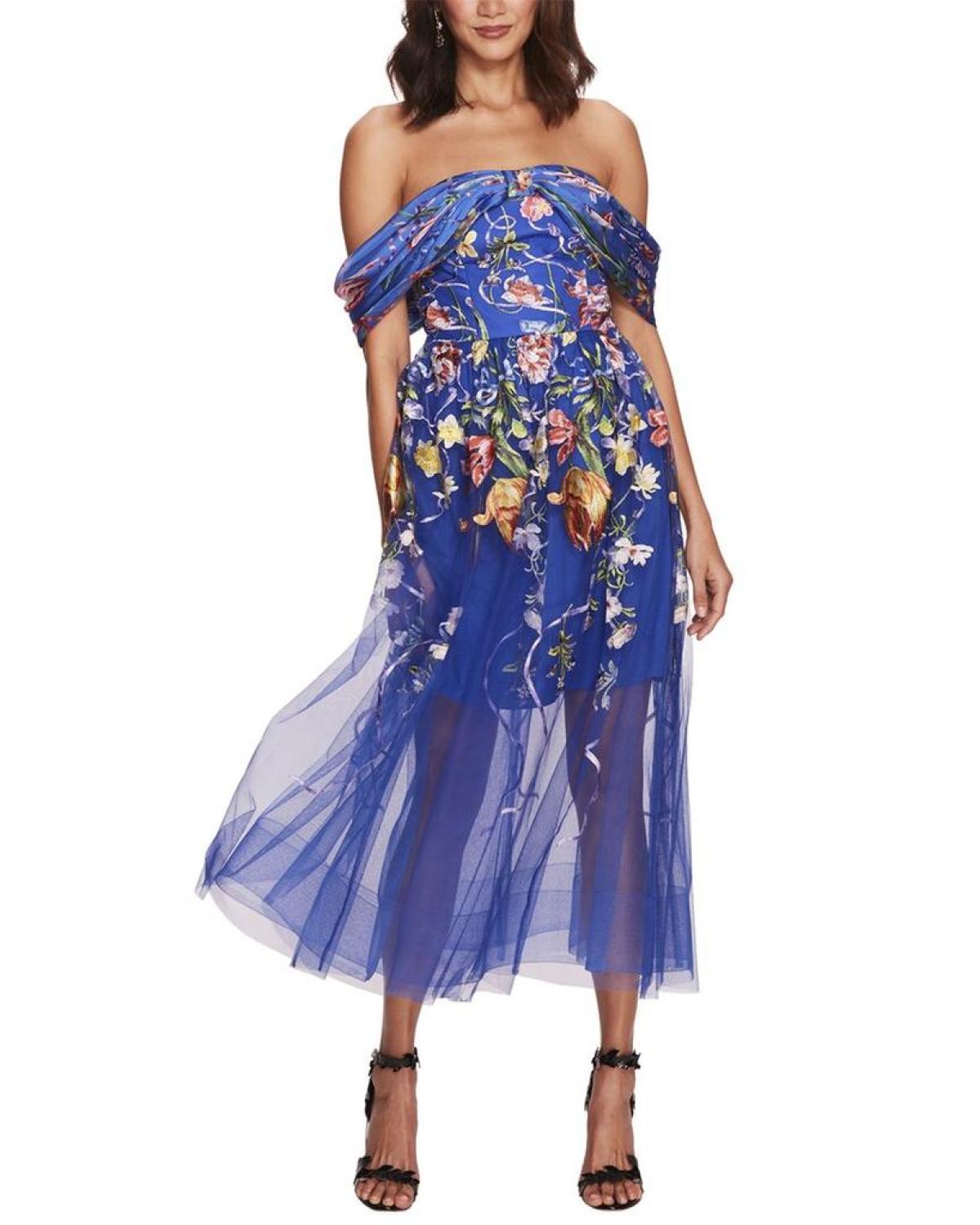 Elevate your evening wear with the Marchesa Notte Mini Dress. This stunning piece from the renowned brand features a flattering silhouette and exquisite detailing, perfect for special occasions. The mini dress in blue is crafted from 100% polyester and features a center back zipper for easy wear. With a length of approximately 50 inches from shoulder to hem, this dress is ideal for gowns and cocktails for that special night. Dry clean only. Imported.