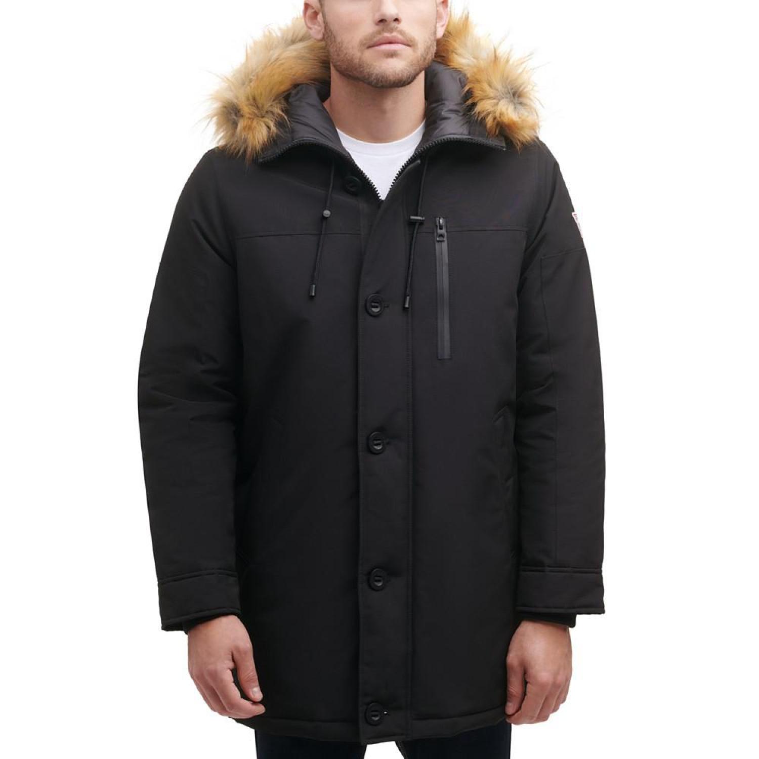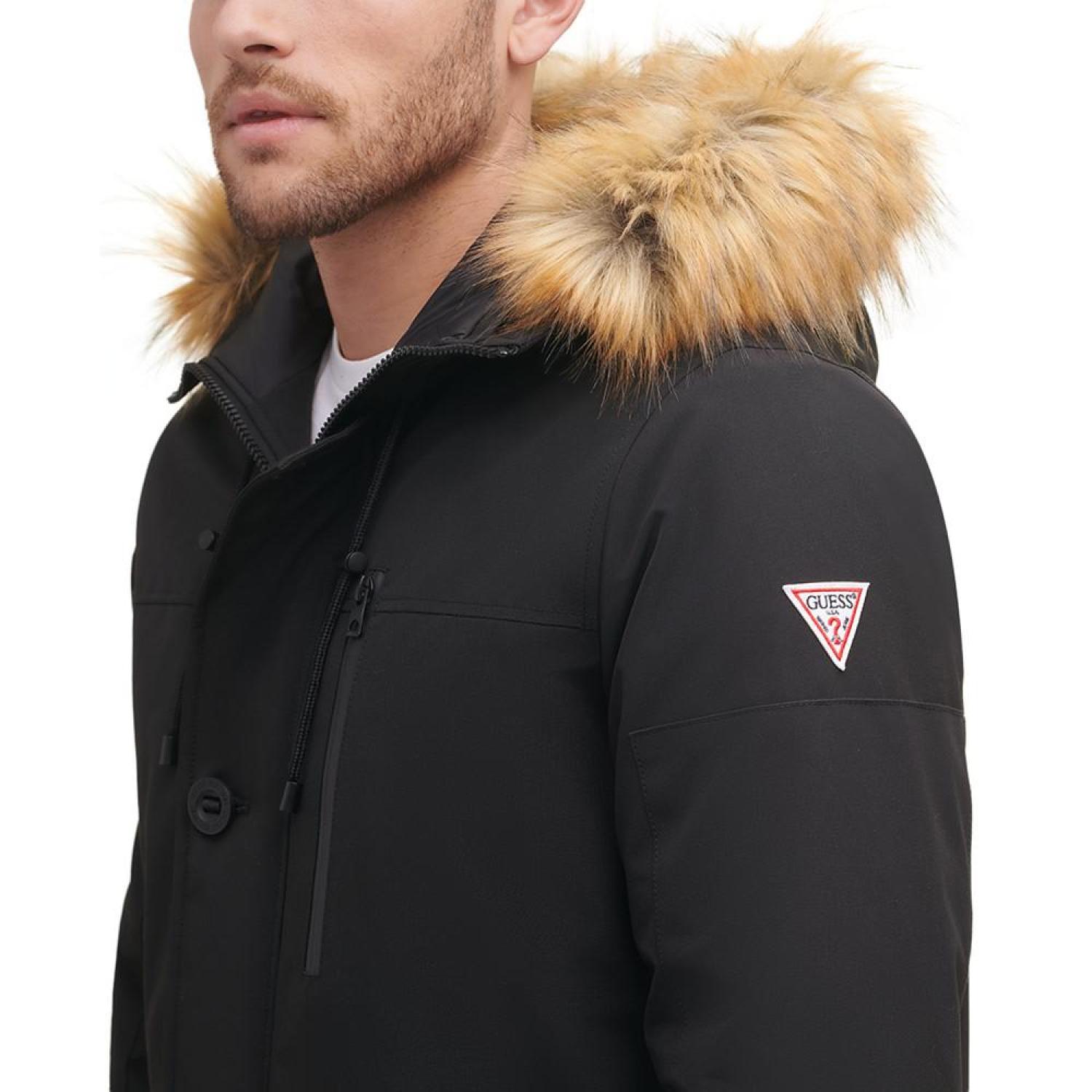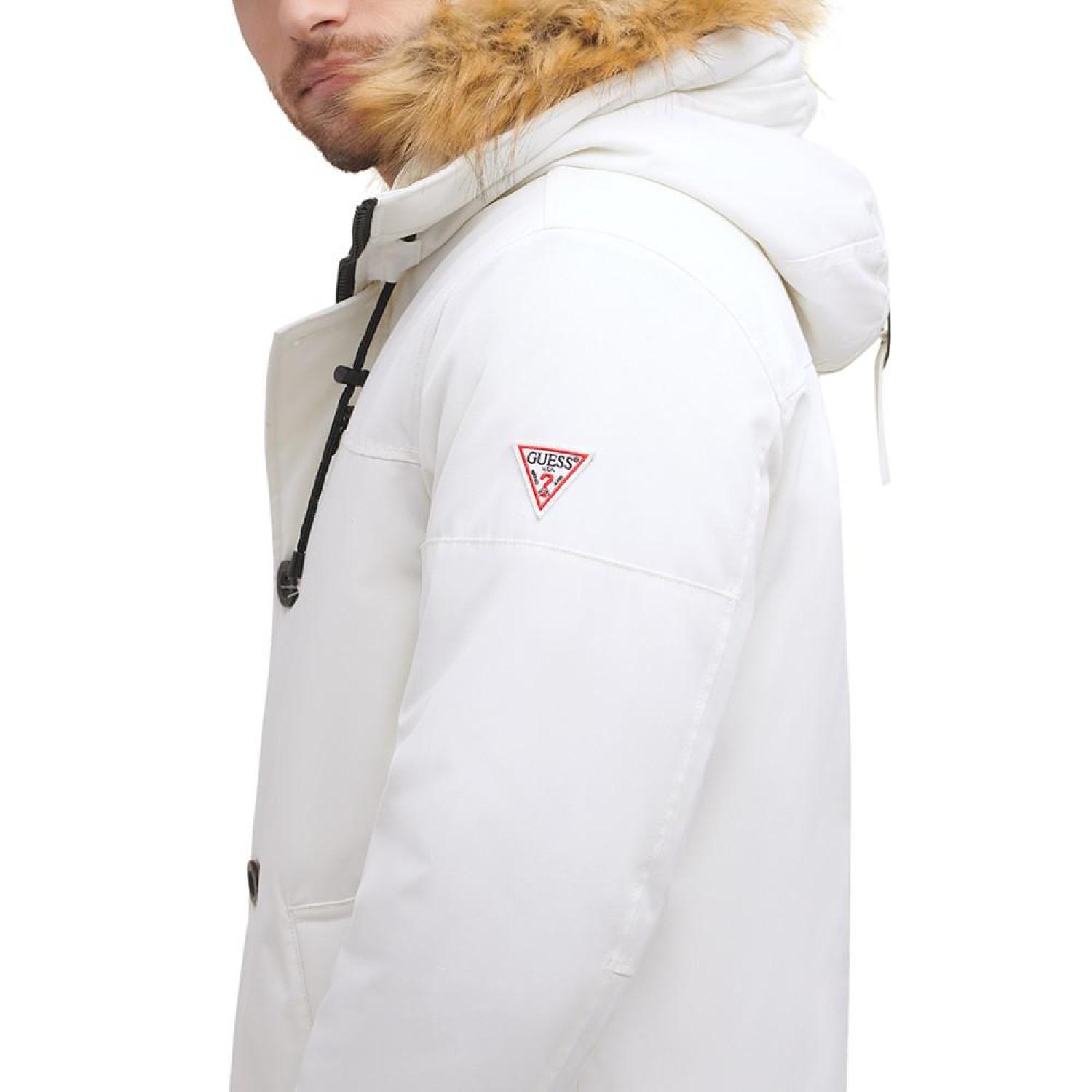 GUESS heavy weight hood snorkel jacket with faux fur trim hood. Faux fur hood Heavy polyfill Wind resistant fabric Polyester Machine washable Imported