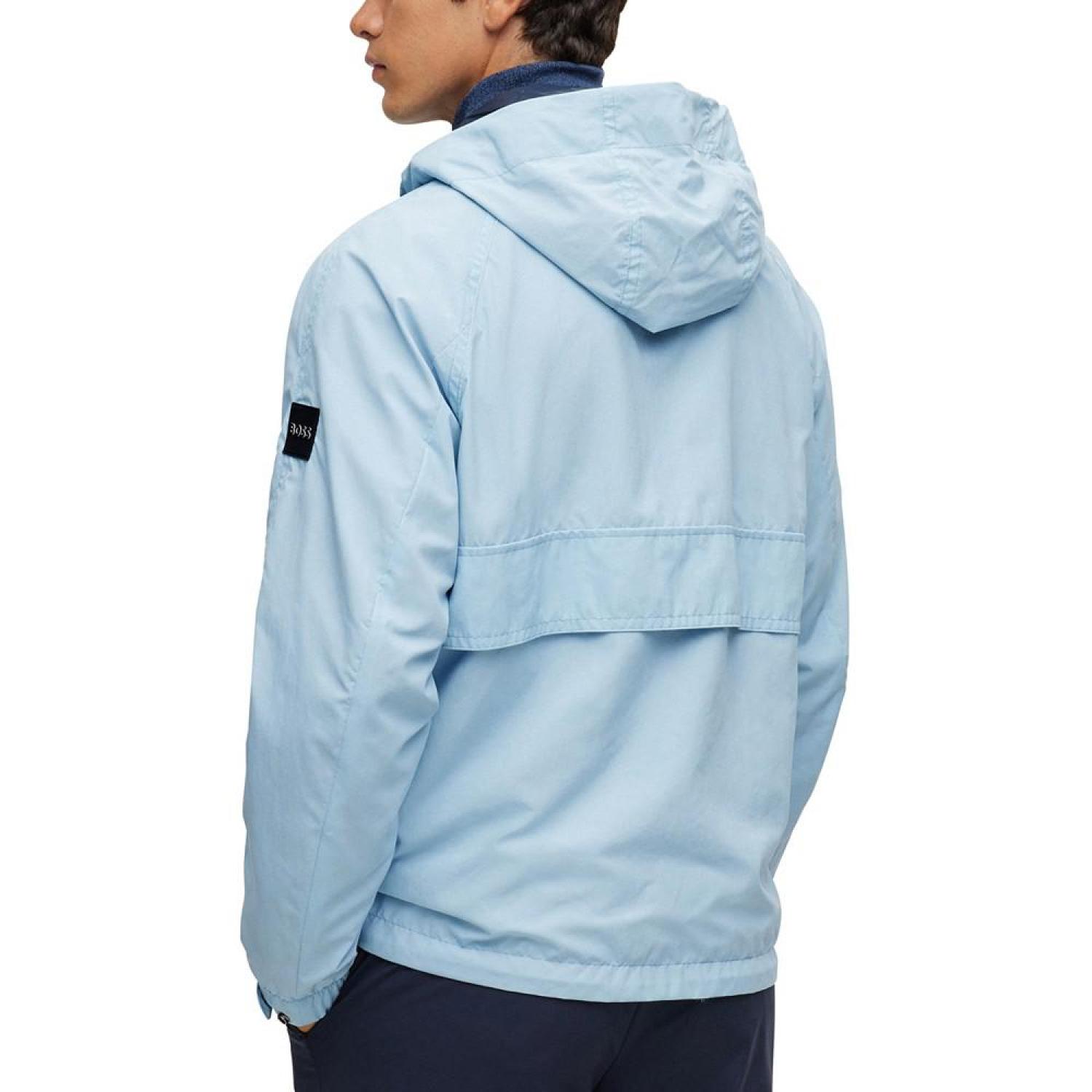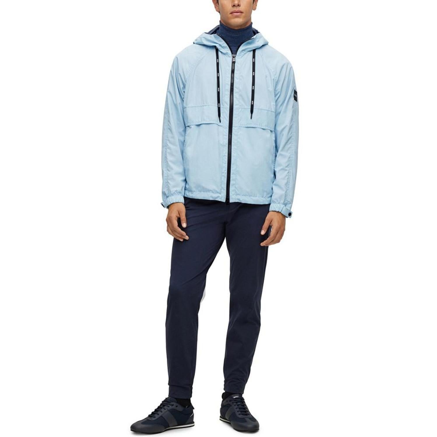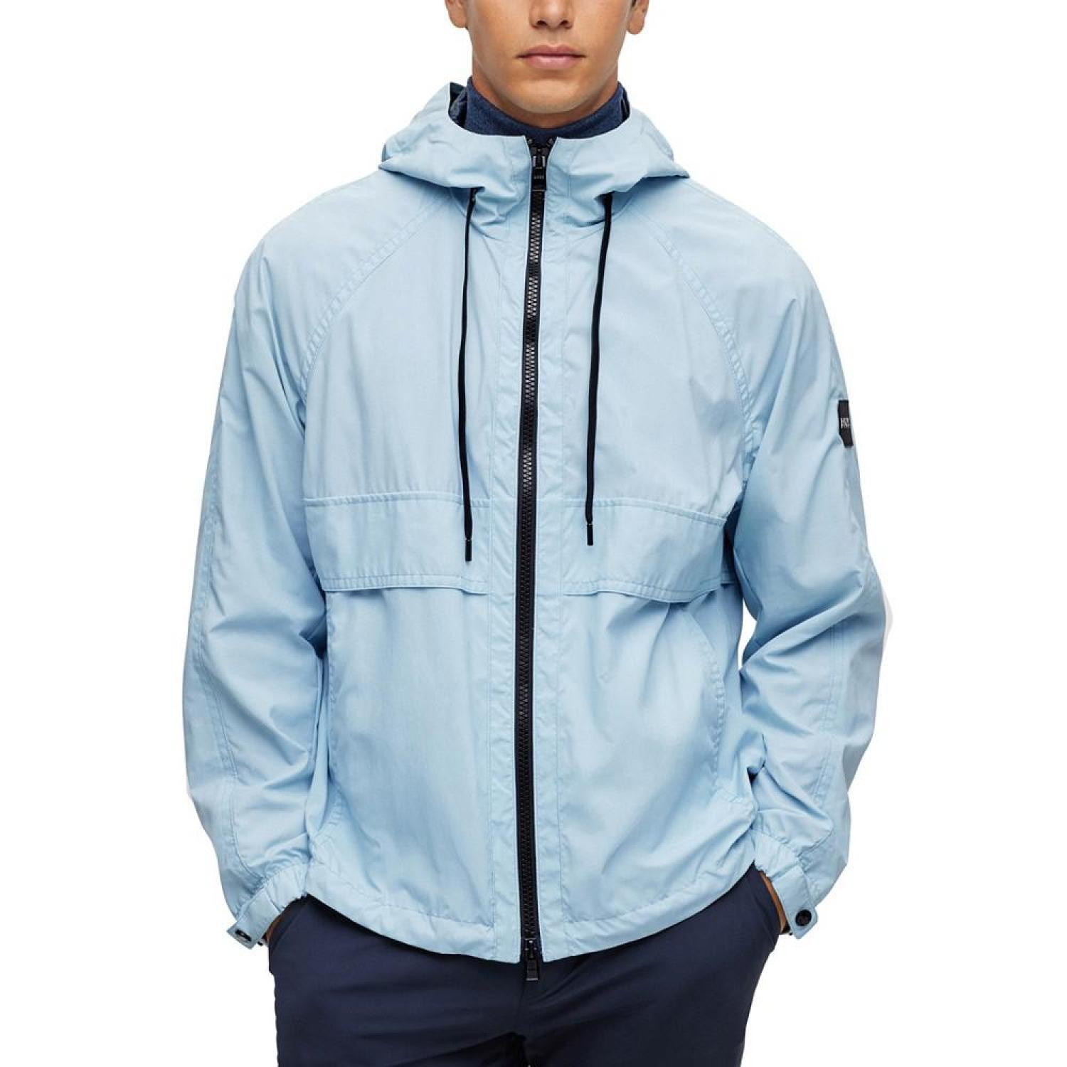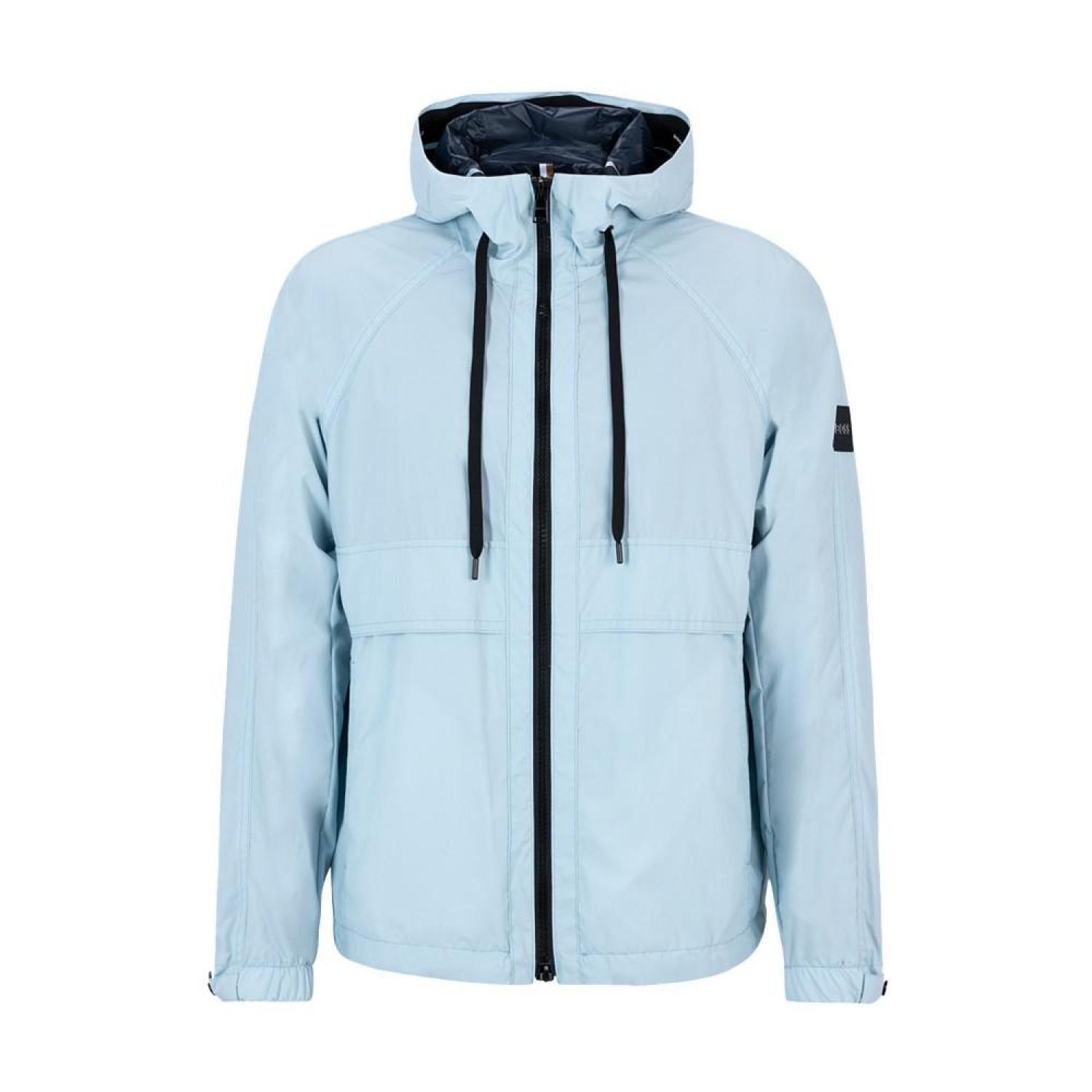 • A sporty jacket by BOSS menswear. Cut to a regular fit for an easy silhouette, this zip-up jacket is crafted in UV (Ultraviolet) -reactive fabric with a logo print that becomes visible in the sun. A branded silicone badge and woven logo cords add signature appeal to this hooded layer.