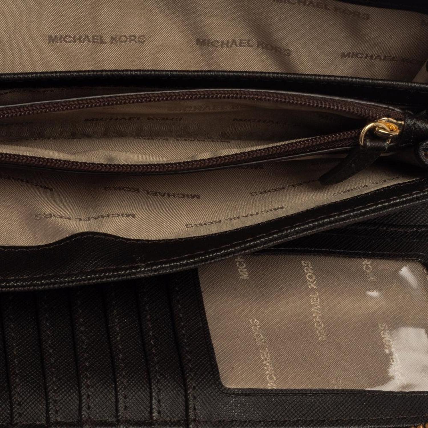 A compact and practical option to store your handy essentials this Michael Kors wallet is crafted from monogram canvas. It has a zip around closure the brand logo on the front and is equipped with multiple card slots and a zip pocket in the leather and nylon interior.