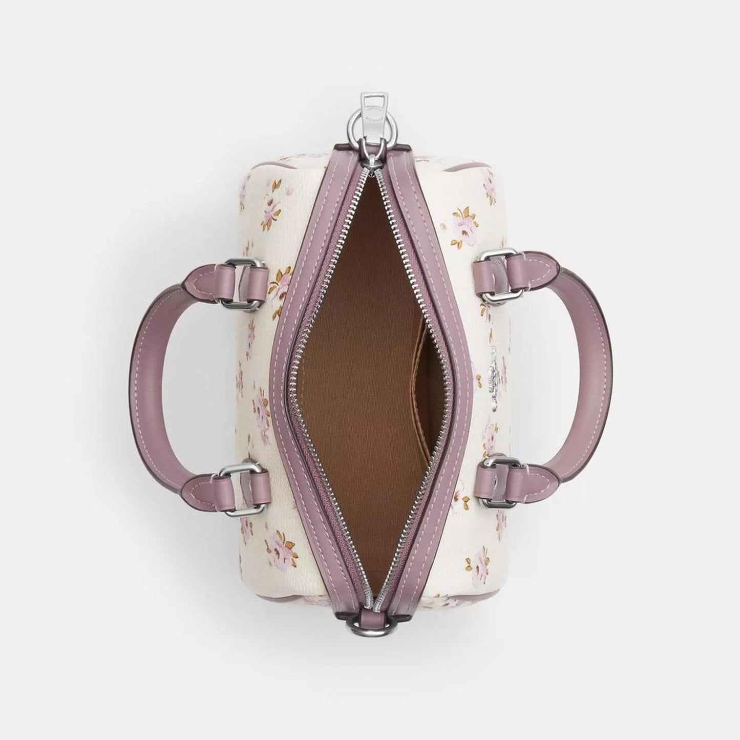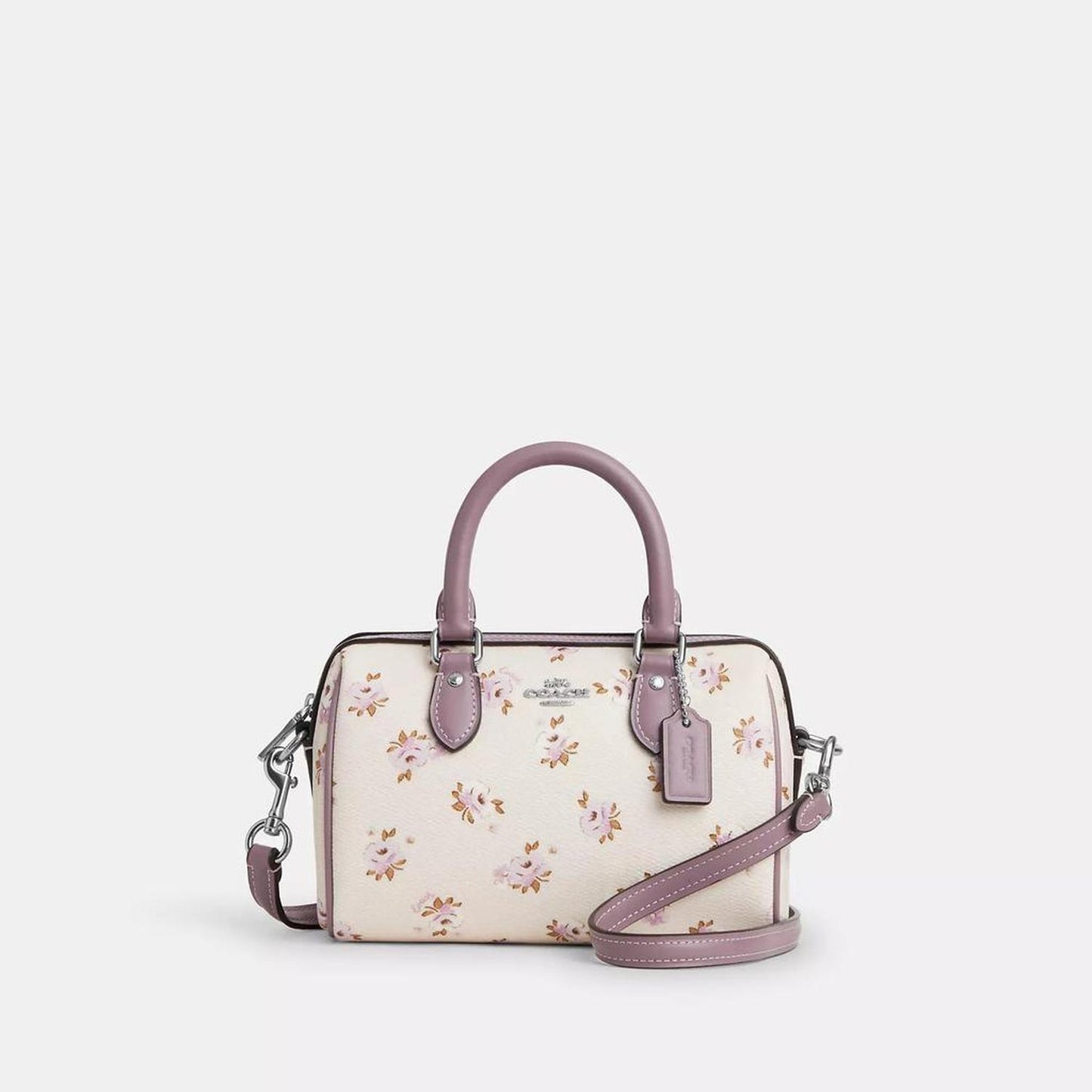 • Printed coated canvas Two credit card slots Zip-top closure fabric lining Handles with 2 3/4 drop Detachable strap with 23 1/2 drop for shoulder or crossbody wear 7 (L) x 4 3/4 (H) x 4 (W) Style No. CAL69 | Coach Outlet Mini Rowan Crossbody Bag With Floral Print - Multi/Purple
