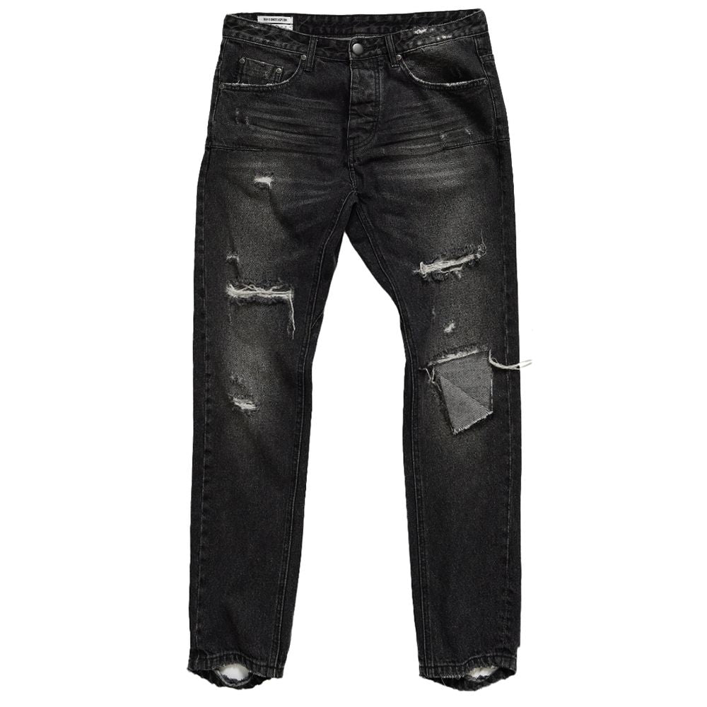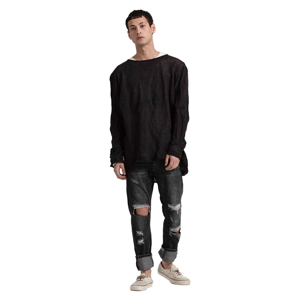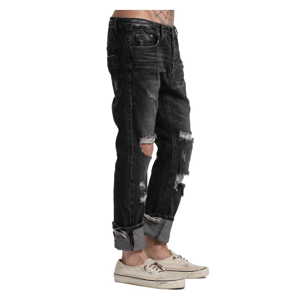 One Teaspoon men’s black jeans with a regular fit, straight leg with slight neckline. Made of rigid denim, this model features distressed effects mainly on the front panels. Black Sea is a faded black denim wash-