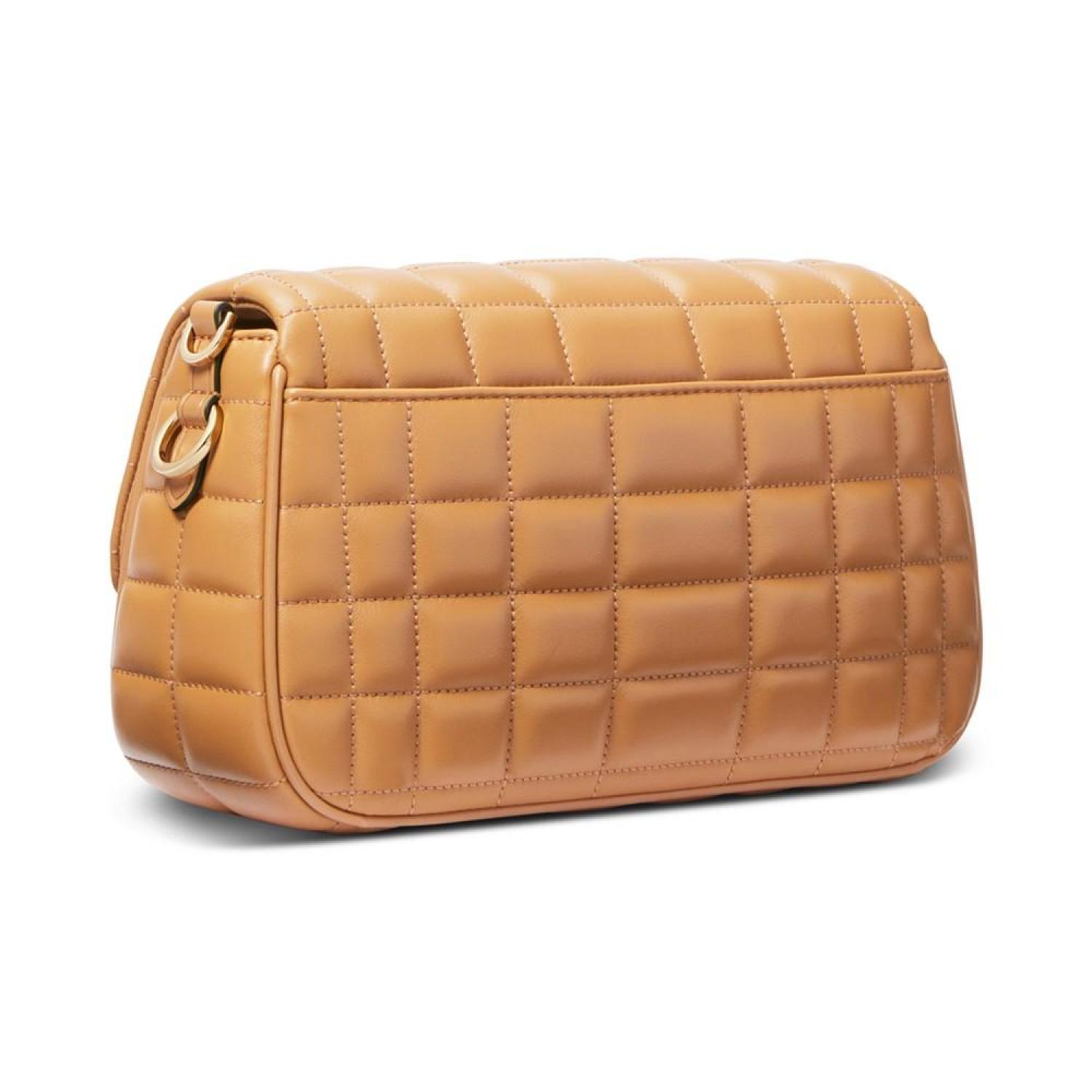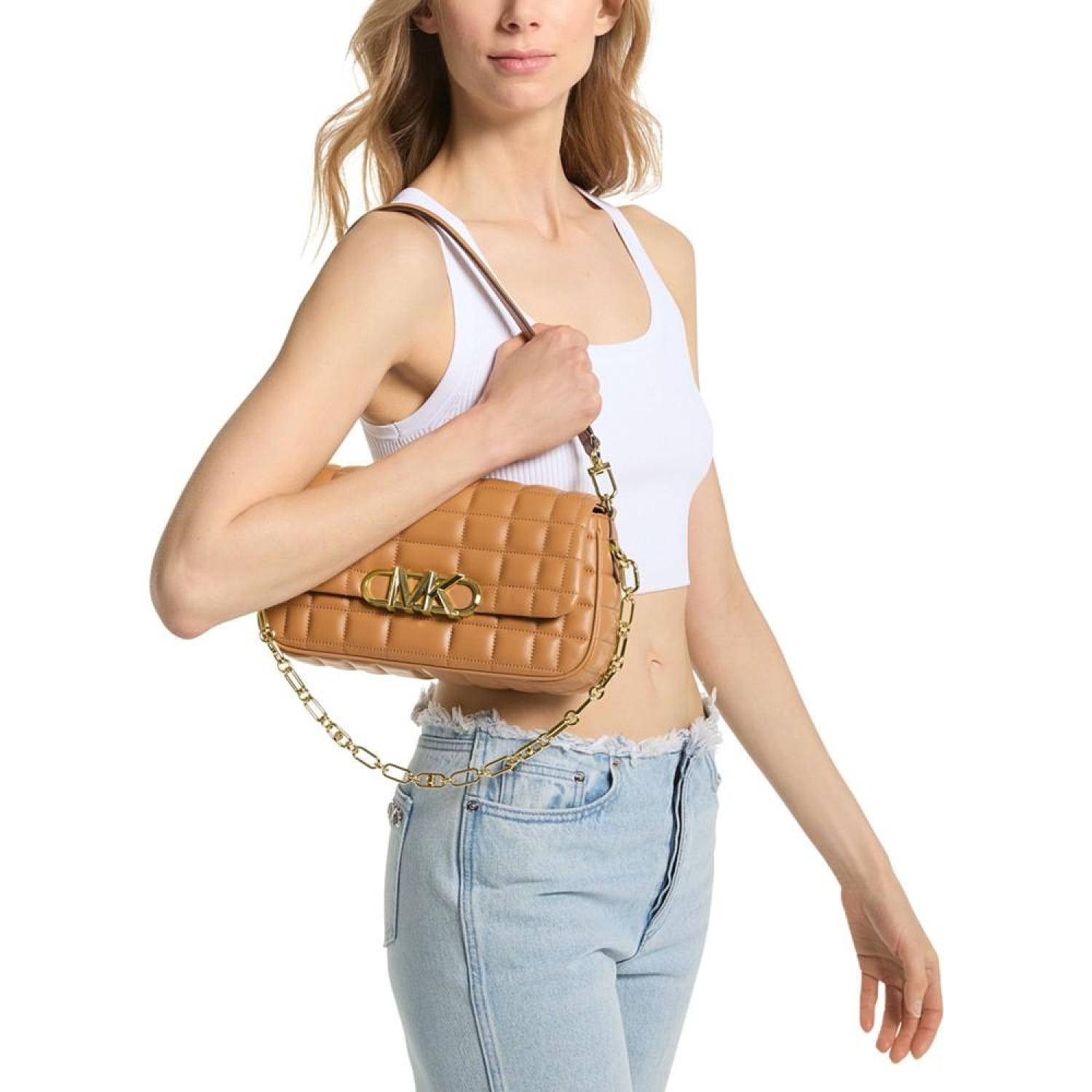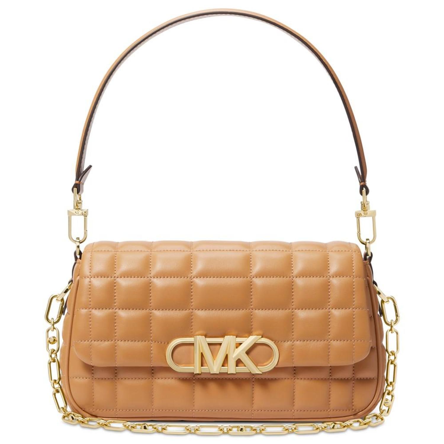 Crafted in leather with allover quilting, this pouchette by MICHAEL Michael Kors makes a statement with its bright metal logo and chic chain handle. Small sized bag; 10-3/4"W x 6-1/4"H x 4"D (width is measured across the bottom of handbag) Silhouette is based off 5'9" model 8-1/2"L handle; X"L strap Flap with magnetic snap closure Gold-tone hardware, exterior back slip pocket & metal logo Interior slip pocket Leather; lining: polyester; trim: polyurethane, cotton, polyester Spot clean Imported