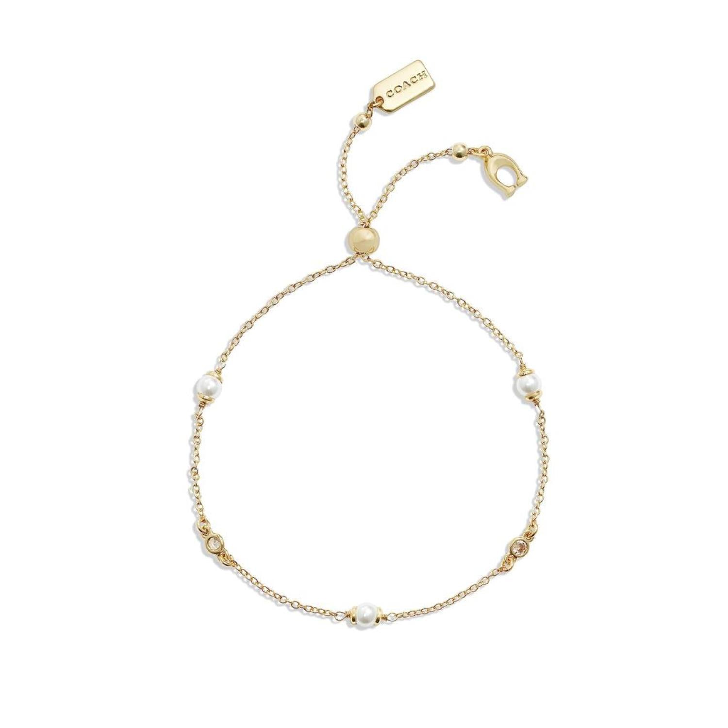 Adorn your wrist with sublime elegance wearing the COACH™ Pearl Slider Bracelet. This exquisite piece of jewelry harmoniously blends the timeless beauty of pearls with the dazzling brilliance of glistening Stones. Made from brass, glass crystal, and imitation glass pearl. Refined chain slider bracelet featuring delicate pearls and glistening stones. Adjustable slider closure. Includes signature pouch. Imported. Measurements: Weight: 0.1 oz