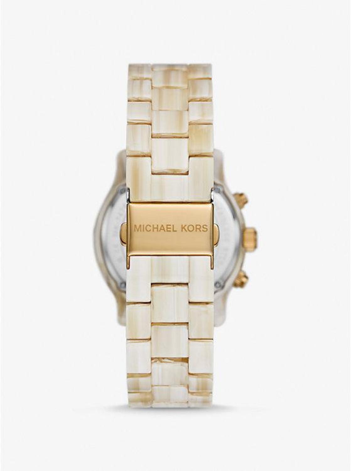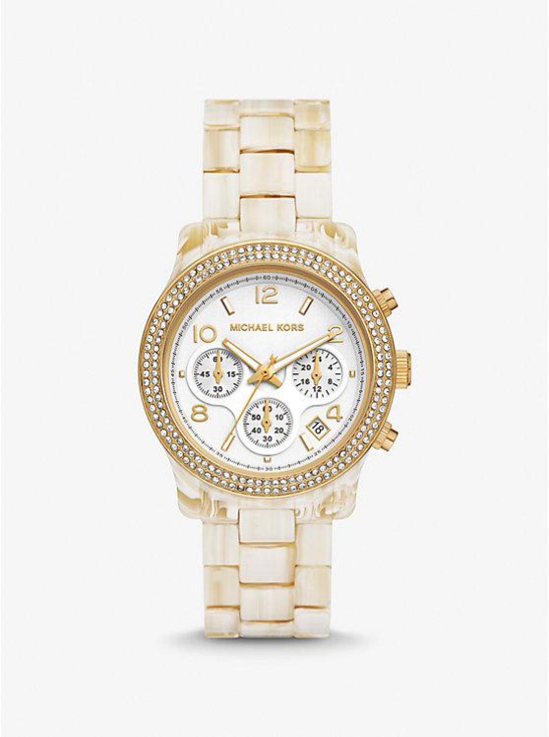 • The perfect finishing touch to every outfit, our new Runway watch will be a favorite for years to come. Updated with raised sub dials, this dazzling style is crafted from gold-tone stainless steel and versatile, alabaster-hued acetate with a pavé-embellished bezel, and features chronograph details for precise timekeeping.