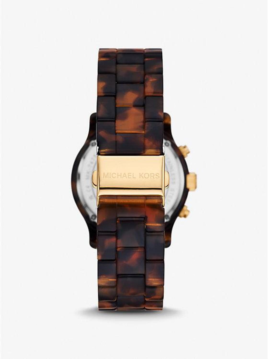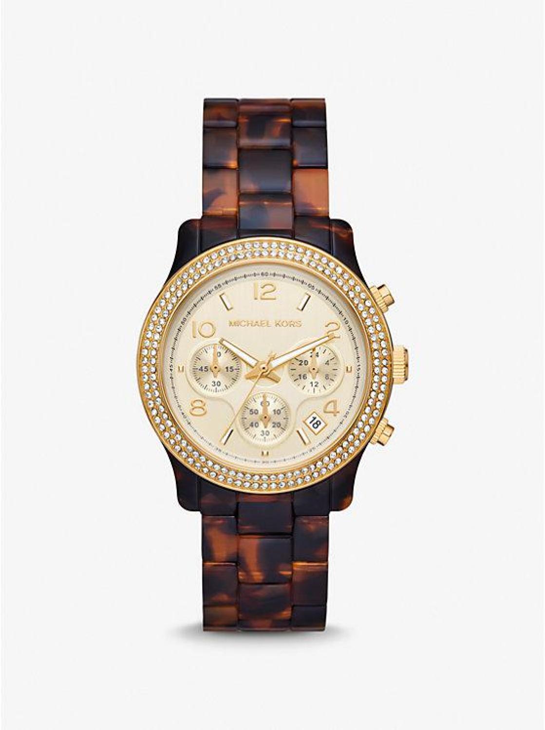 The perfect finishing touch to every outfit, our new Runway watch will be a favorite for years to come. Updated with raised sub dials, this dazzling style is crafted from gold-tone stainless steel and rich, tortoise-hued acetate with a pavé-embellished bezel, and features chronograph details for precise timekeeping. • Mid-sized watch • Stainless steel/tortoise • Gold-tone hardware • Mid-sized • 38mm case • Quartz/3-hand movement • Clasp fastening • Water resistant up to 5 ATM • 2-year warranty • Imported • Mid-sized watch • Stainless steel/tortoise • Gold-tone hardware • Mid-sized • 38mm case • Quartz/3-hand movement • Clasp fastening • Water resistant up to 5 ATM • 2-year warranty • Imported