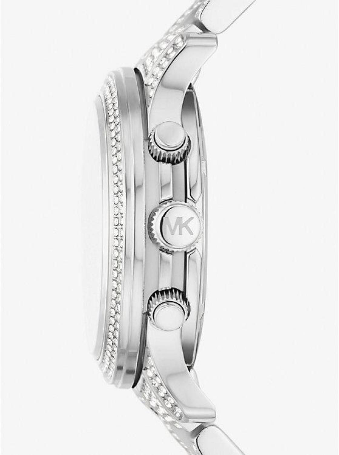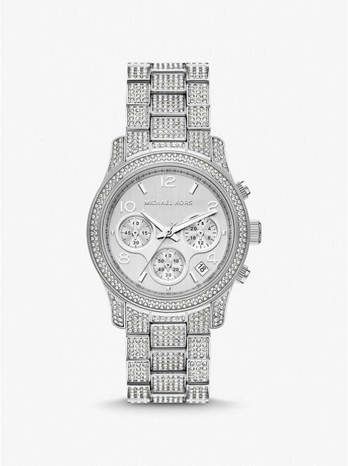 • The ultimate finishing touch for everyday glamour, our new Runway watch is defined by a shimmering pavé-encrusted bezel and bracelet strap to dial up the drama. Updated with raised sub dials, this dazzling style is crafted from silver-tone stainless steel and features chronograph details for precise timekeeping. Wear it alone, or stacked for next-level arm candy.