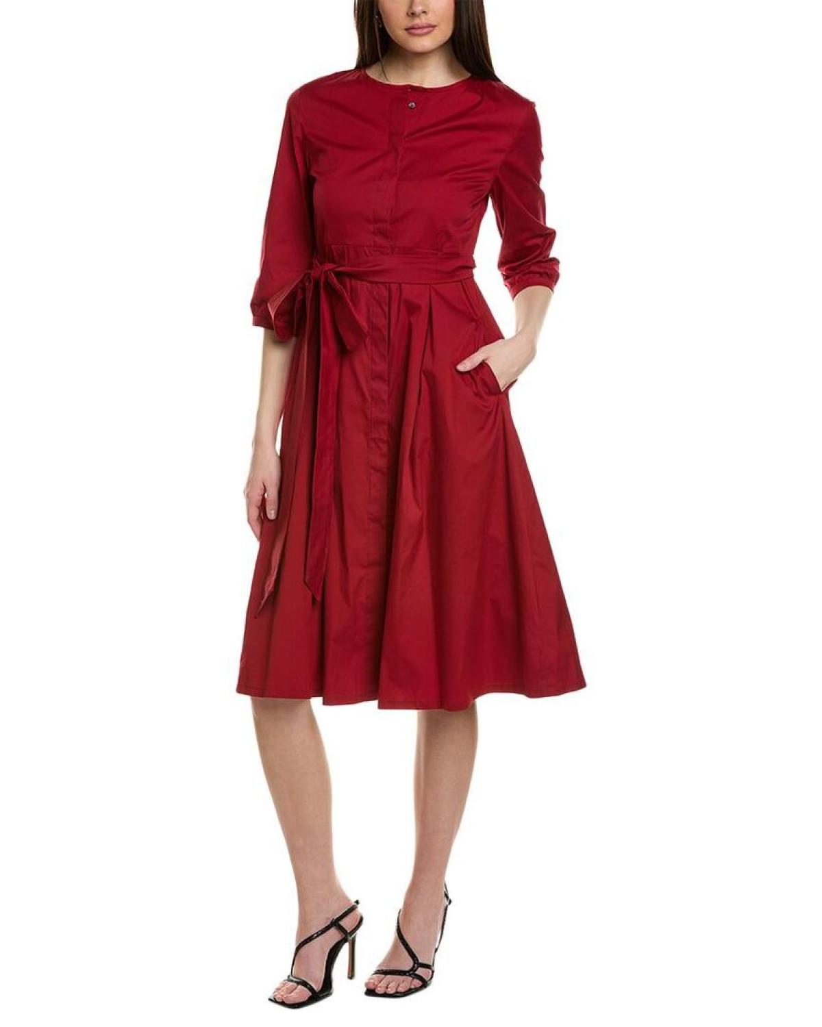 Introducing the 'S Max Mara Gloria Shirtdress' from the renowned brand Max Mara. This stunning dark red dress features a pleated skirt, tie sash at the waist, and convenient side seam pockets. The button-front design gives it a classic look while the blend of 80% cotton, 18% nylon, and 2% elastane ensures a comfortable fit. Measuring approximately 44 inches from shoulder to hem, this dress is perfect for any occasion. Machine washable and imported, this dress is a must-have addition to any wardrobe. Model is 5'11 and is wearing a size 2. Please note that measurements may vary slightly by size.