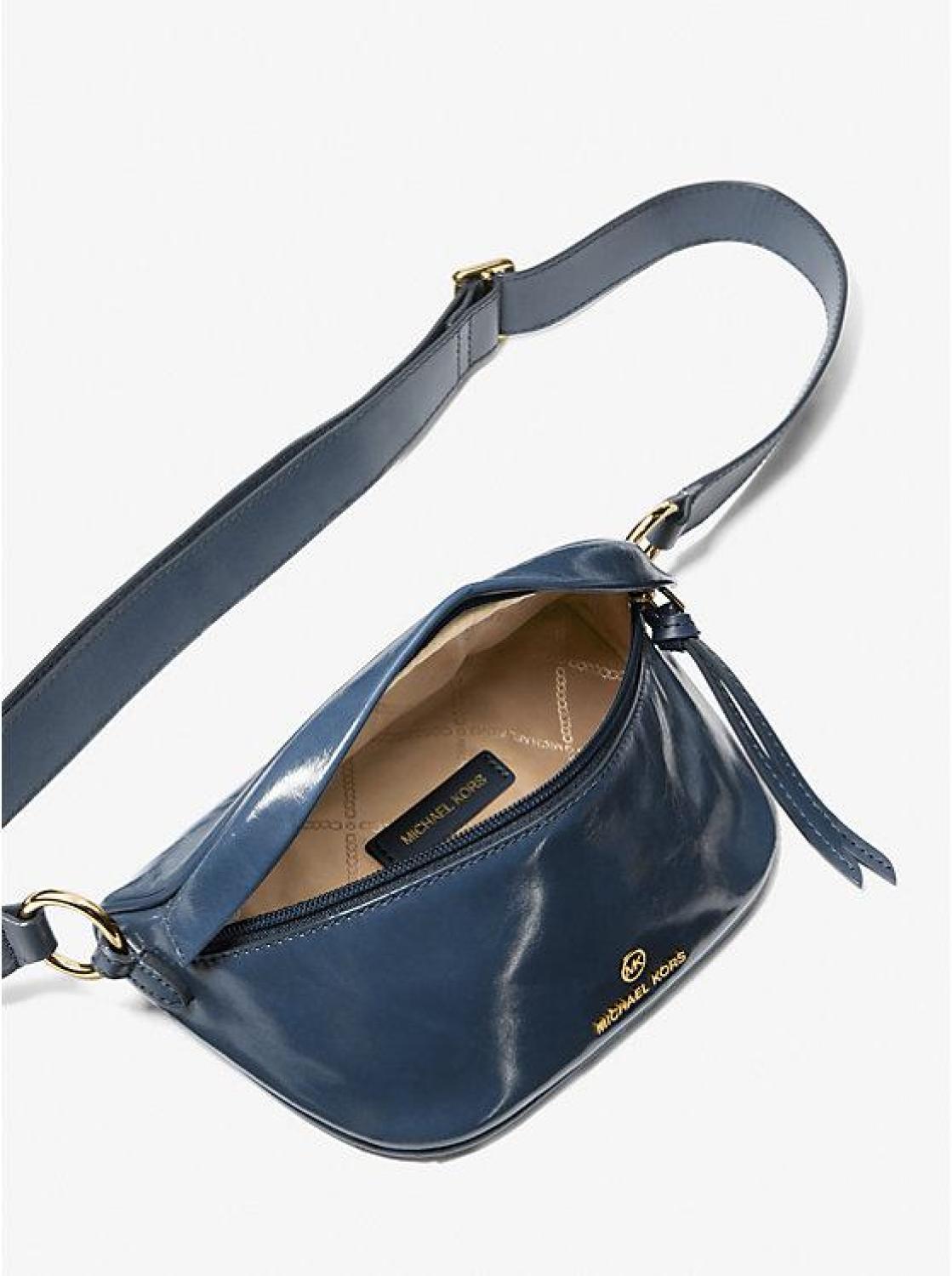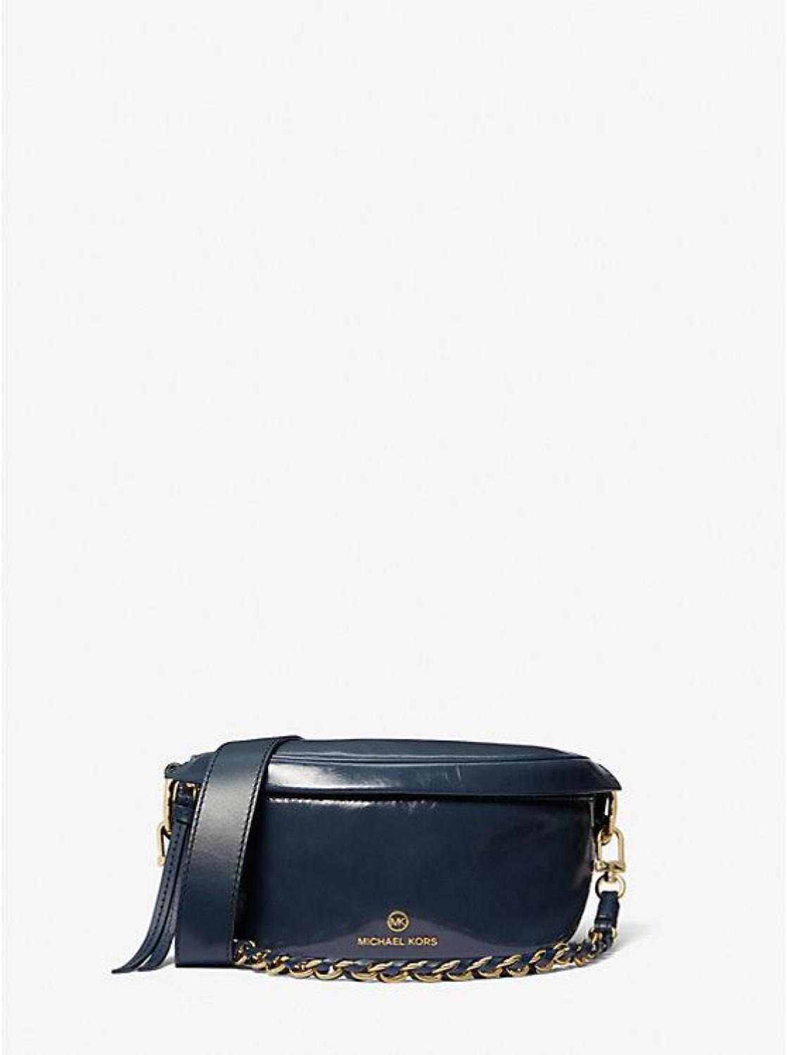Introducing our beloved Slater sling pack, reimagined in a new and compact silhouette. Featuring a removeable braided chain strap, this modern messenger bag is crafted from glossy patent leather for a refined sensibility. We love how the gilded hardware accents lend luxe appeal to every look.