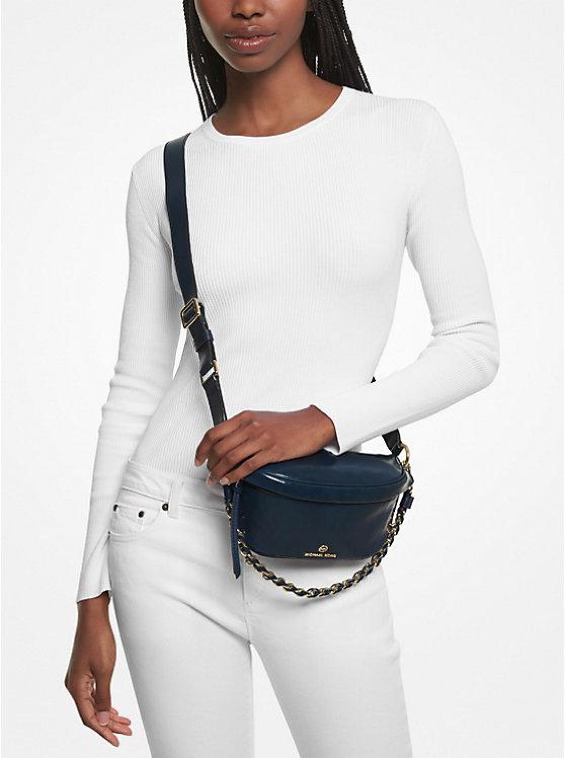 • Introducing our beloved Slater sling pack, reimagined in a new and compact silhouette. Featuring a removeable braided chain strap, this modern messenger bag is crafted from glossy patent leather for a refined sensibility. We love how the gilded hardware accents lend luxe appeal to every look.