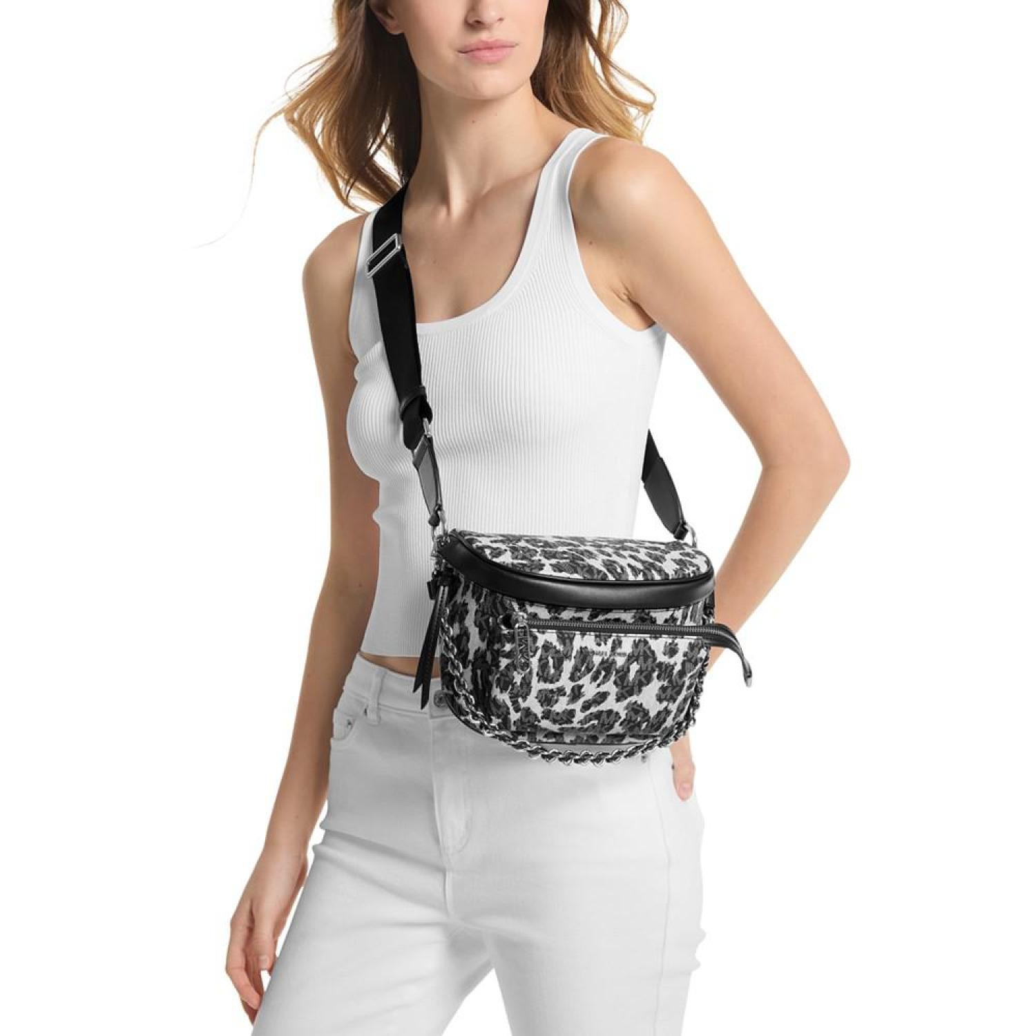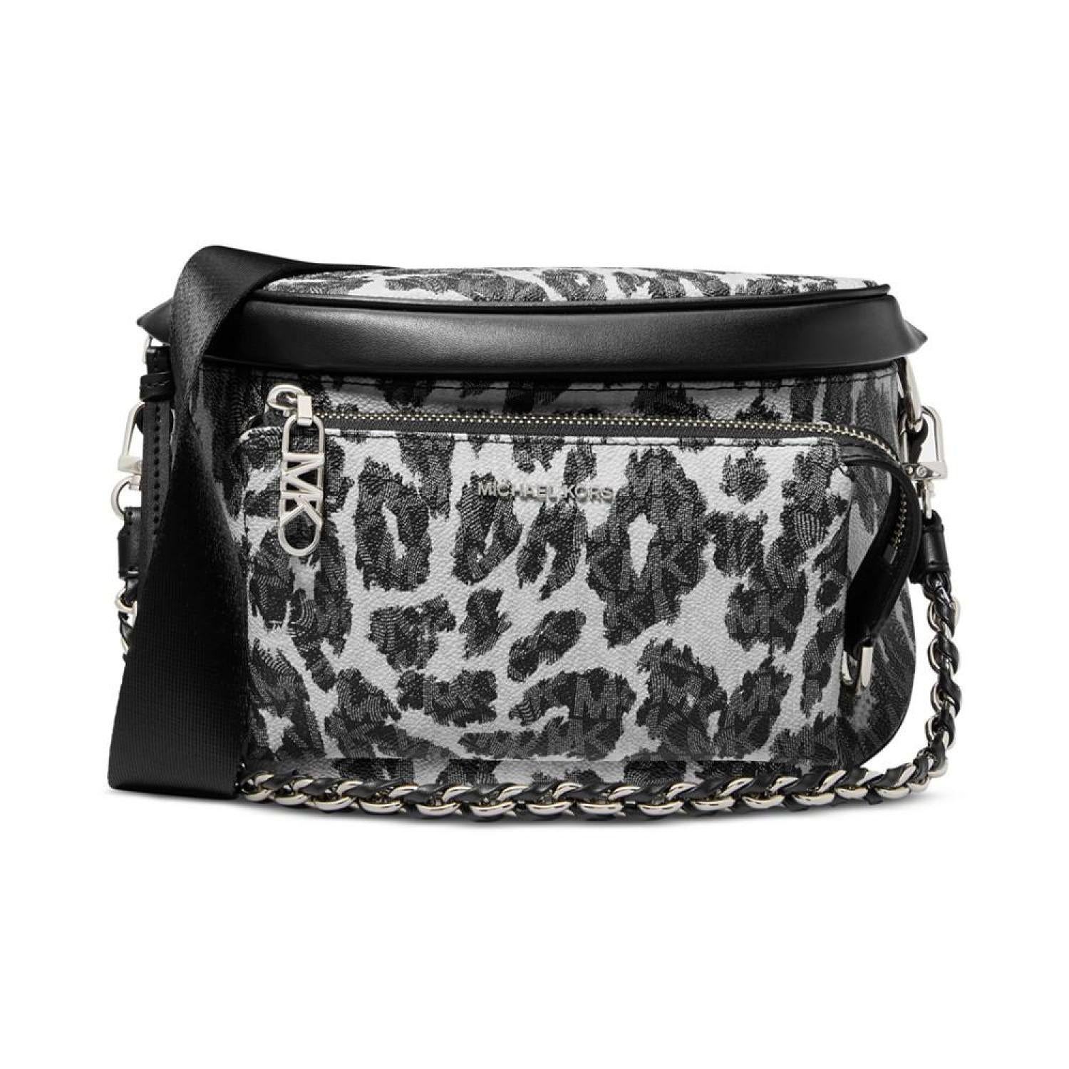 Level up your handsfree style with this sling pack by MICHAEL Michael Kors featuring signature hardware and animal print. Small sized bag; 10"W x 7"H x 4-1/2"D (width is measured across the bottom of handbag); 1.14 lbs. approx. weight Silhouette is based off 5'9" model 10"L handle; 21"L adjustable, removable strap Zippered closure Silver-tone hardware & exterior front zip pocket PVC, cotton; trim 1: polyurethane, cotton, polyester; trim 2: nylon Spot clean Imported