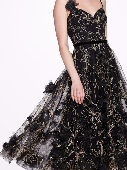 • The essence of beauty, this tea-length gown in black features a sleeveless v-neckline, gold and glitter tulle, and a black velvet belt detail.Model is wearing size US 0.