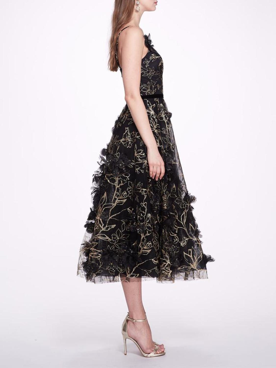 The essence of beauty, this tea-length gown in black features a sleeveless v-neckline, gold and glitter tulle, and a black velvet belt detail.Model is wearing size US 0.