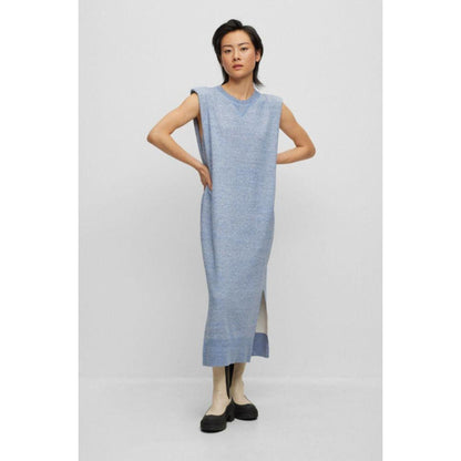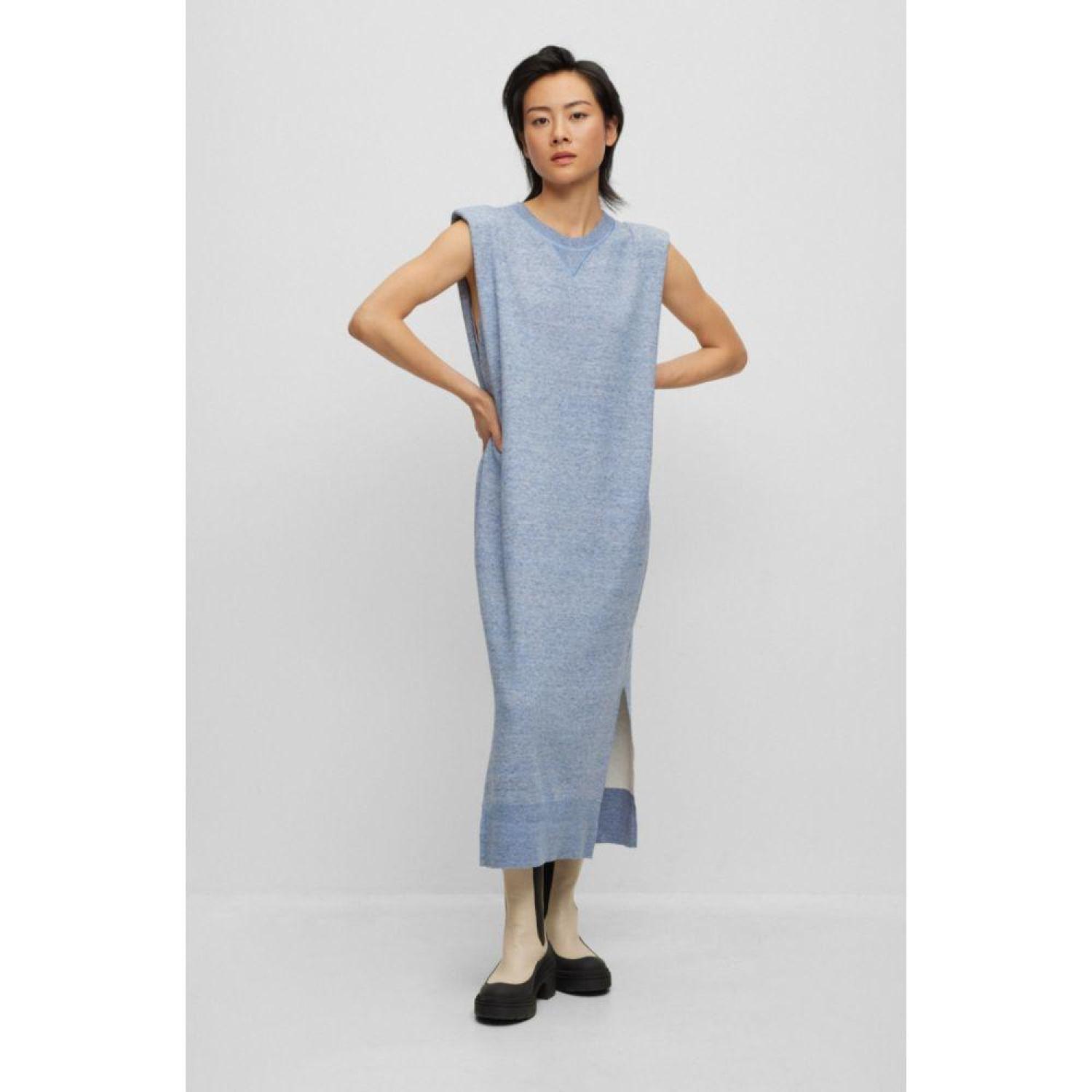 • An easy-wear sleeveless dress by BOSS Womenswear. Featuring a V insert at the crew neckline, this sweatshirt-style dress is knitted with a melange effect in soft yarns blended with a touch of linen. Create effortless looks with this modern piece.