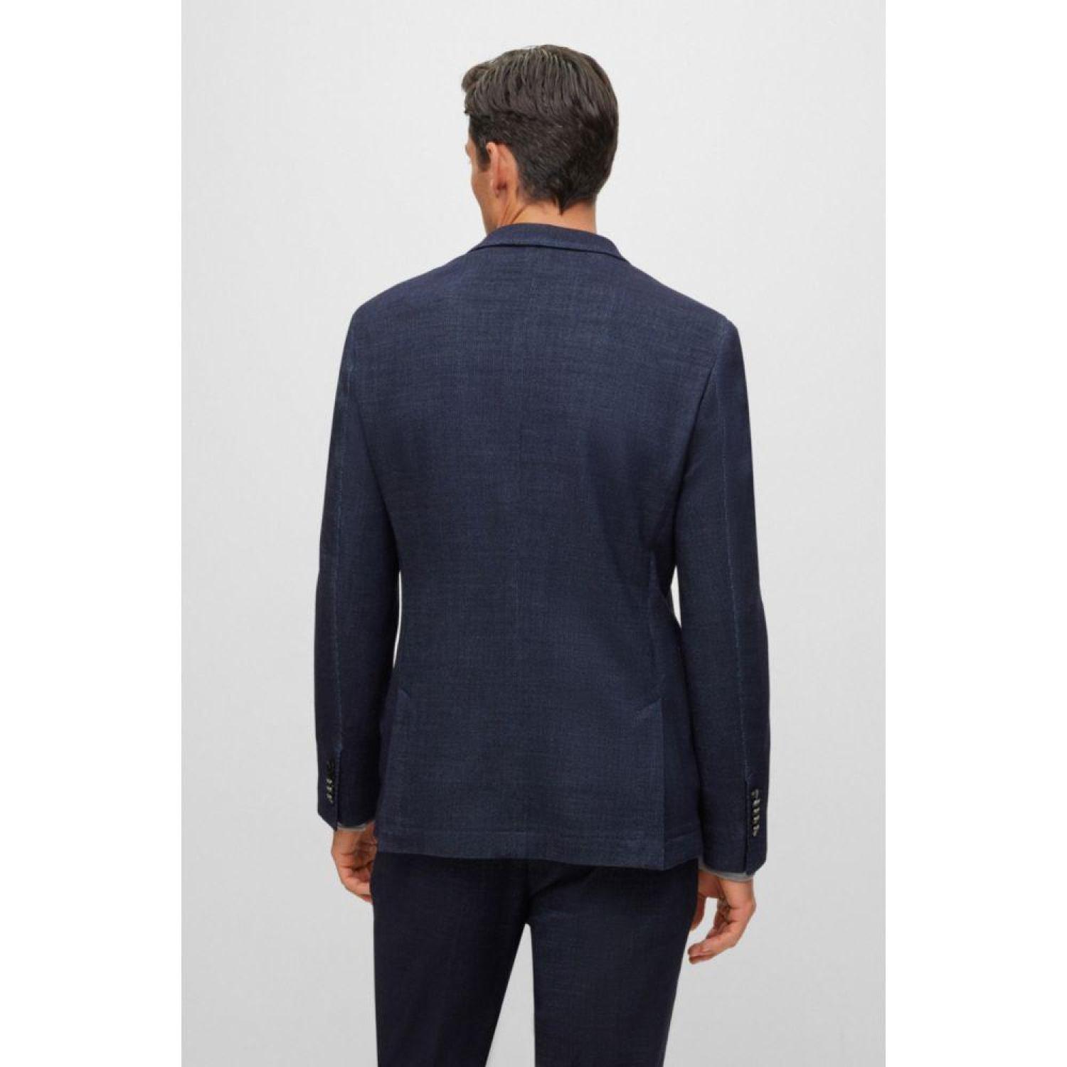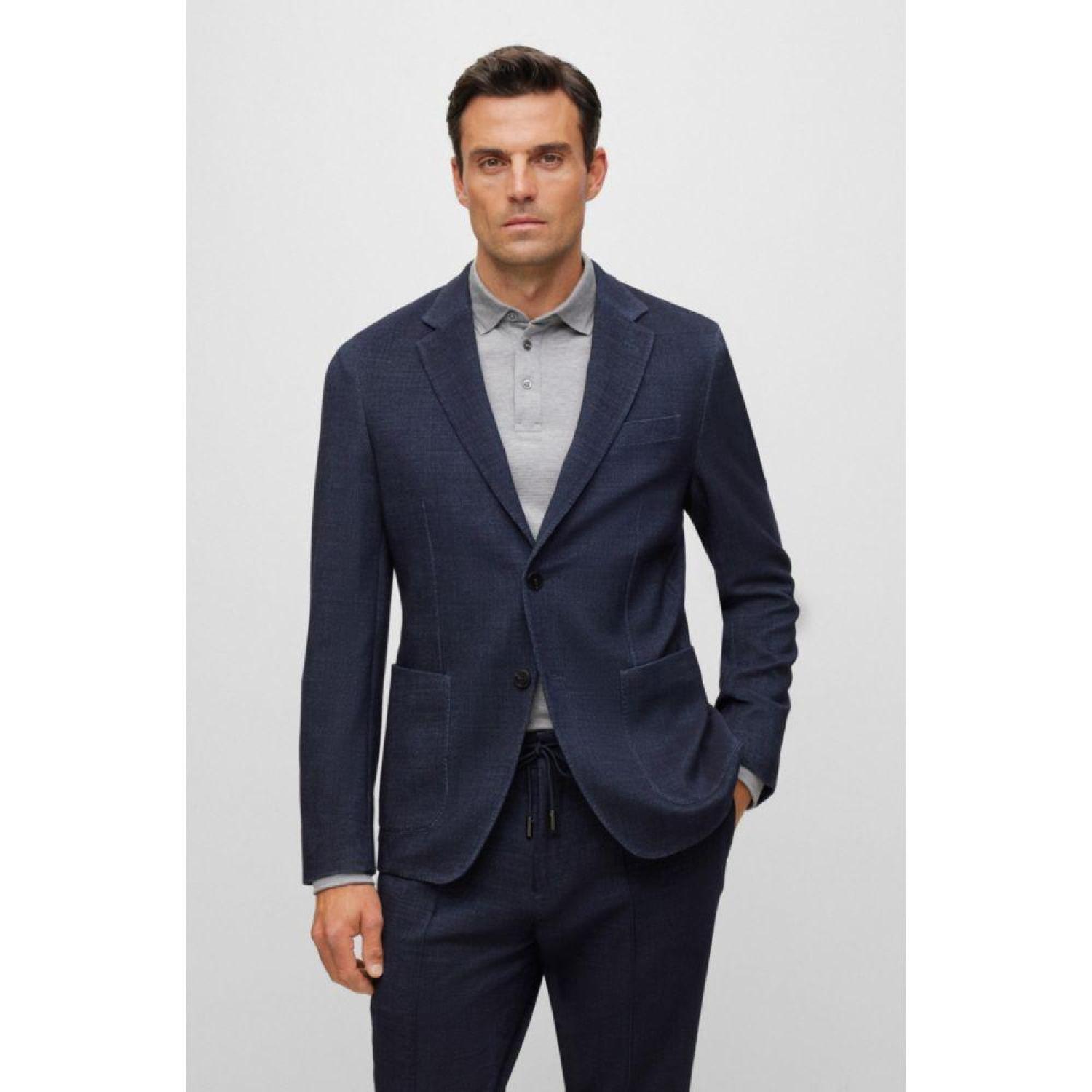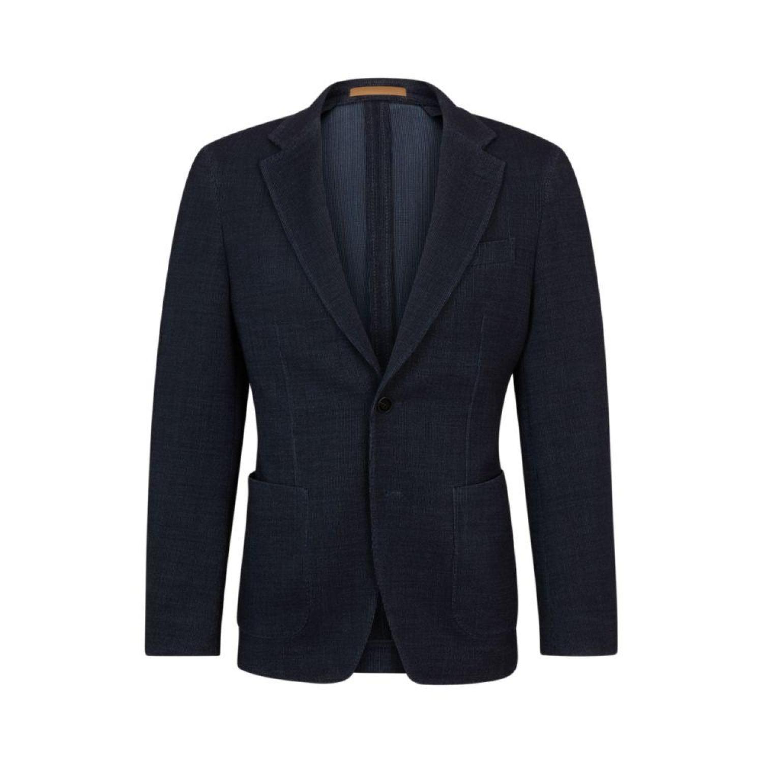 A micro-patterned jacket by BOSS Menswear, cut to a defined fit in a stretch blend with a hint of silk for a luxurious touch.For our RESPONSIBLE products we always use at least 60% more sustainable raw materials. This product is made with responsibly sourced and certified wool. For us, responsibly sourced means mulesing free, and meeting the standards of the Five Freedoms of animal welfare.